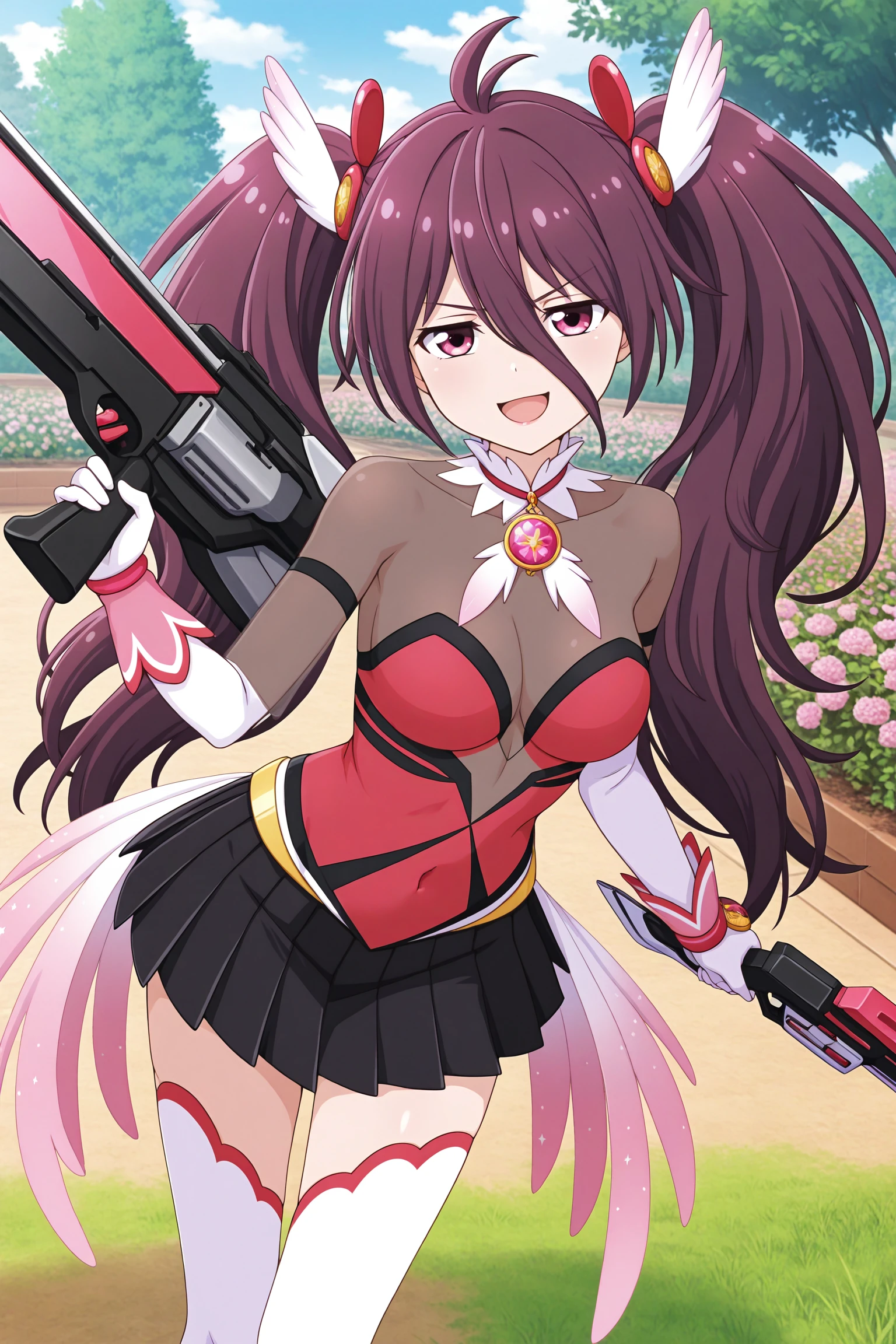 outfit3, magical girl, red hairtie, gem brooch, wing hair ornament, gem necklace, red bodysuit, see-through sleeves, see-through cleavage, white gloves, elbow gloves, covered navel, gold belt, black skirt, pleated skirt, white thighhighs