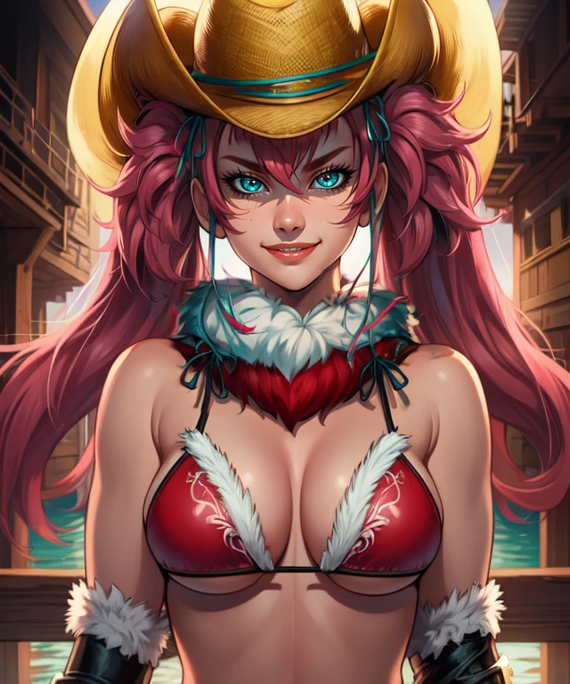 cowboy hat, thighhighs, red bikini, fur trim, ribbon, black gloves , belt,