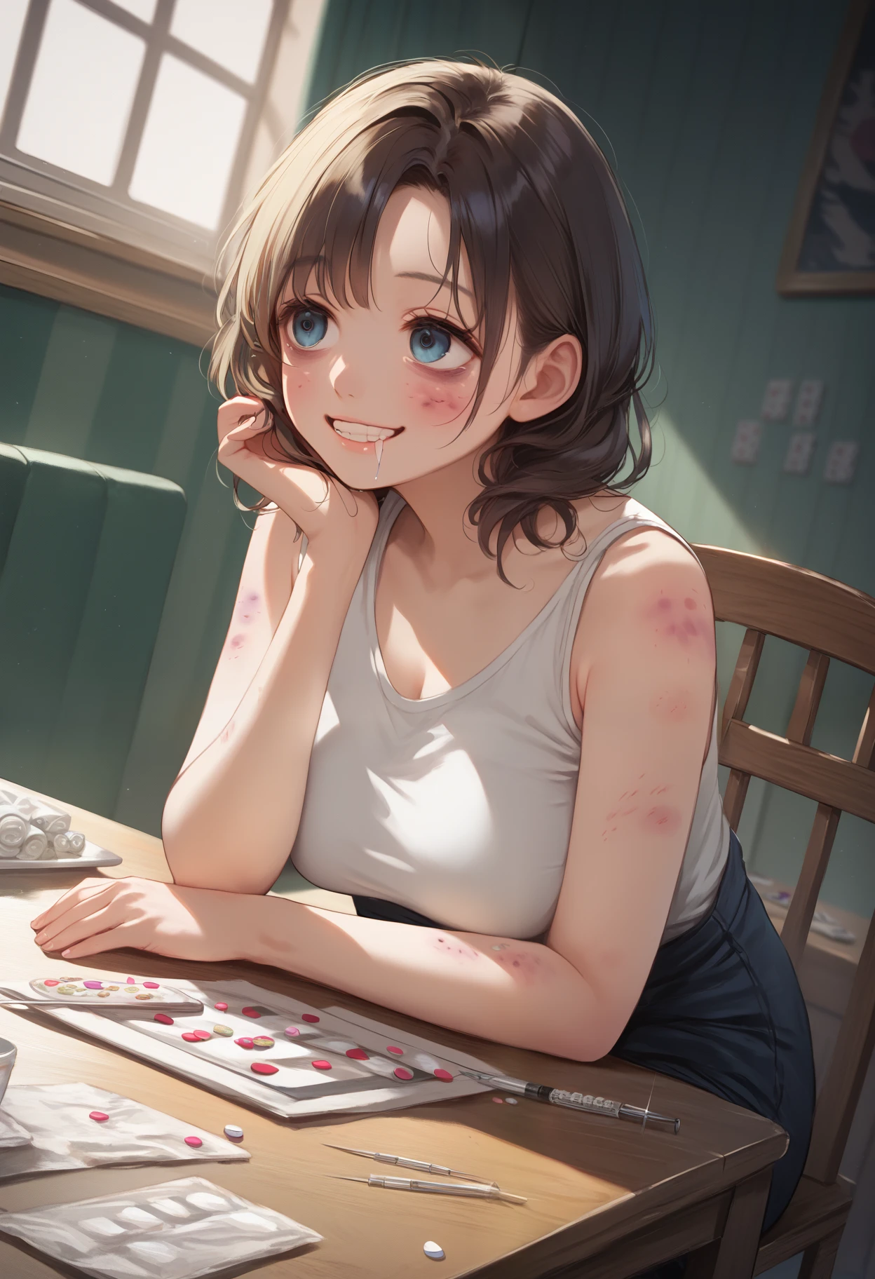 (drugged/ ????? / pill on tongue/ scattered ????? / needle mark)