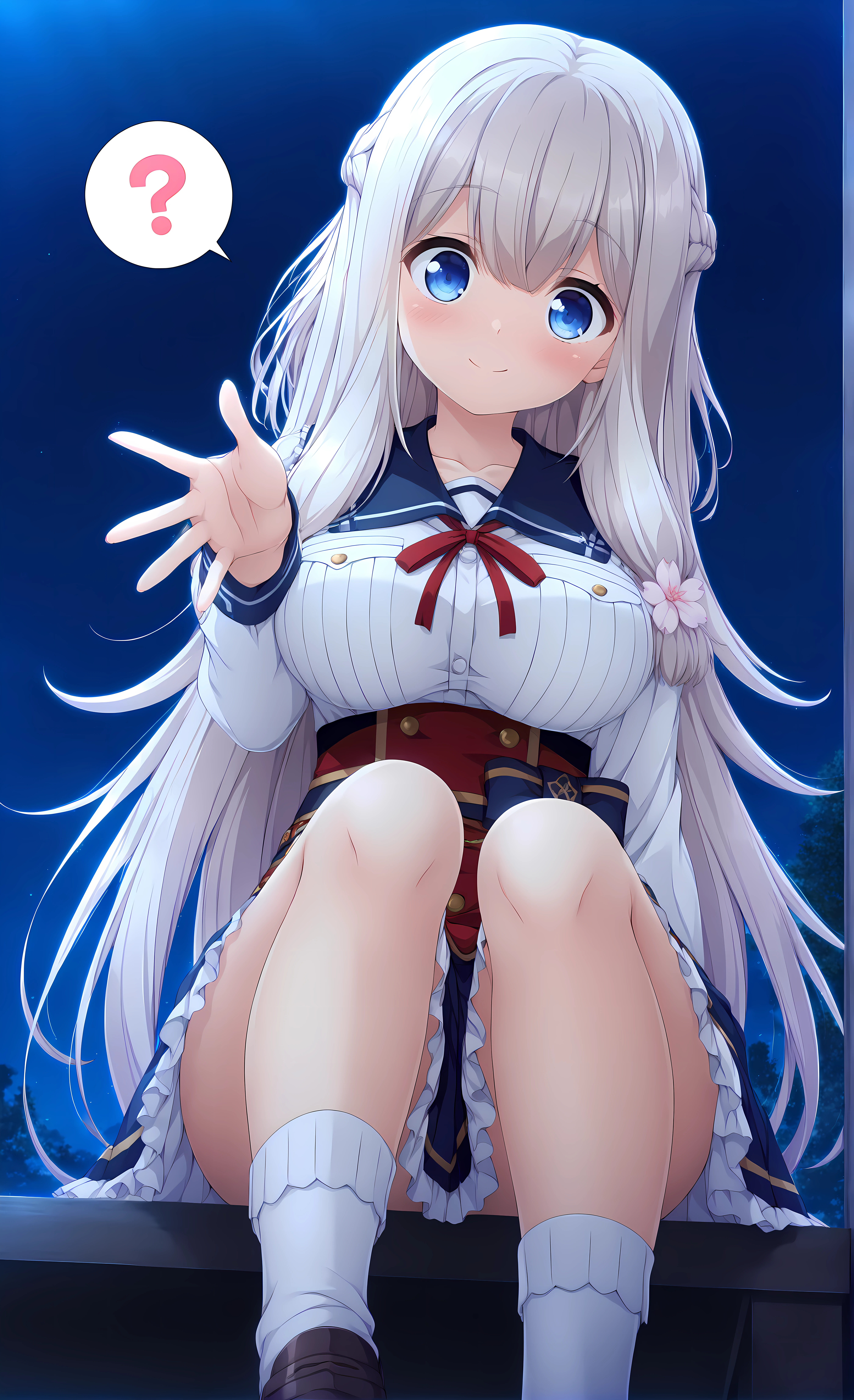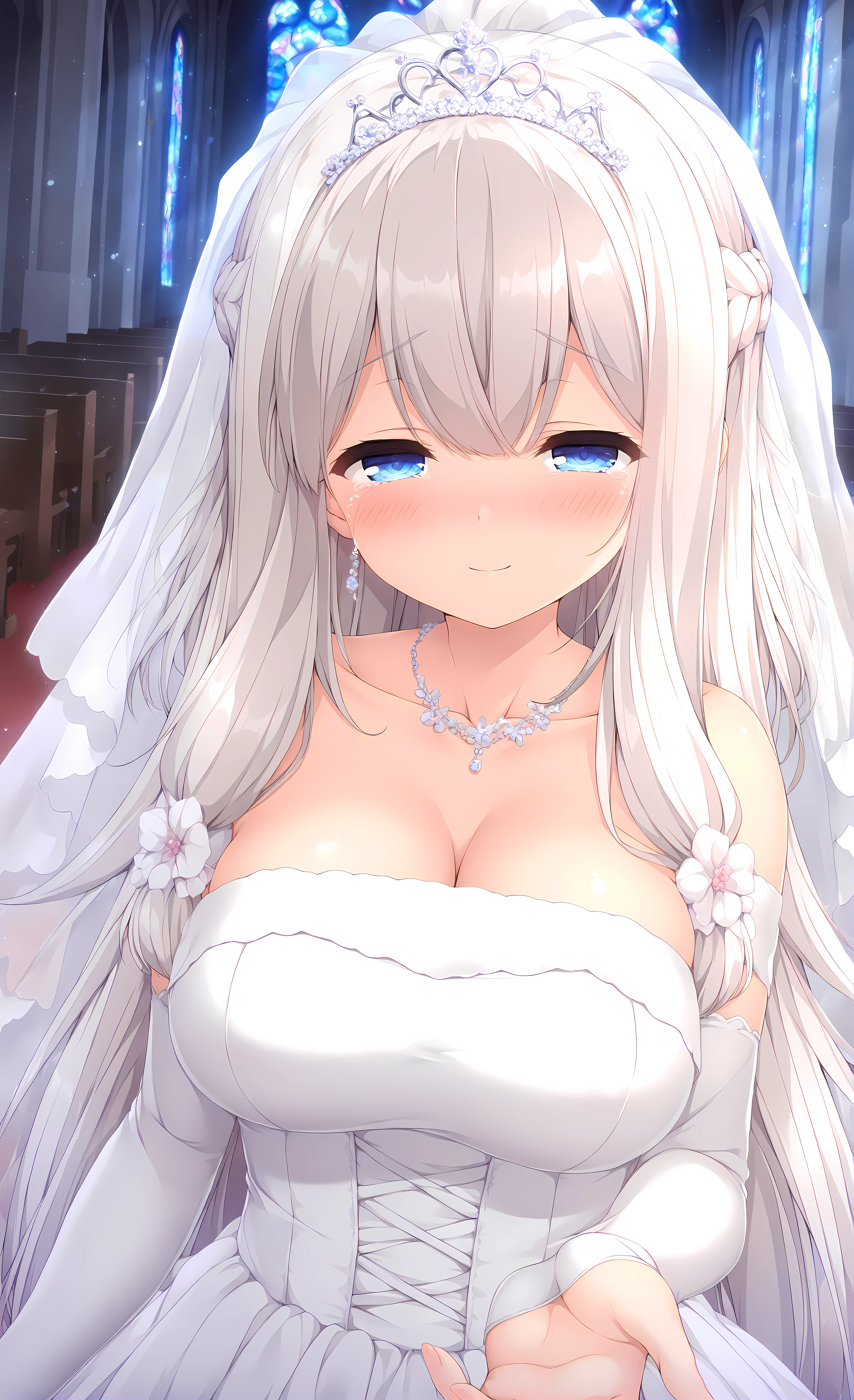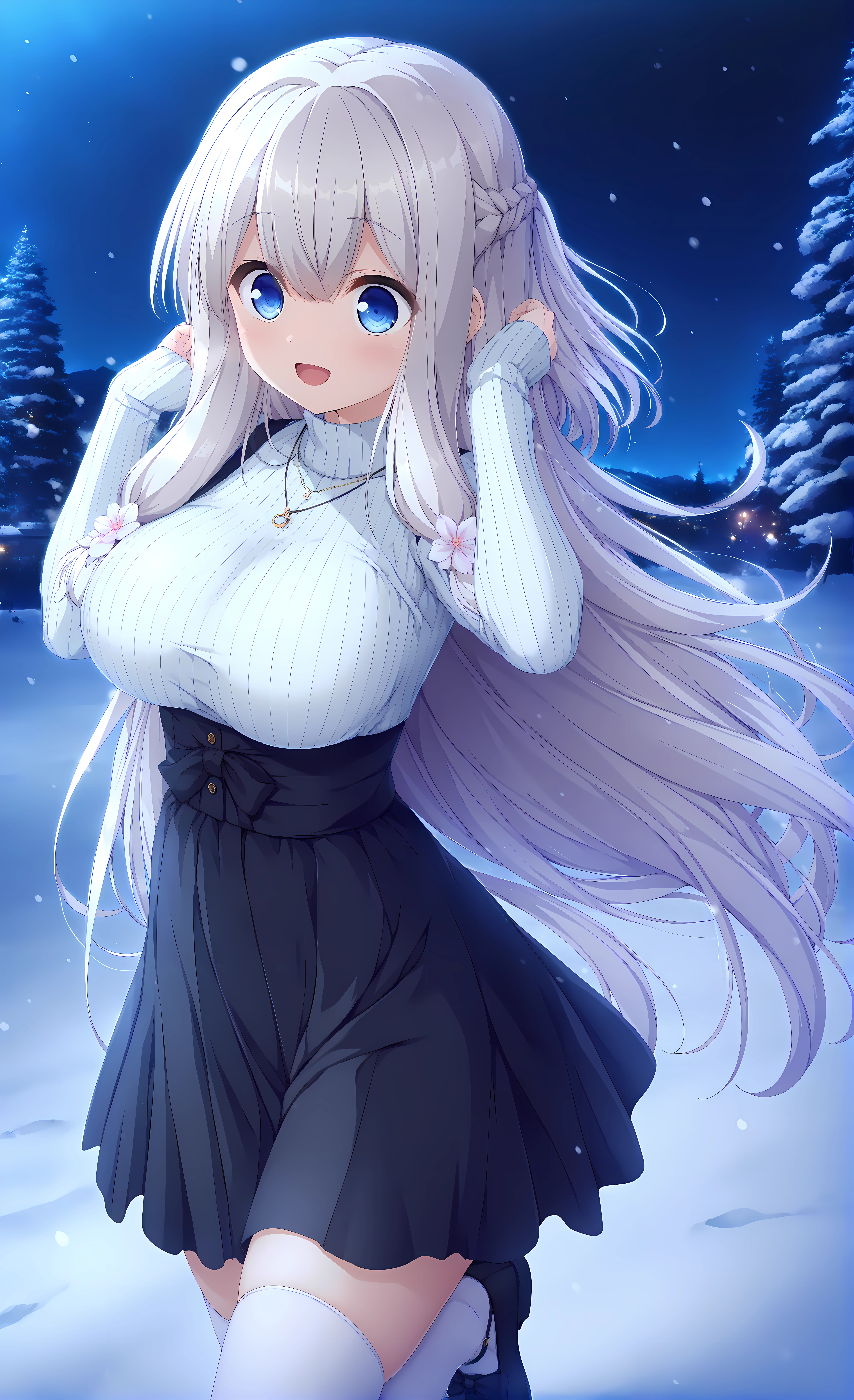 Base: yua, white hair, blue eyes, very long hair, hair flowers,bangs,braid,hair between eyes, large breasts,