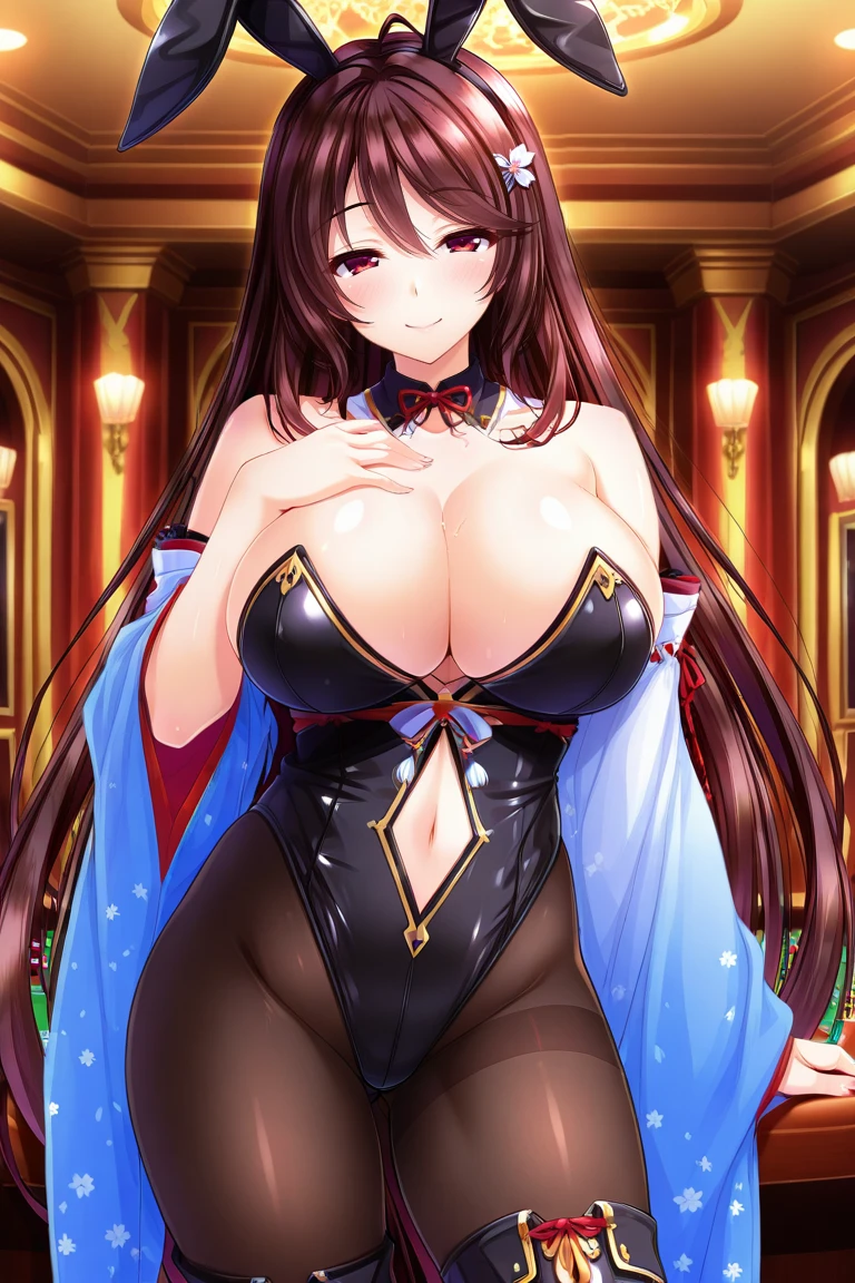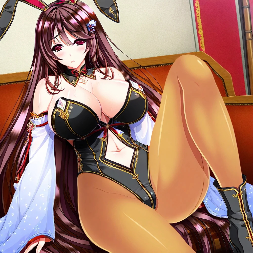 minamo-bunny, bunny suit, bunny ear headband, black leotard, gold detailing, bare shoulders, cleavage, detached sleeves, wide sleeves, detached collar, navel cutout, pantyhose, thighhigh boots, black boots,