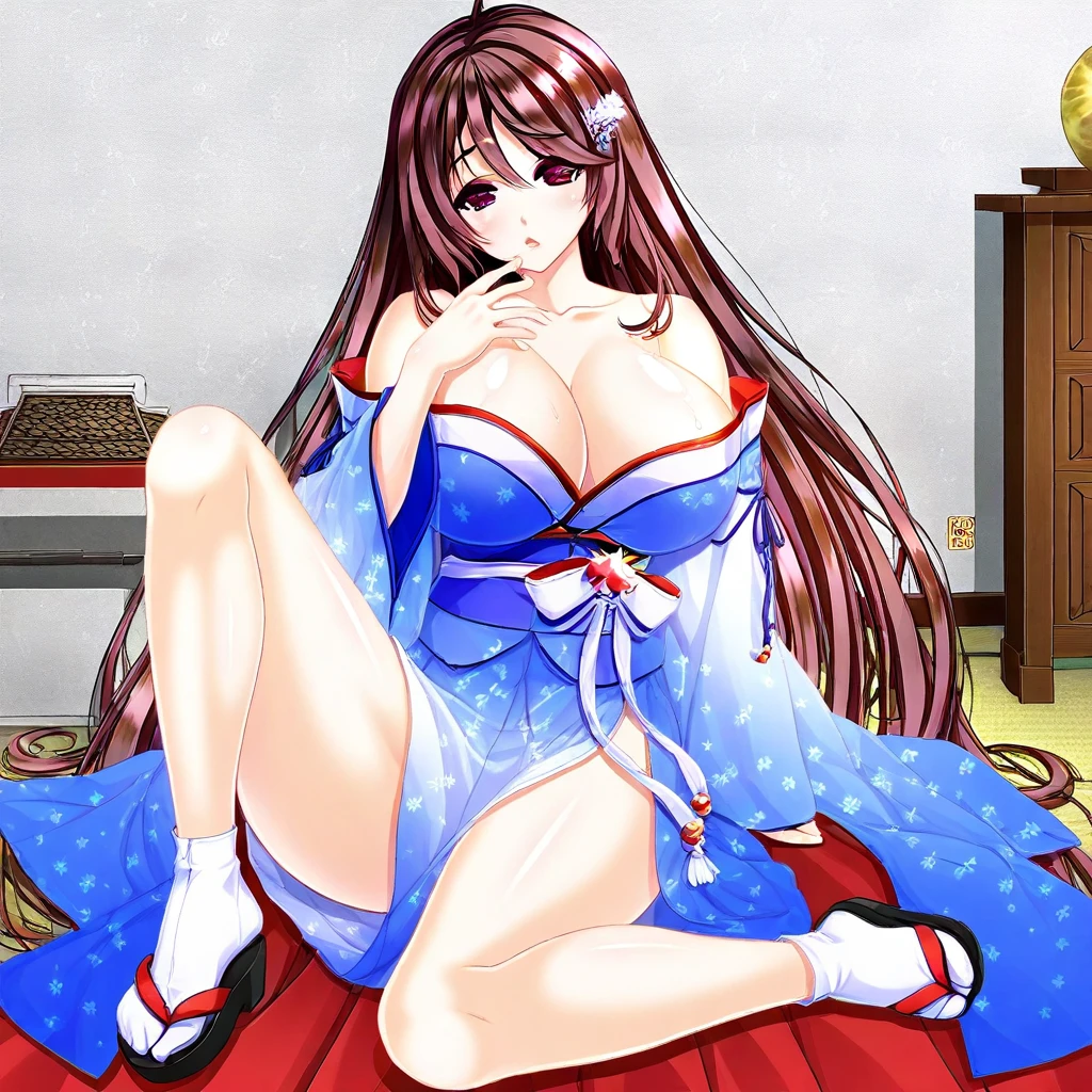 minamo-kimono, Japanese clothes, blue kimono, wide sleeves, off shoulder, cleavage, blue obi, floral, tabi, sandals,