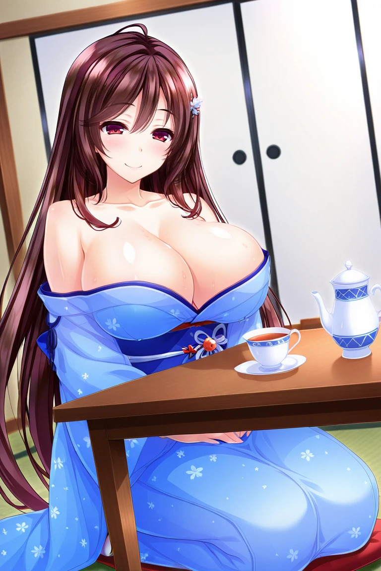 brown hair, very long hair, bangs, hair between eyes, hair ornament, red eyes, large breasts,