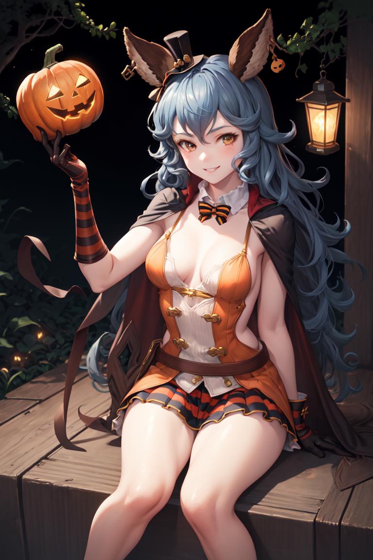 "Ferry, long hair, FerryHalloween, orange dress, white shirt, striped skirt, gloves, top hat, earrings, cape"