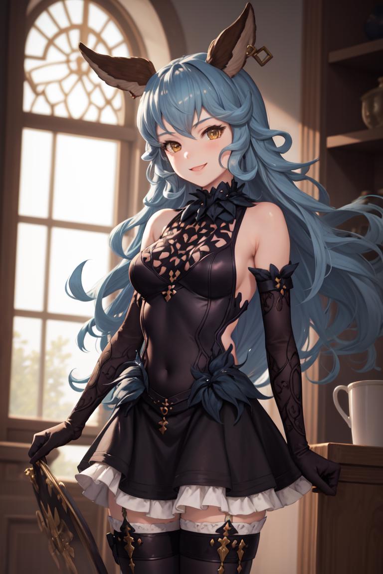"Ferry, long hair, FerryGrand, thighhighs, elbow gloves, black dress, earrings"