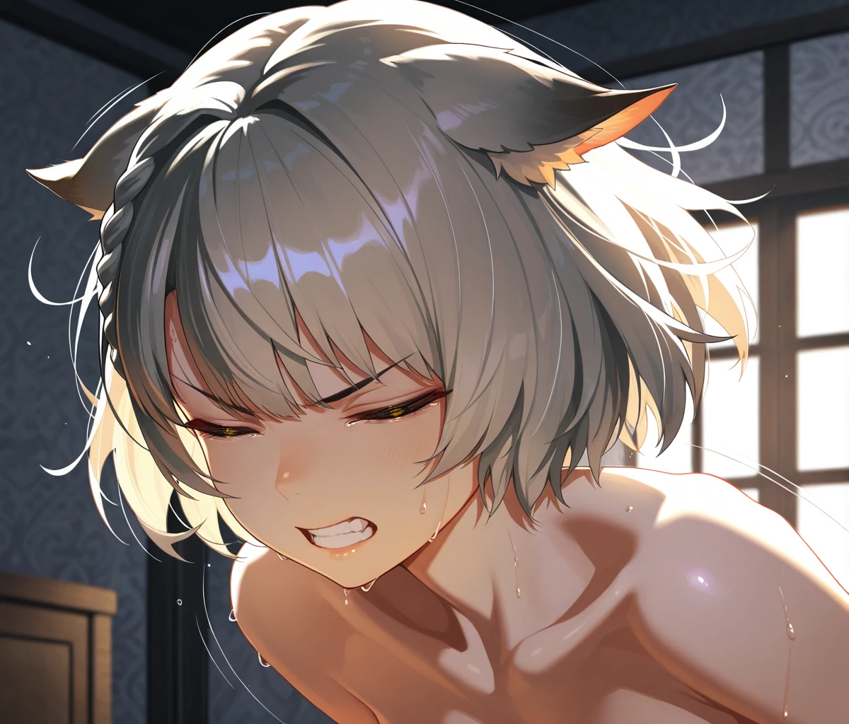 yellow eyes, short hair, white hair, gray hair, small breasts, hair between eyes, cat ears, animal ear fluff,, cat girl
