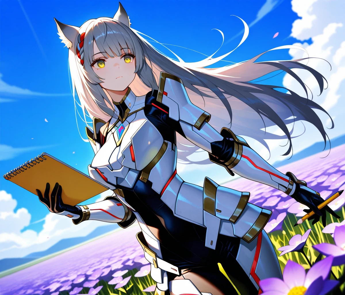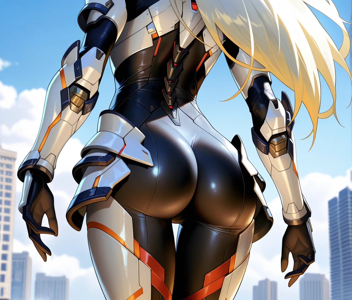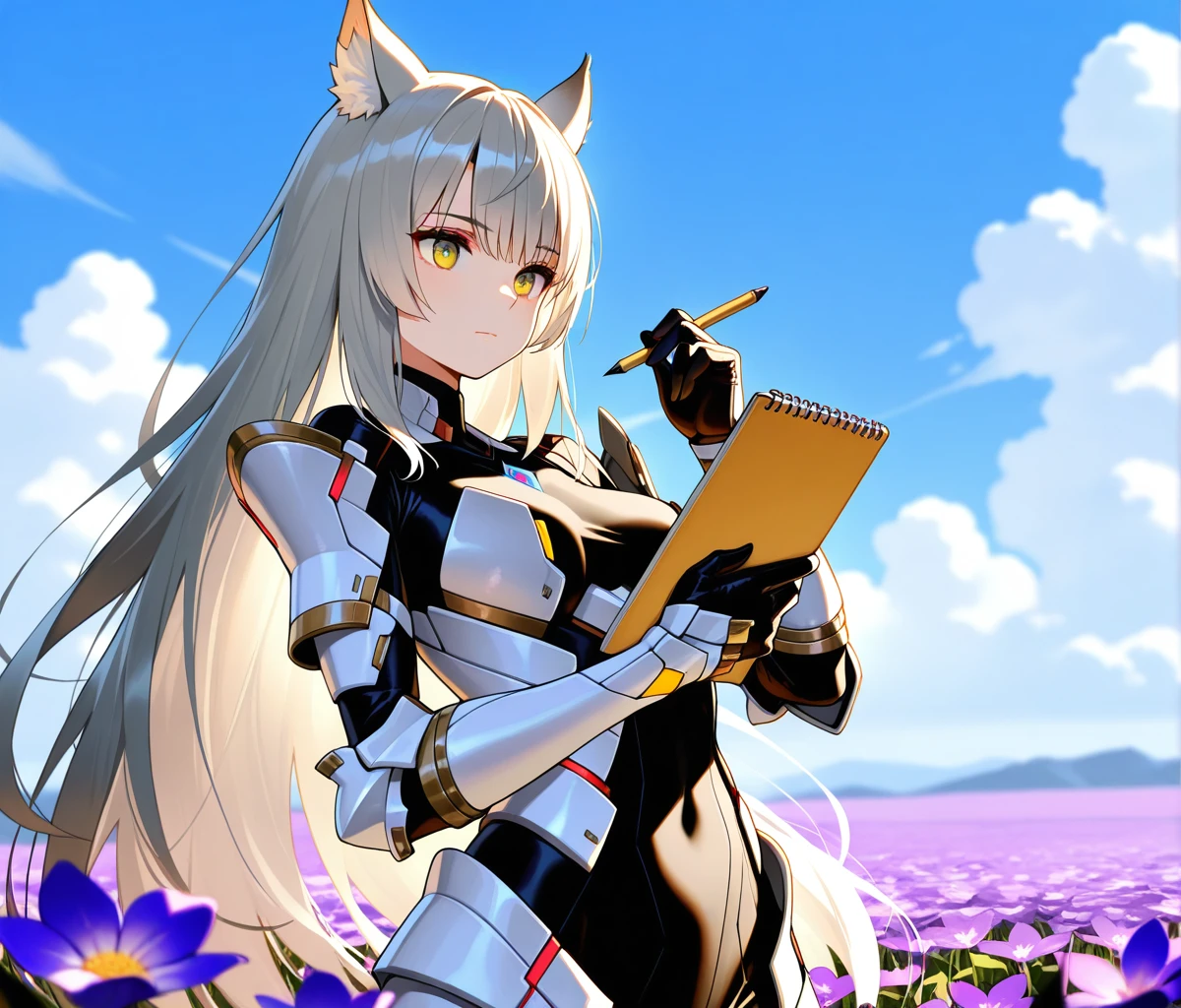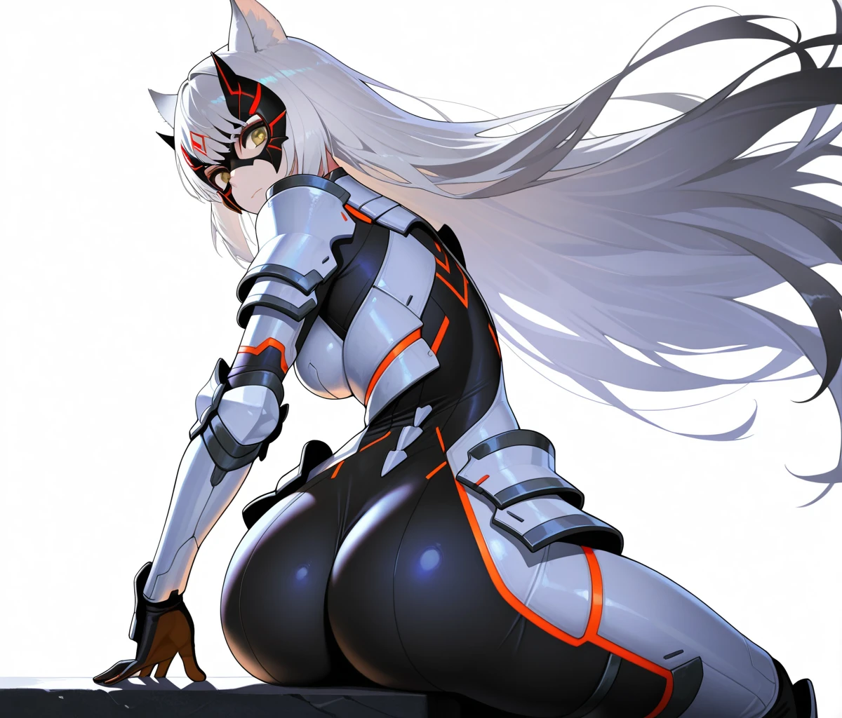 Ouroboros Form: m1o-ouro, very long hair, medium breasts, animal ears, white hair, light purple hair, orange eyes, mask, helmet, robot girl, colored sclera, android, mecha musume, red sclera, humanoid robot, tokusatsu, mechanical ears, yellow eyes, armor, bodysuit