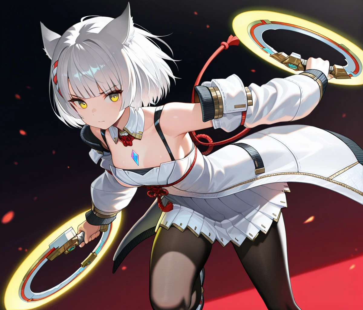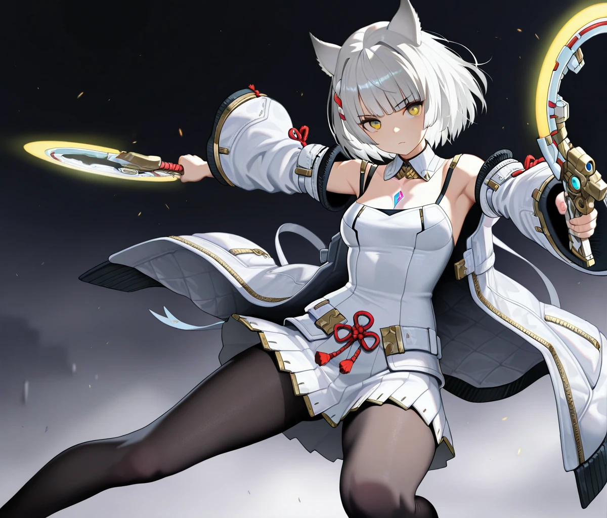 Outfit 2: yellow eyes, short hair, white hair, gray hair, small breasts, hair between eyes, cat ears, animal ear fluff,, cat girl, chest jewel, white skirt, black pantyhose, white coat, detached sleeves, bare shoulders, detached collar