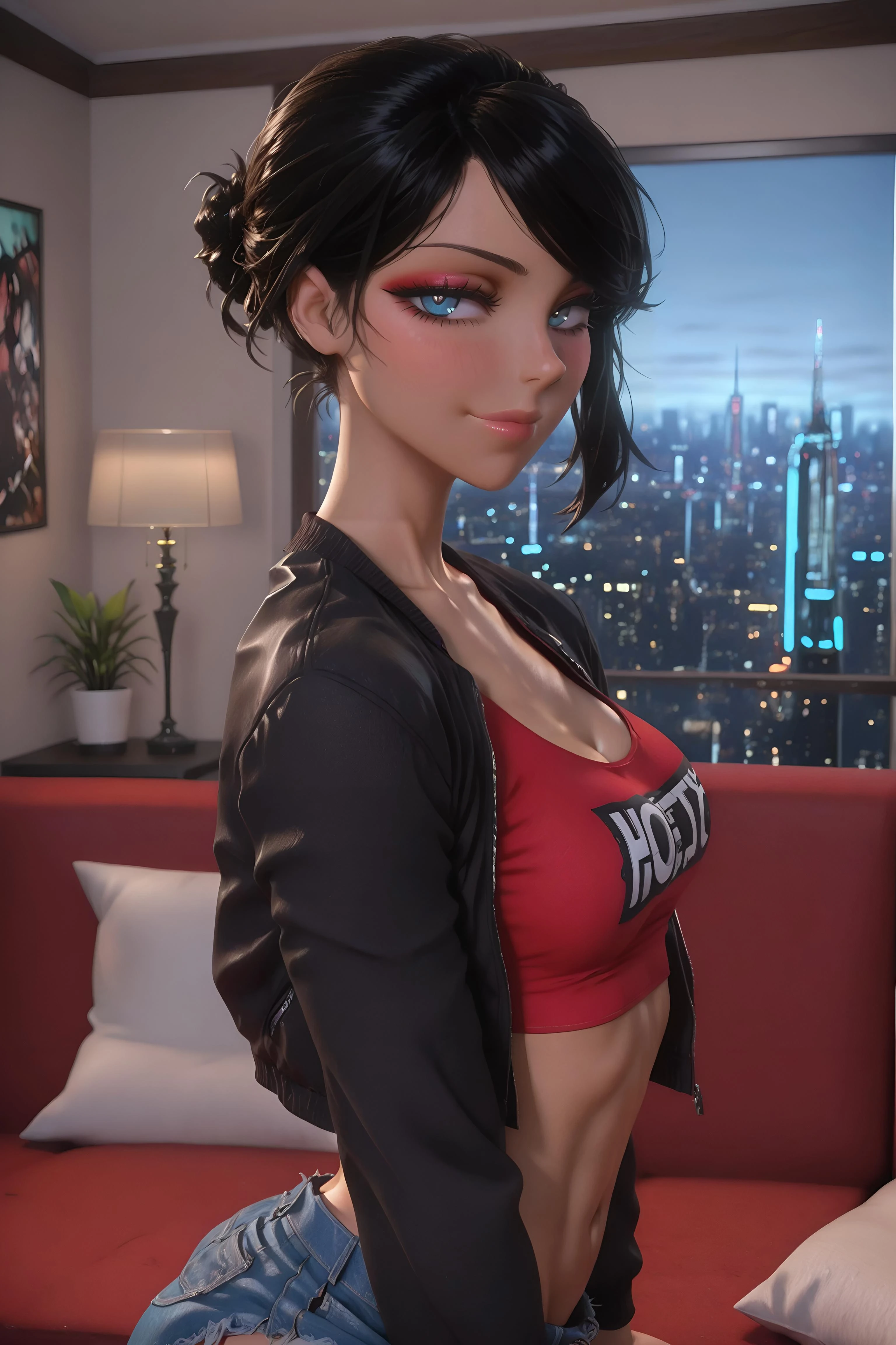 Delizia_ByMrJohn, light skin tone, smooth skin, Blue eyes, black hair, short length hair, side-swept bangs, loose updo, hair pulled back, subtle hair strands, natural makeup, glossy lips, defined eyebrows, attractive figure, slim thick body, curvy waist, toned stomach, slim body, large breasts