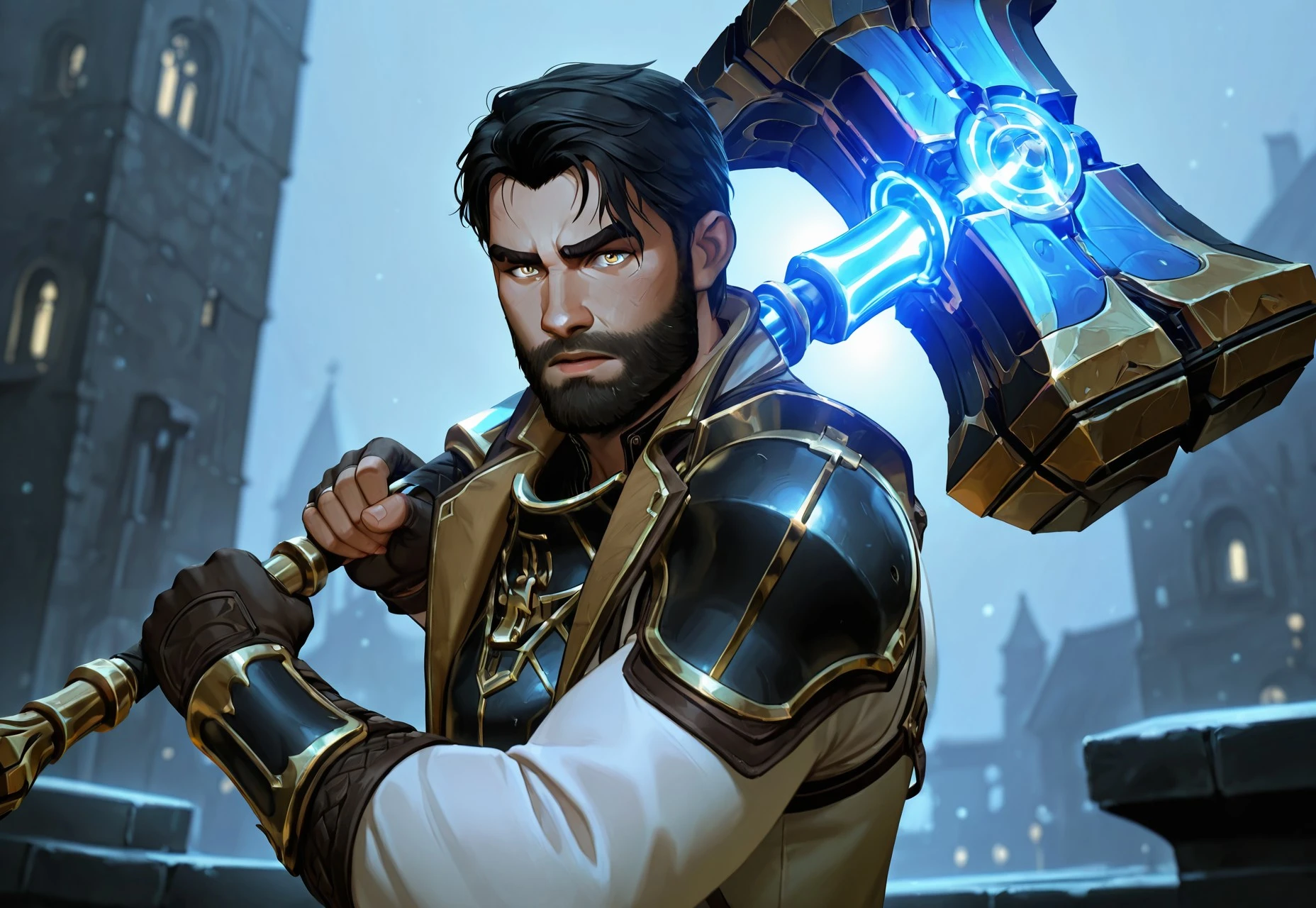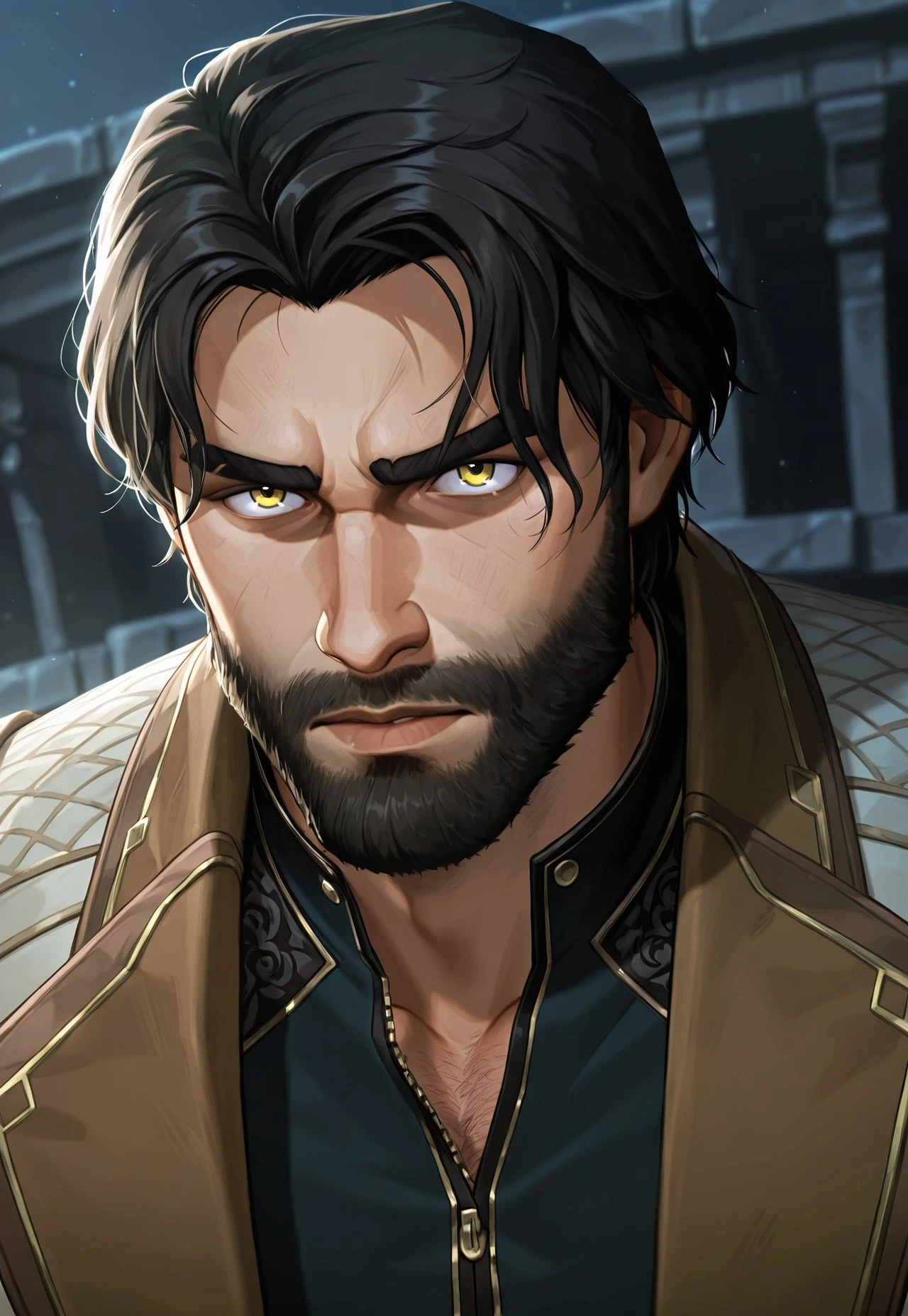 J4ycearc, 1boy, solo, male focus, dark skin, dark-skinned male, black hair, medium hair, facial hair, beard, yellow eyes, jacket, armor,