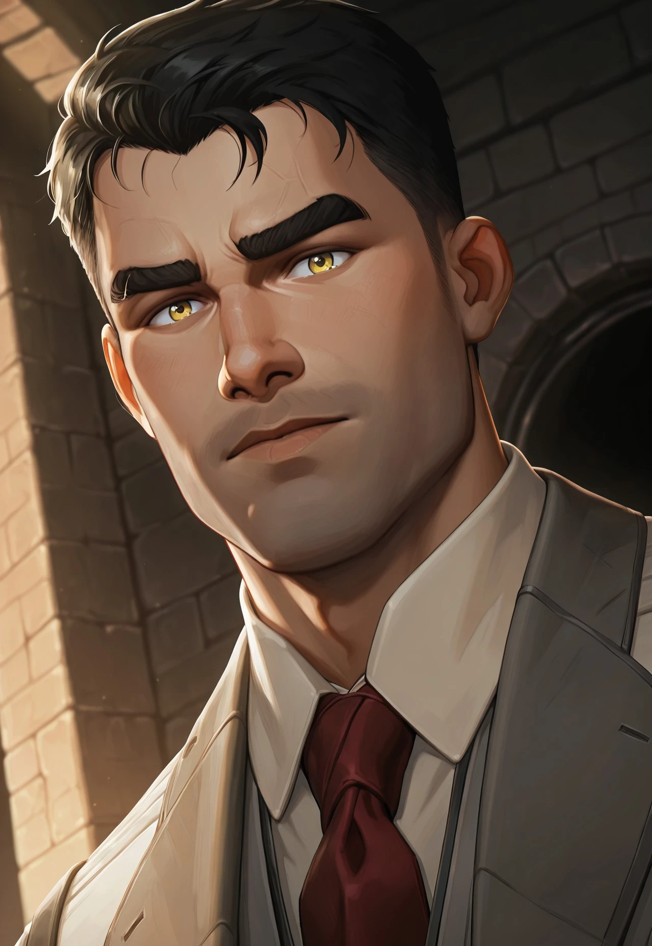 J4ycearc, 1boy, solo, male focus, yellow eyes, black hair, short hair, facial hair, stubble, formal, suit, collares shirt, necktie, vest,