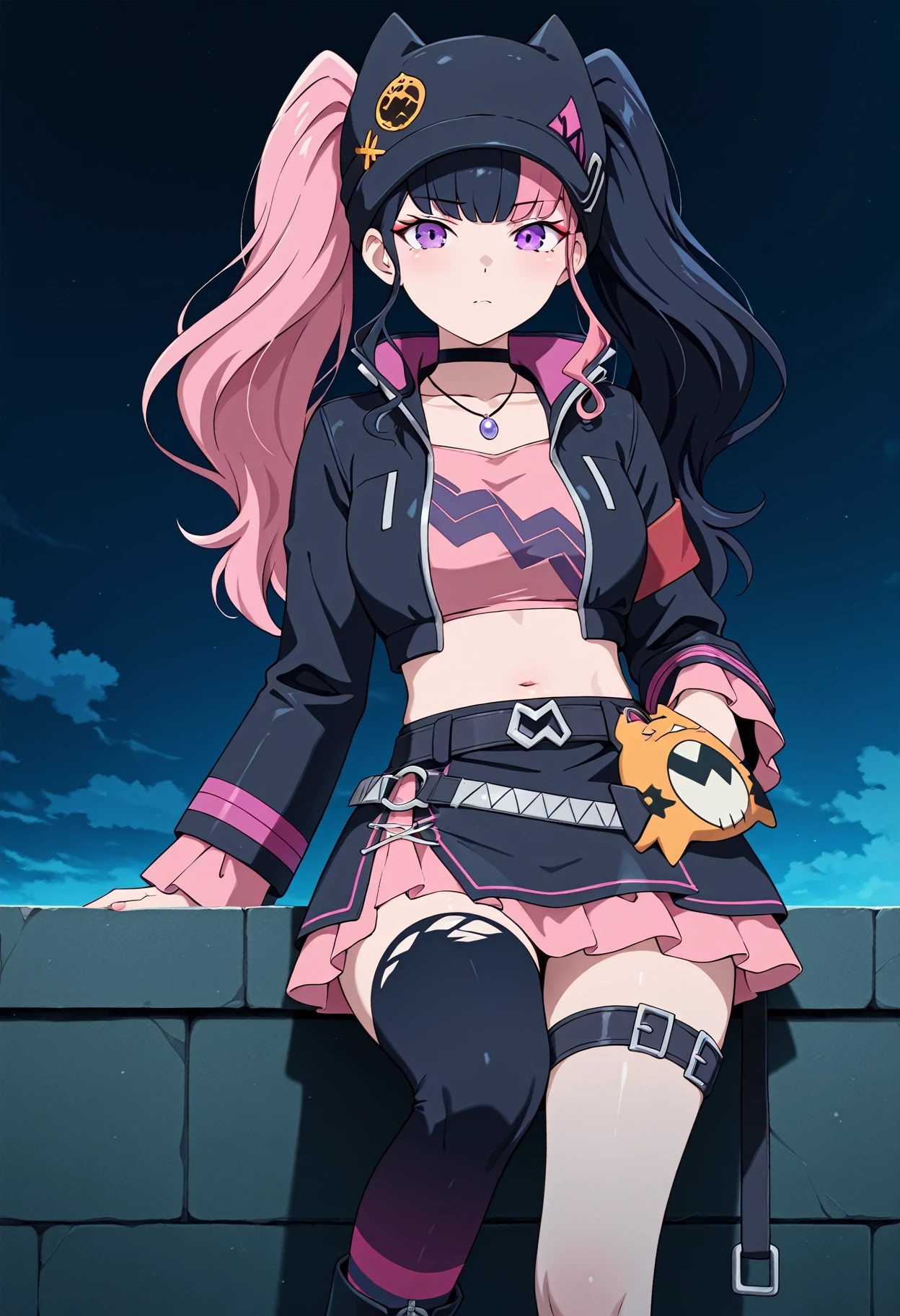 zoe rayn,hat, multicolored hair, black hair, pink hair,twintails, purple eyes, choker, necklace,black jacket, crop top, belt, pink skirt, asymmetrical legwear, boots