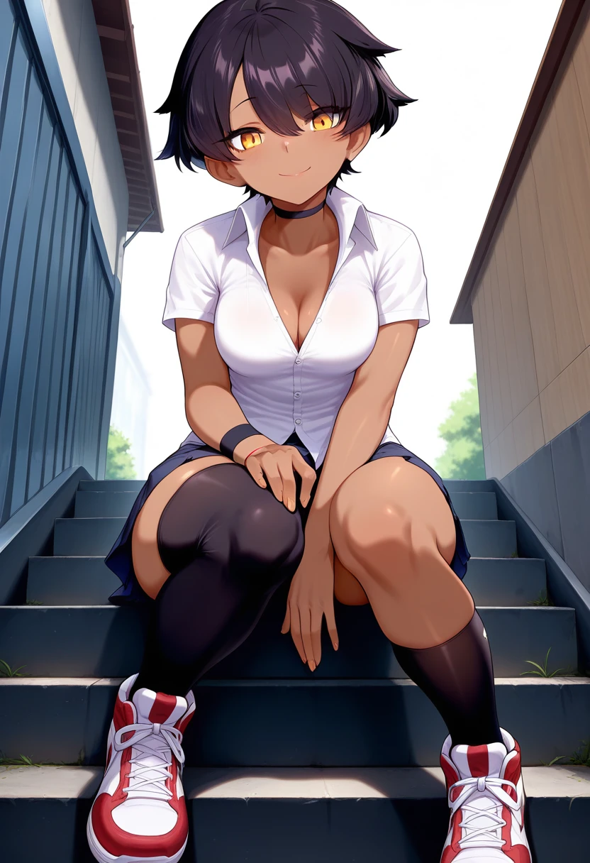 school uniform, black choker, ???????, cleavage, white collared shirt, untucked shirt, short sleeves, single wristband, pleated skirt, miniskirt, asymmetrical legwear, kneehighs, single thighhigh, sneakers,