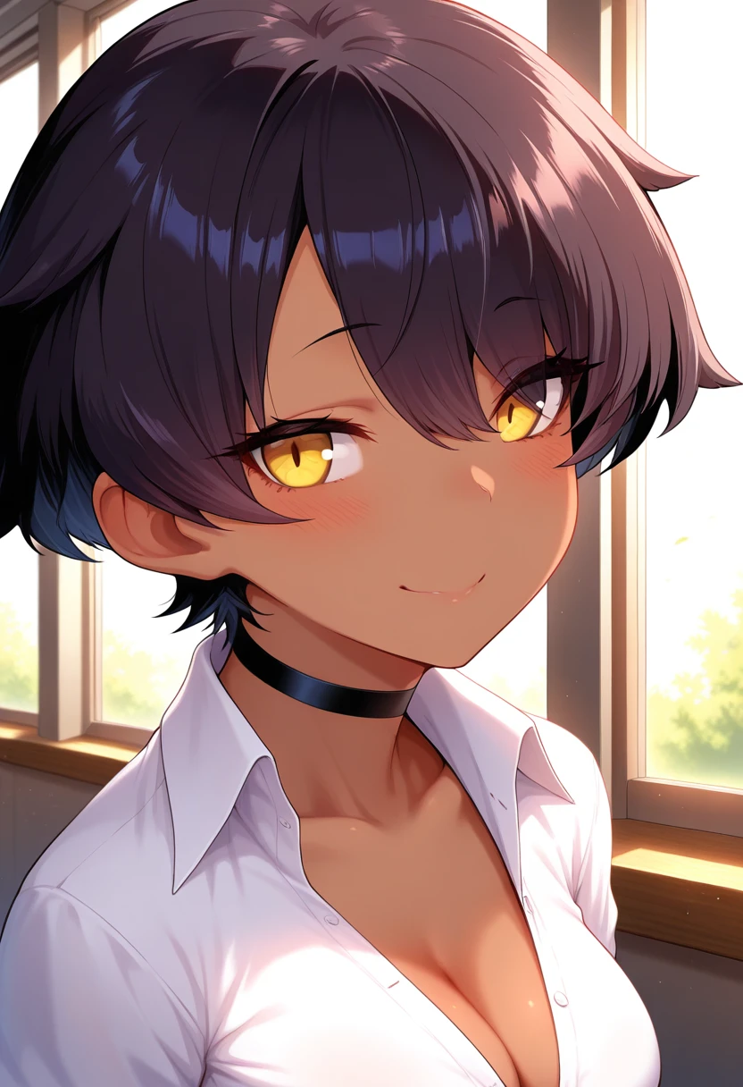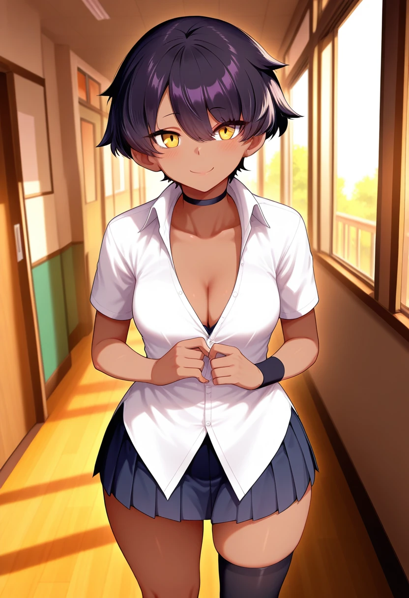 linww, tomboy, petite, dark skin, dark-skinned female, yellow eyes, black hair, short hair, asymmetrical bangs, medium breasts,