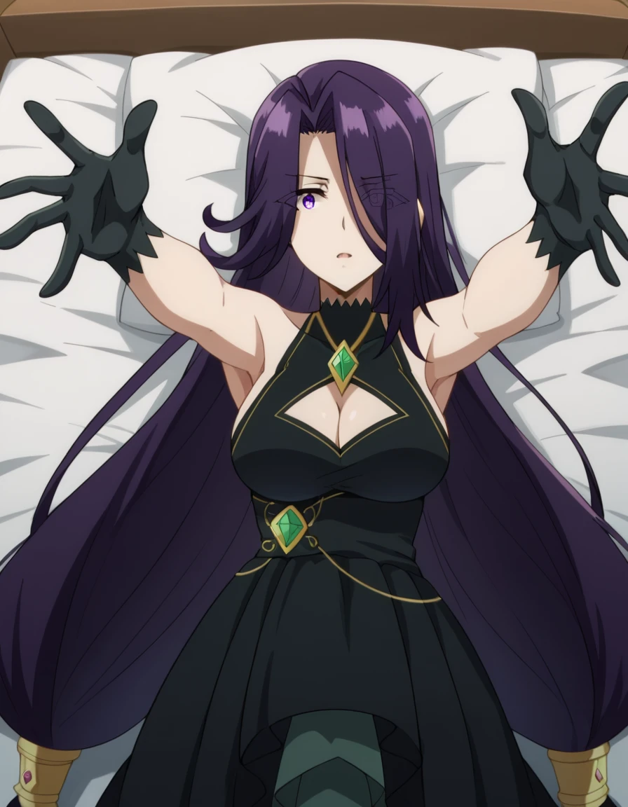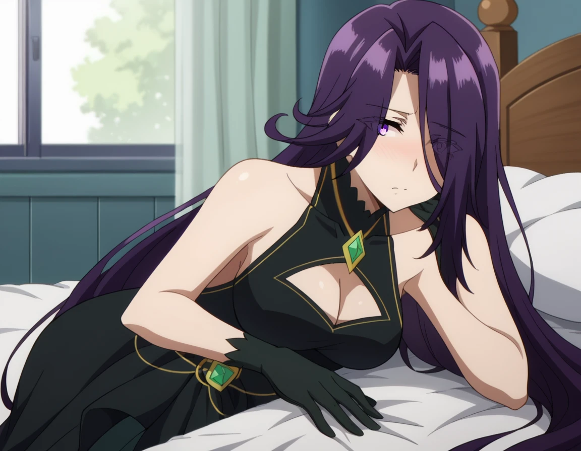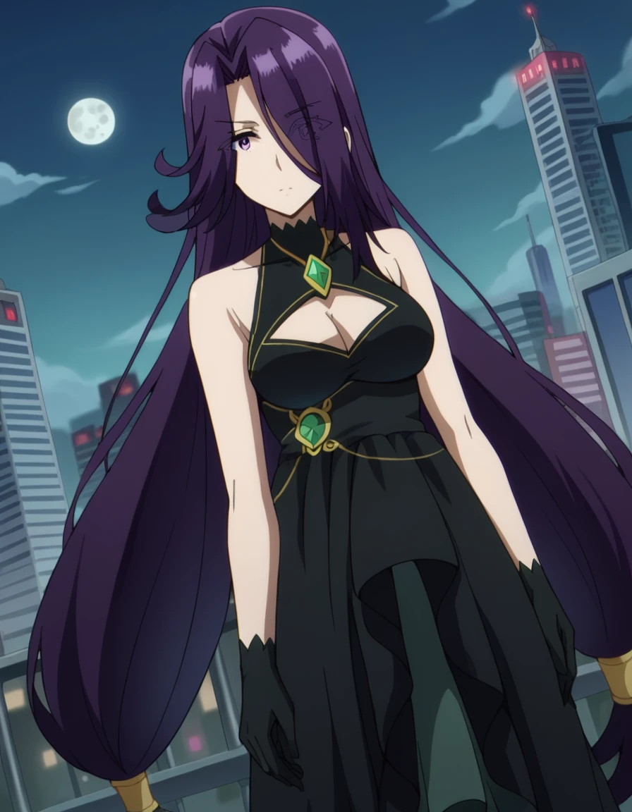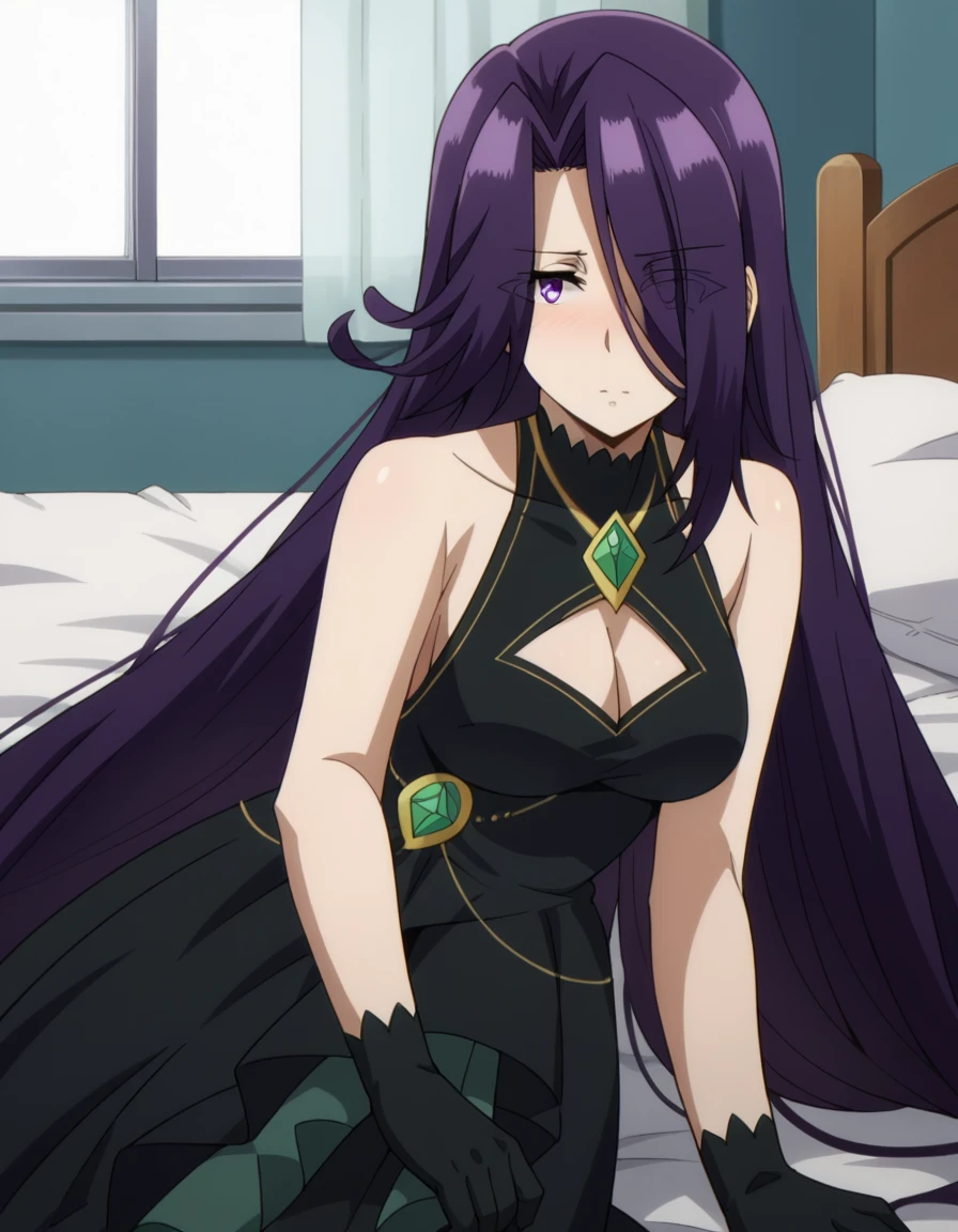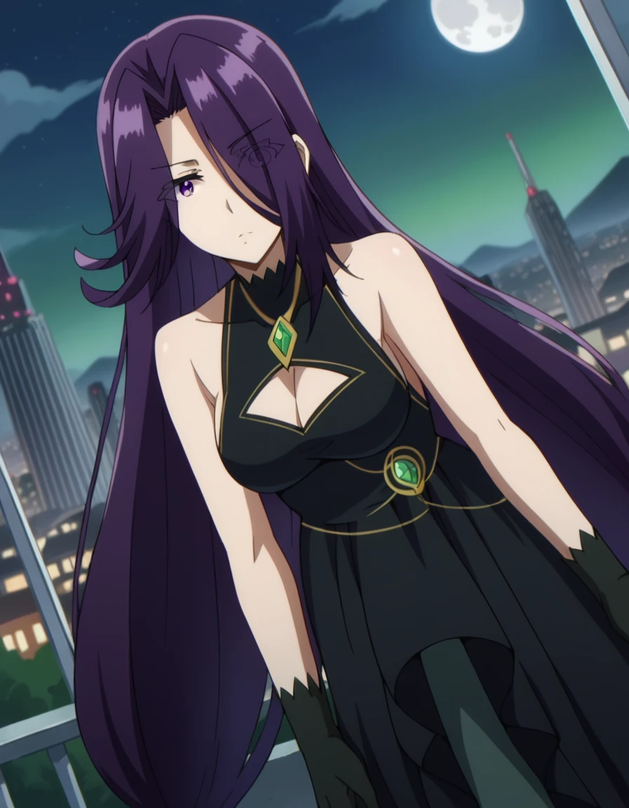 aurora, long hair, purple hair, very long hair, purple eyes, hair over one eye, eyes visible through hair,