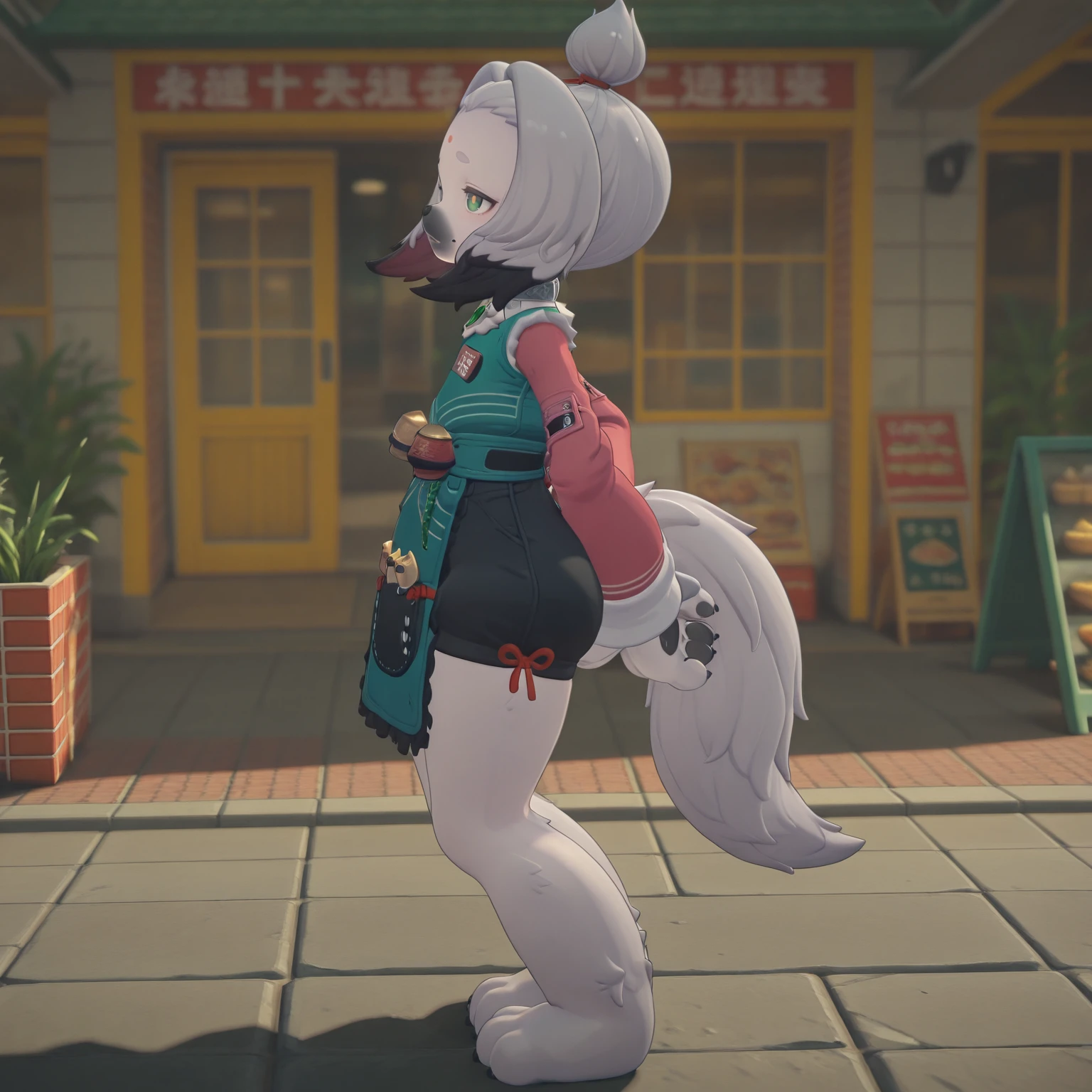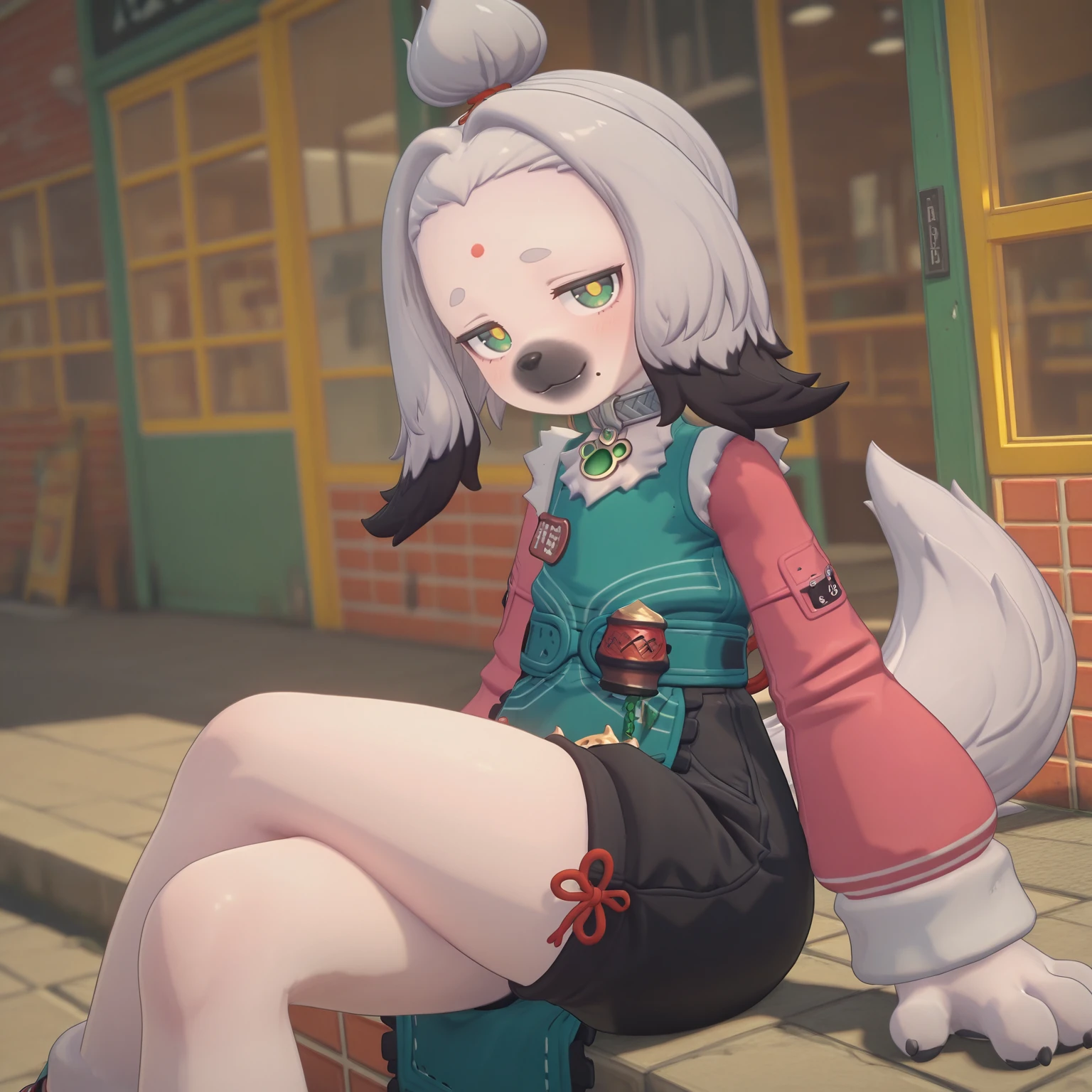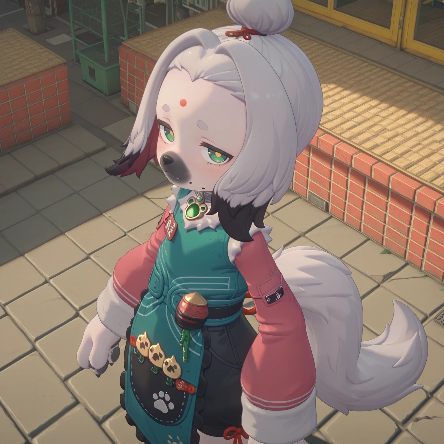 1girl, female, furry, anthro, dog, solo, white fur, short hair, black highlights, topknot, green eyes, yellow pupils, grey short eyebrows, black nose, grey muzzle, red dot on forehead, mole, pawpads, tail