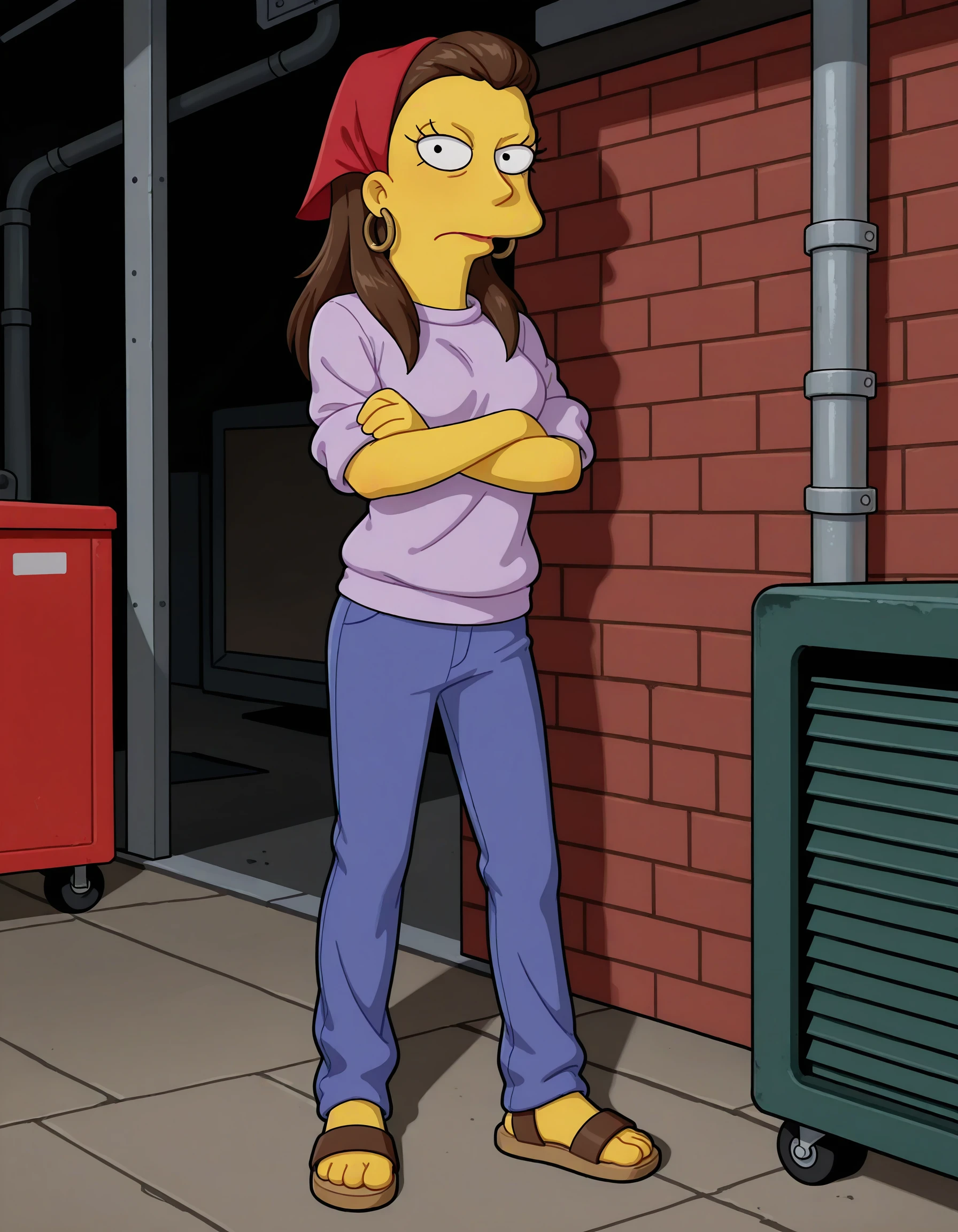 Add-ons 1: 1girl, solo, yellow skin, brown hair, long hair, red bandana, hoop earrings, violet sweater, sleeves rolled up, blue pants, sandals