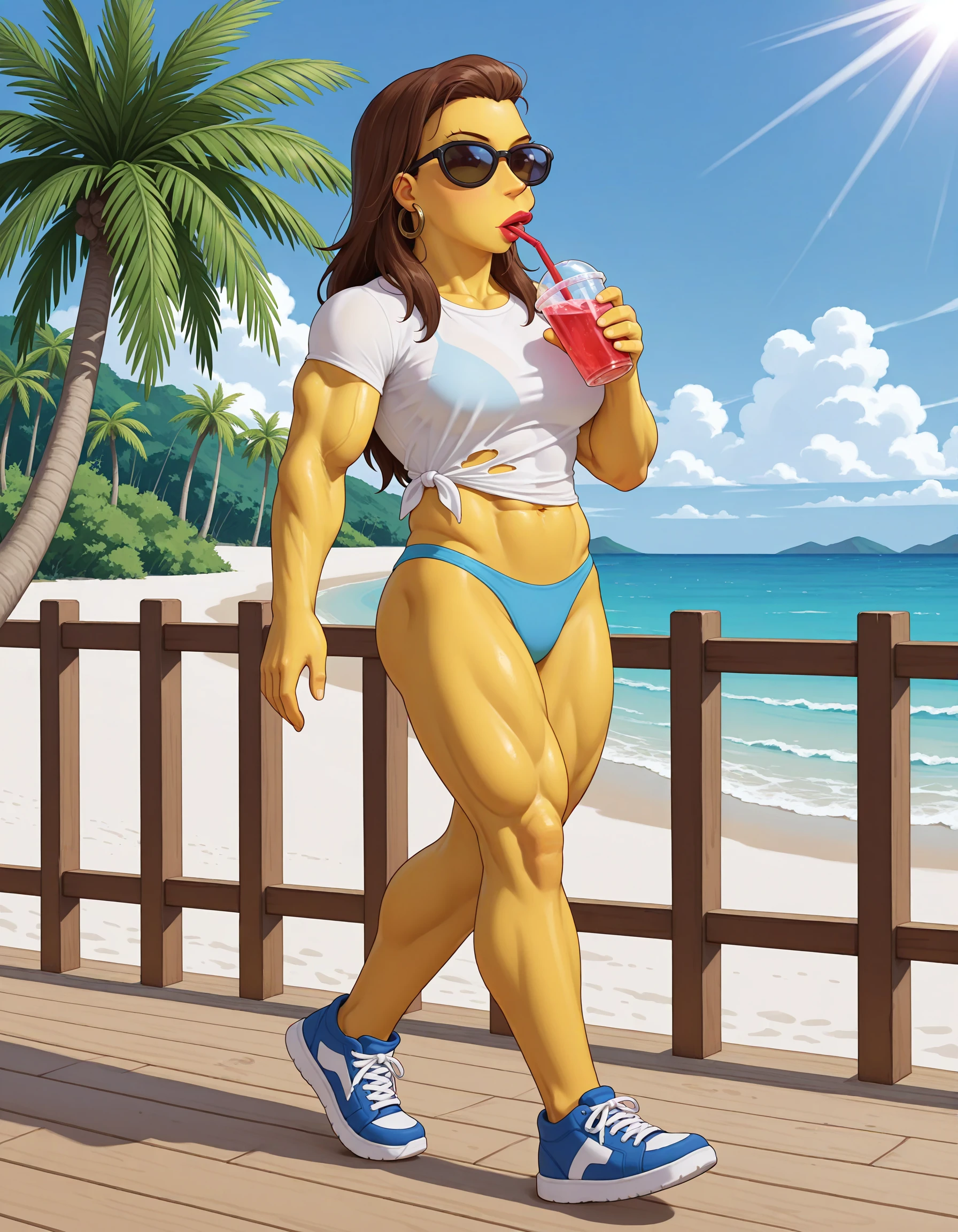 Add-ons 2: 1girl, solo, yellow skin, muscular female, brown hair, long hair, red bandana, hoop earrings, blue bikini