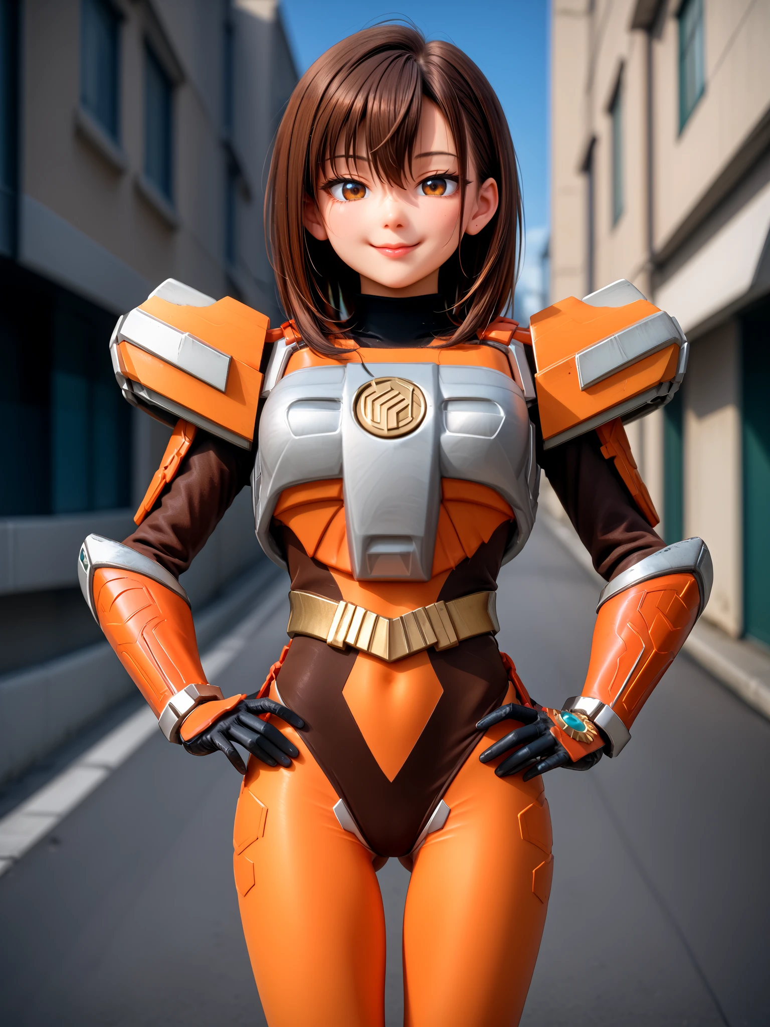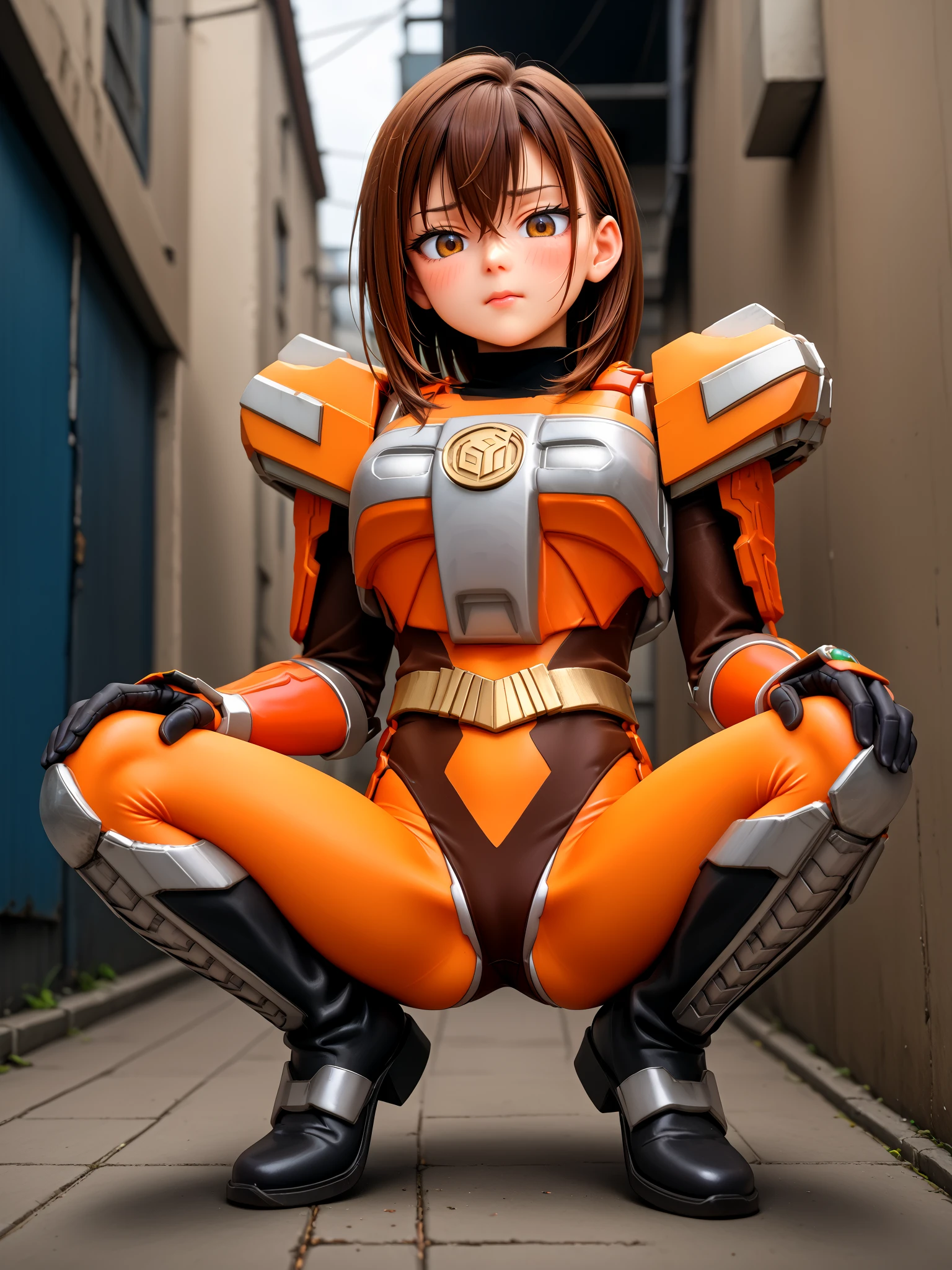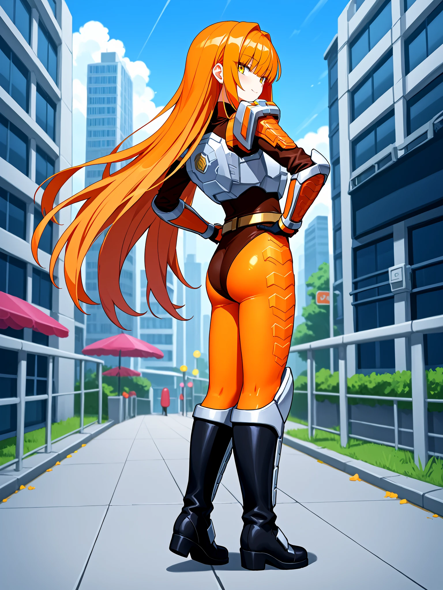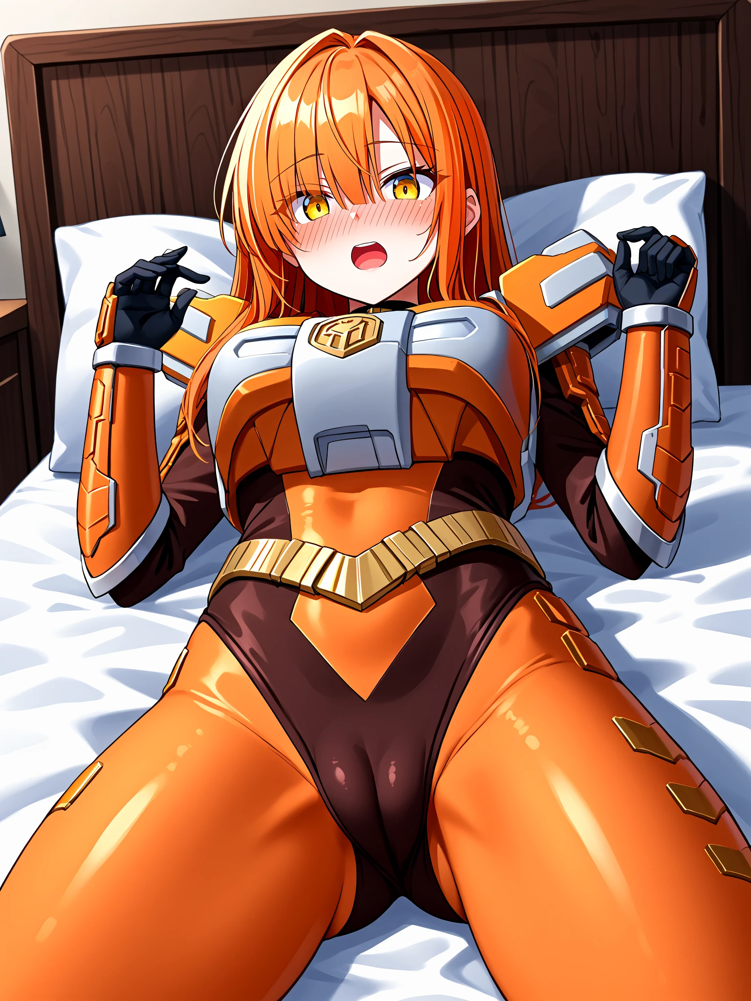 sazervisuel, orange bodysuit, brown leotard, belt, armor, gauntlets, black gloves