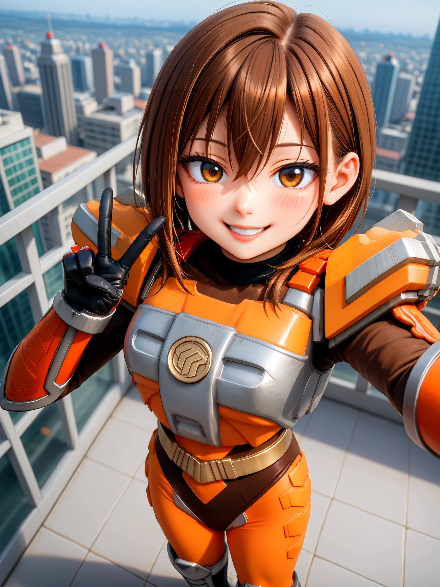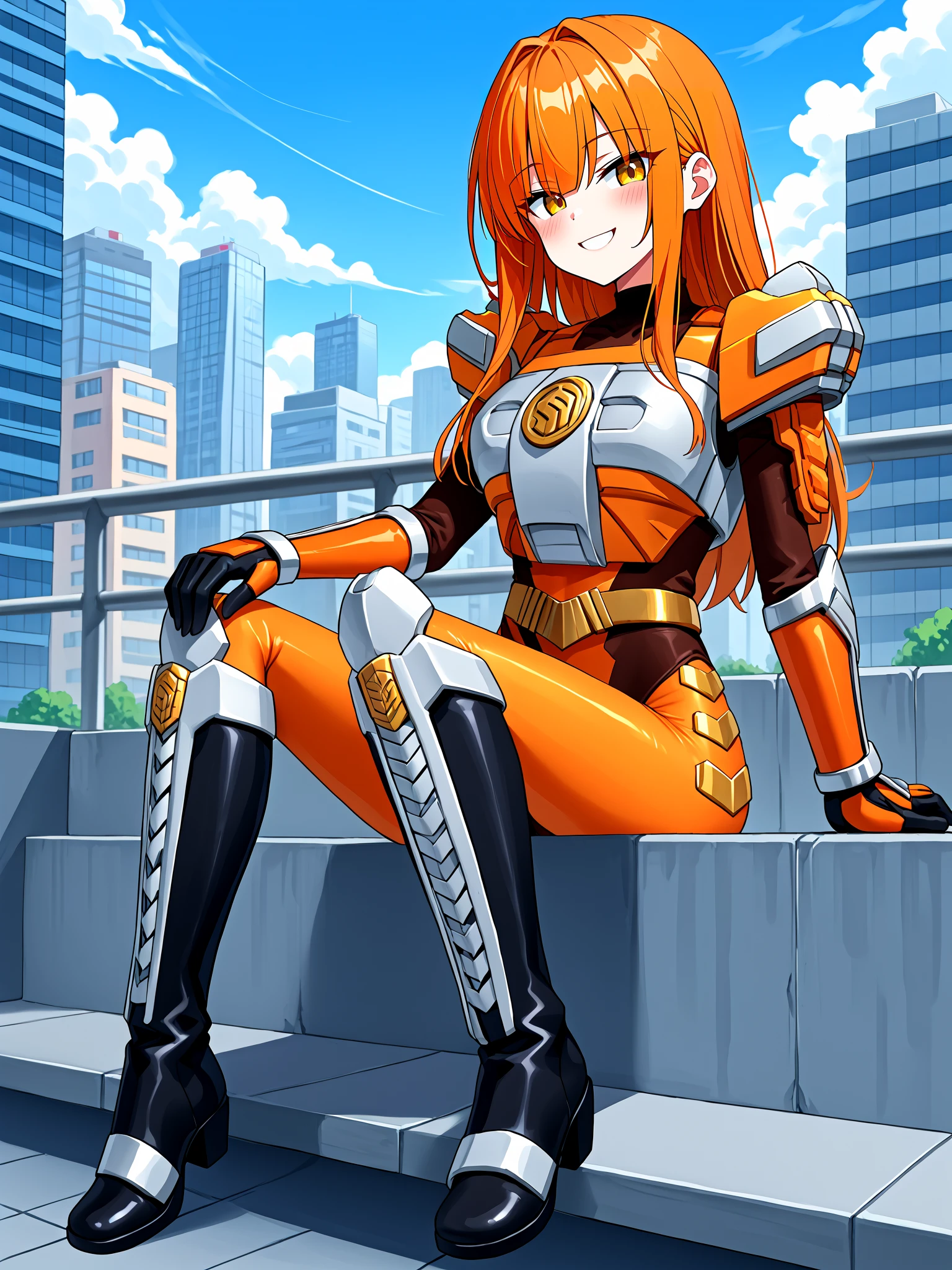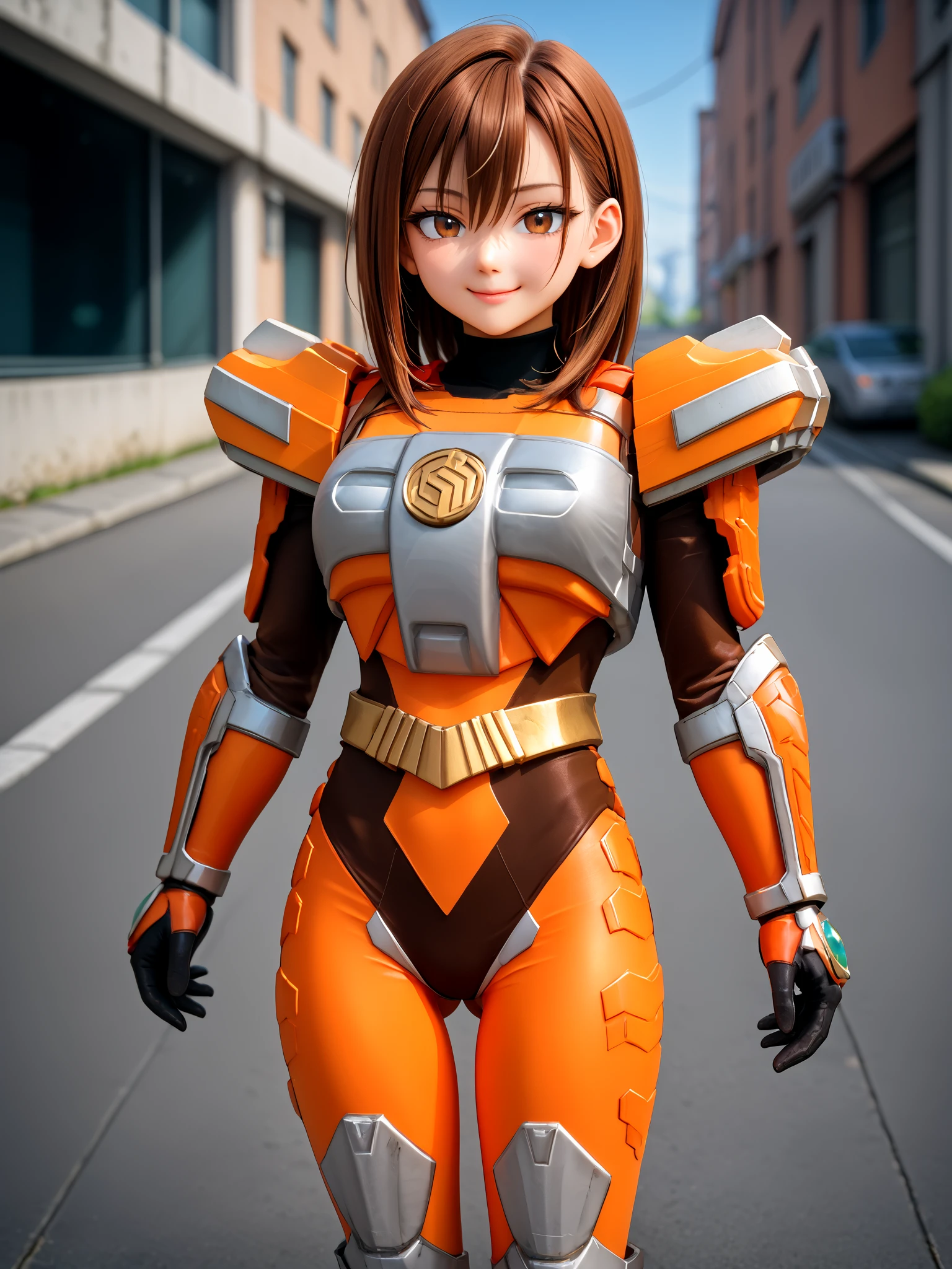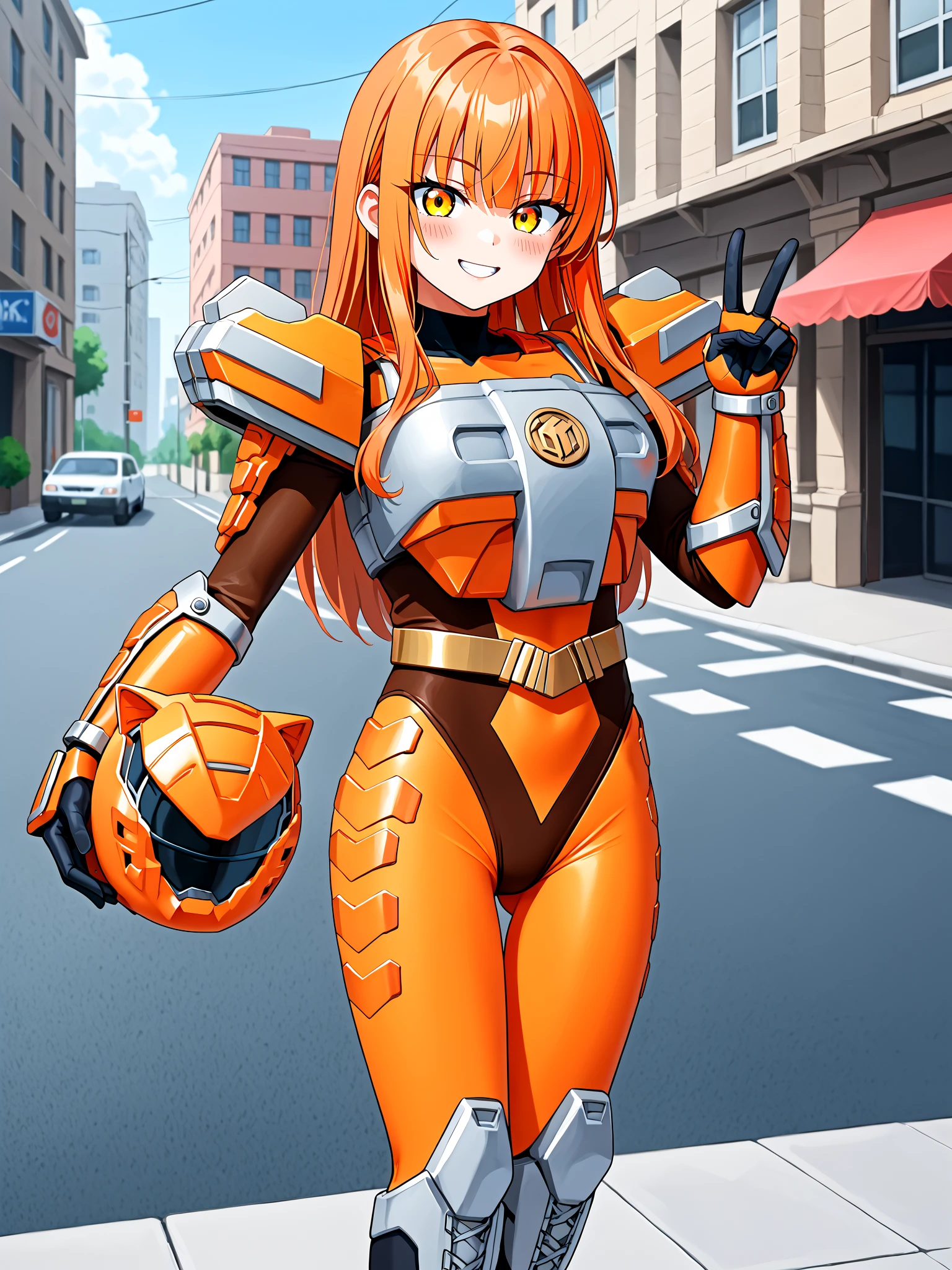 sazervisuel, orange bodysuit, brown leotard, belt, armor, gauntlets, black gloves