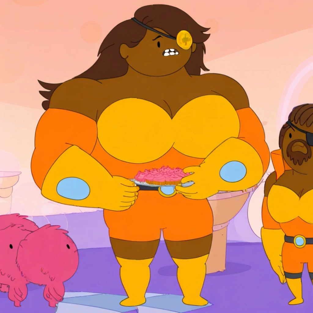 milf, tall women, long hair, brown skin, dark-brown hair, huge breast, orange armor, yellow gloves and bra, eye patch, yellow patch, cross on bandage, round patch