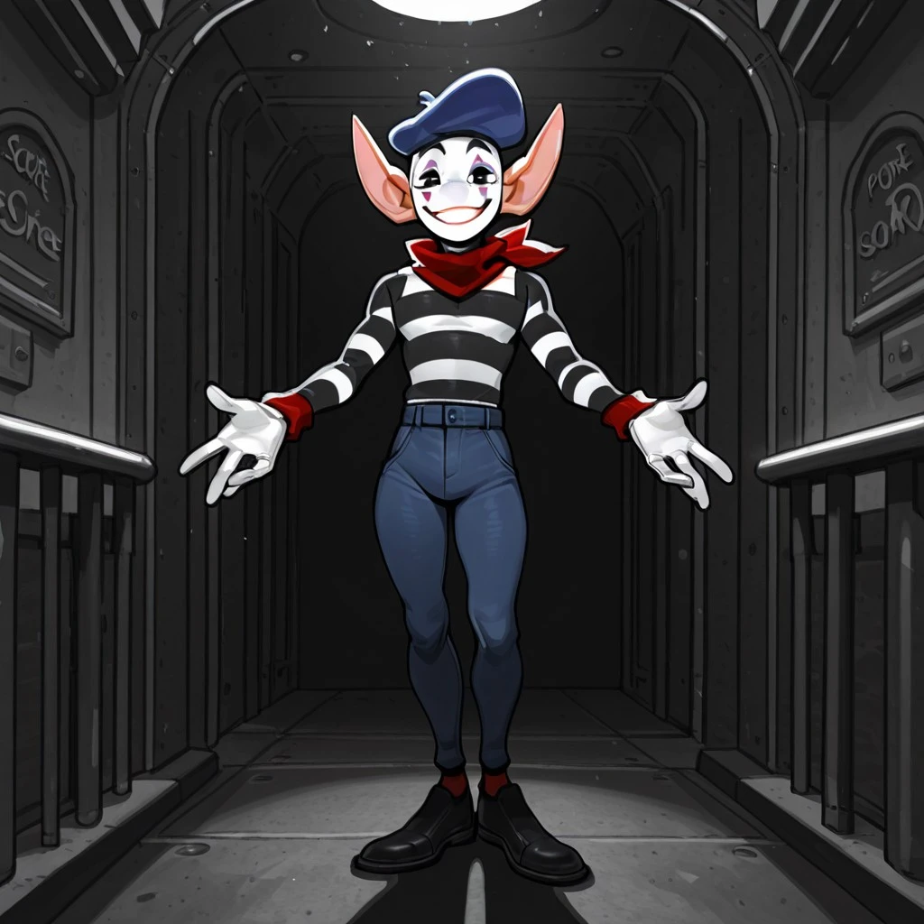 SmallNorm,Alien Humanoid,Male,Pointy ears,Mime outfit,Blue hat,Black and white shirt,Blue pants,Black shoes,Red scarf