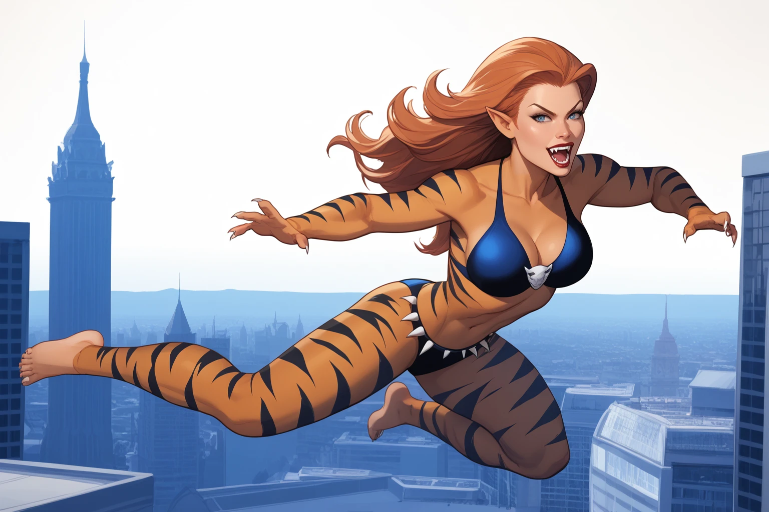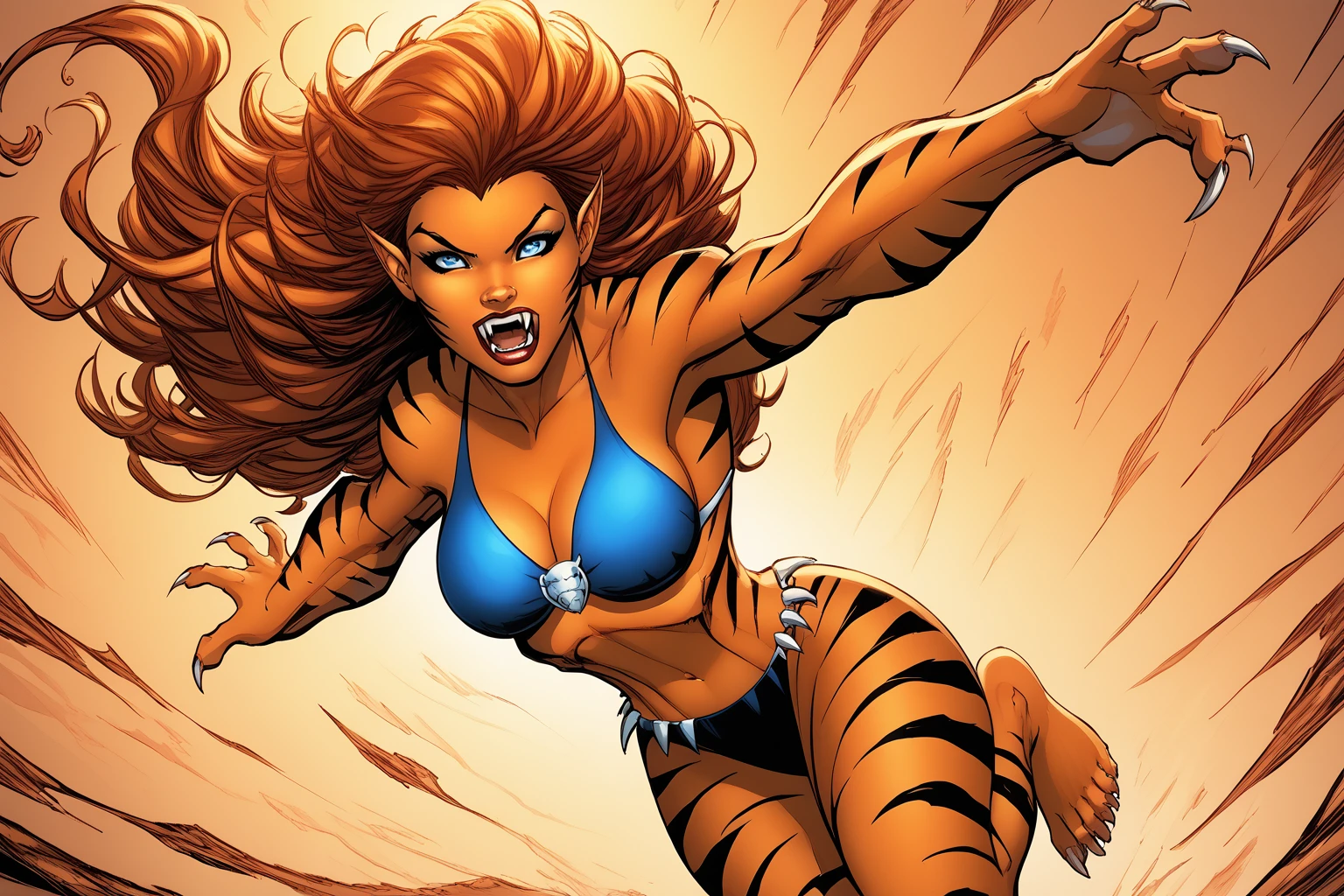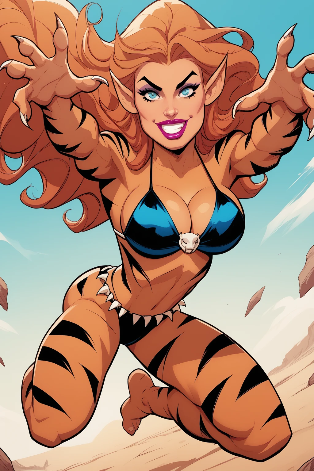 tgra, long hair, tail, colored skin, tiger print, claws, bikini, barefoot, pointy ears