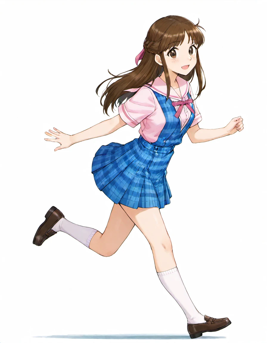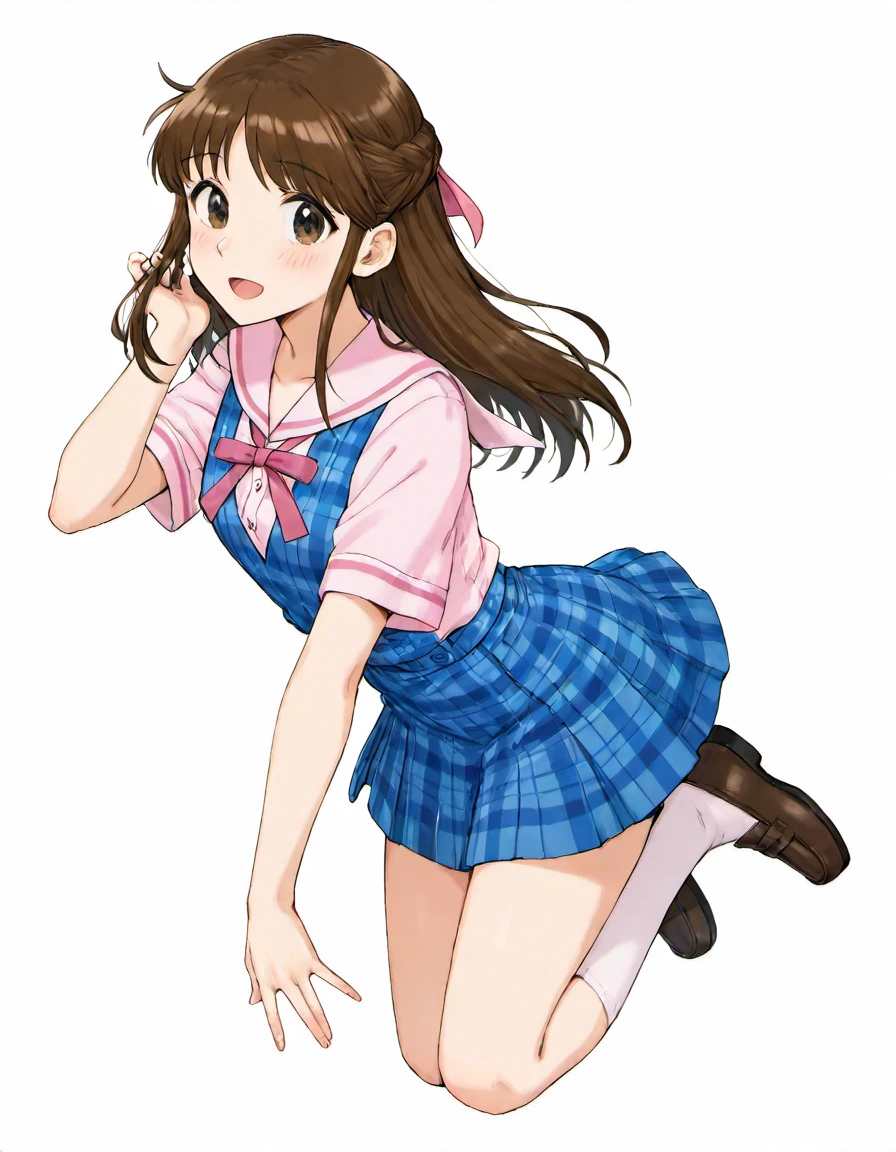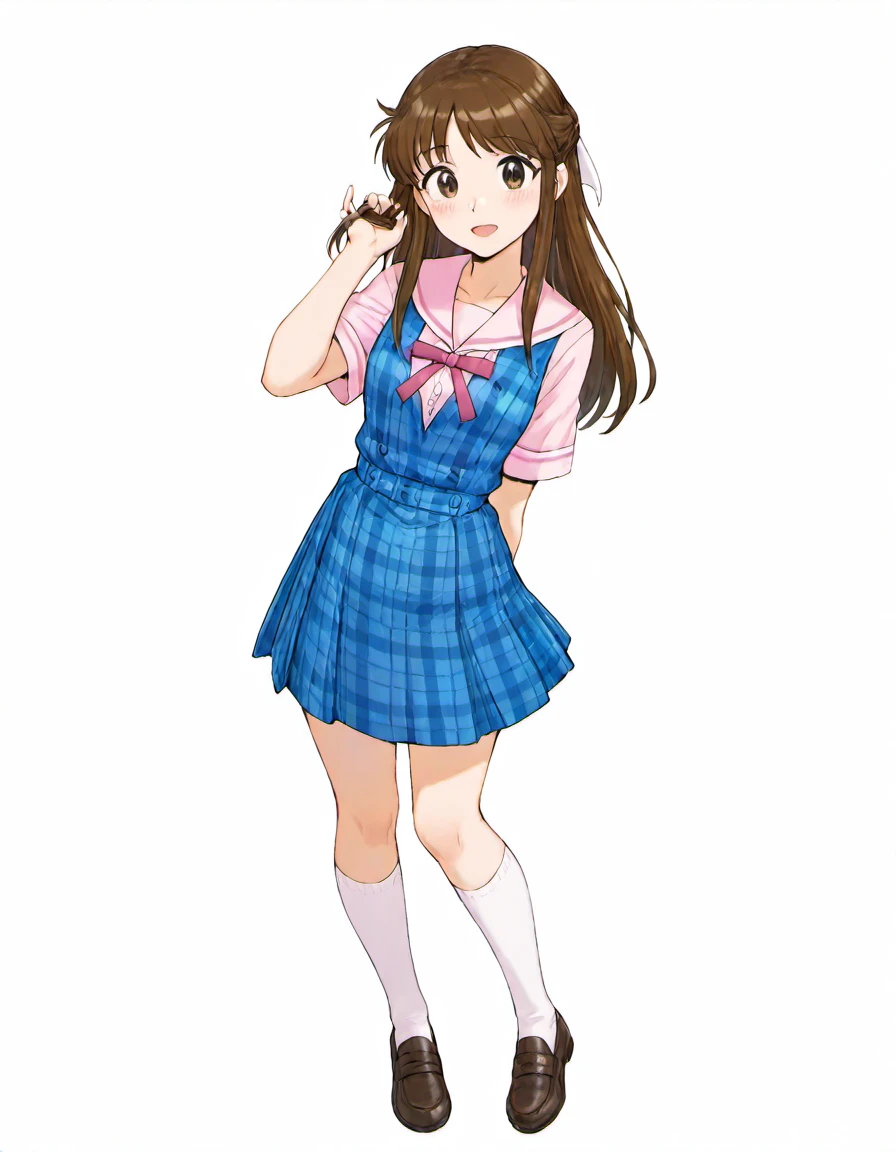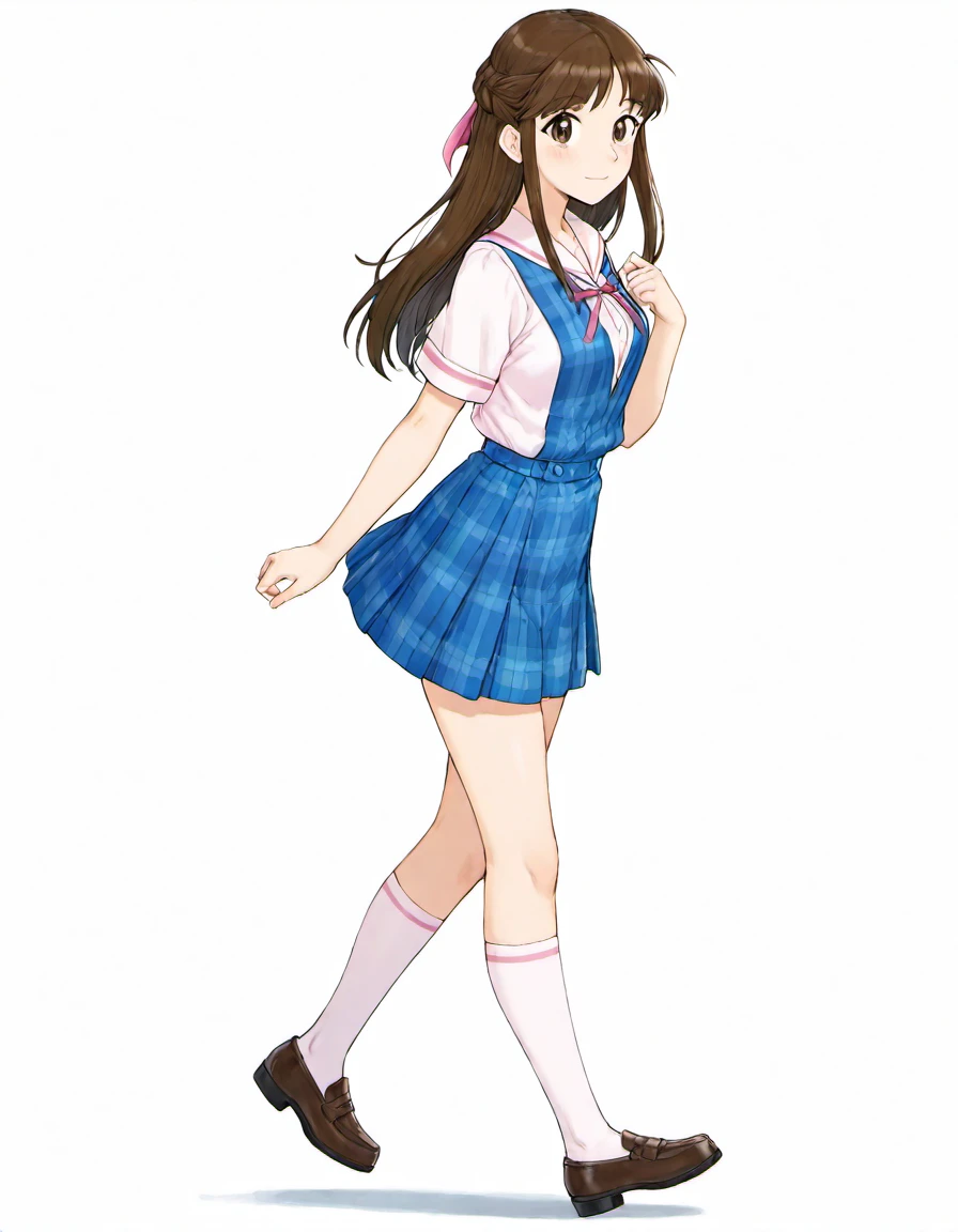 plaid pinafore, blue pinafore, pleated skirt, pale pink kneehighs, loafers, pale pink shirts, pale pink sailor collar, pink bowtie,
