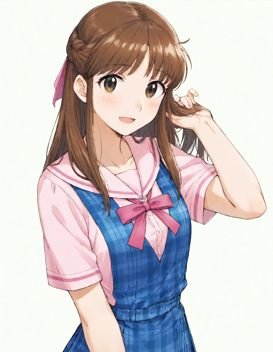 katsuragi_ayane, brown hair, long hair, brown eyes, straight bangs, side bangs, hair ribbon, ribbon in hair, large eyes, slight blush,