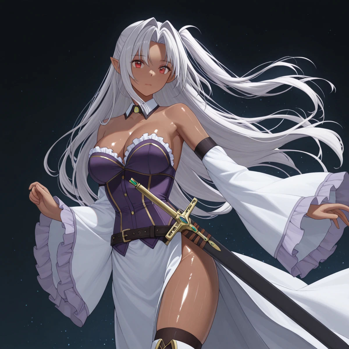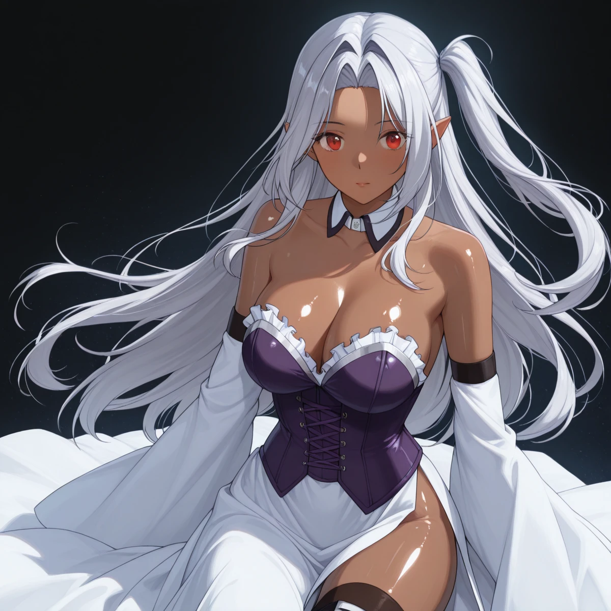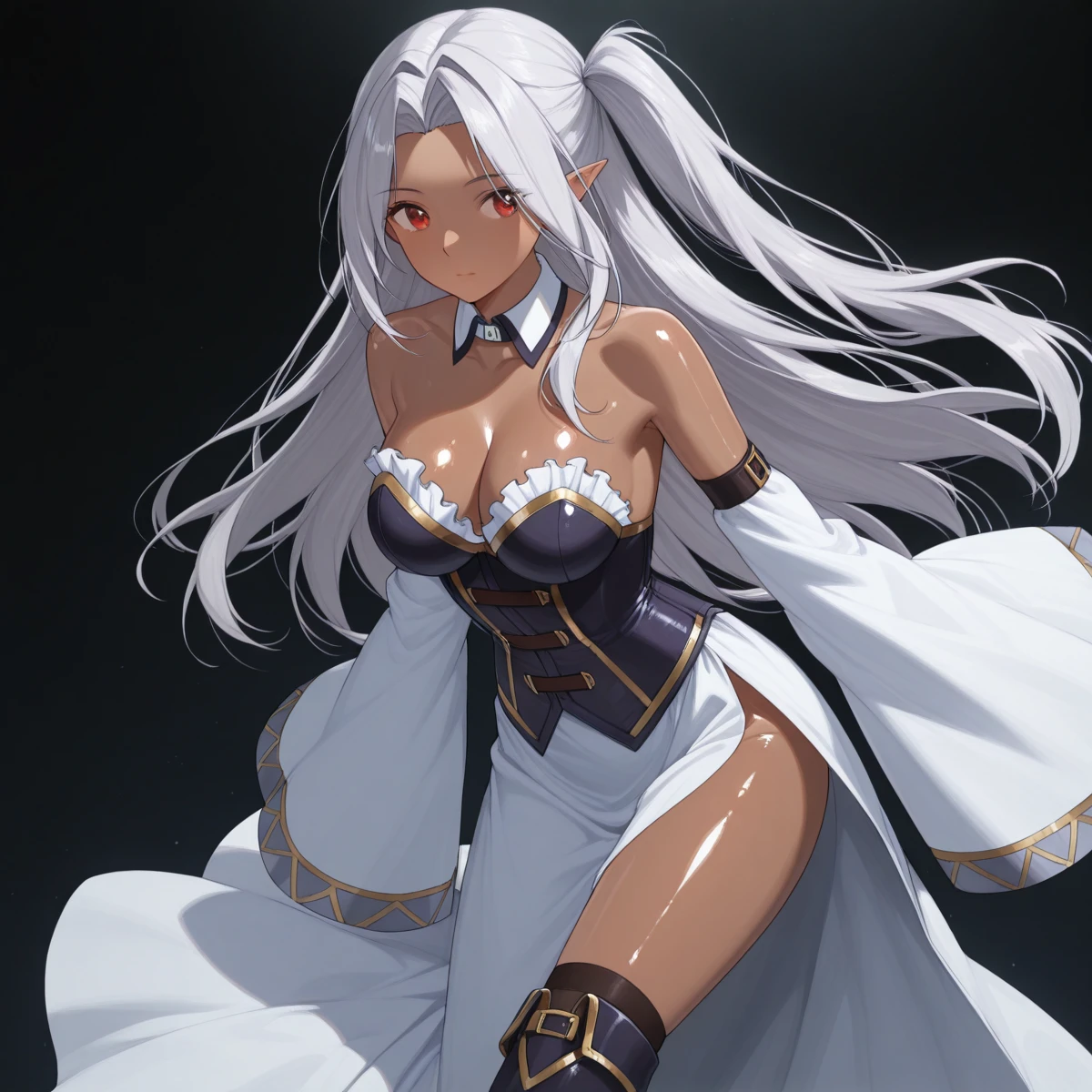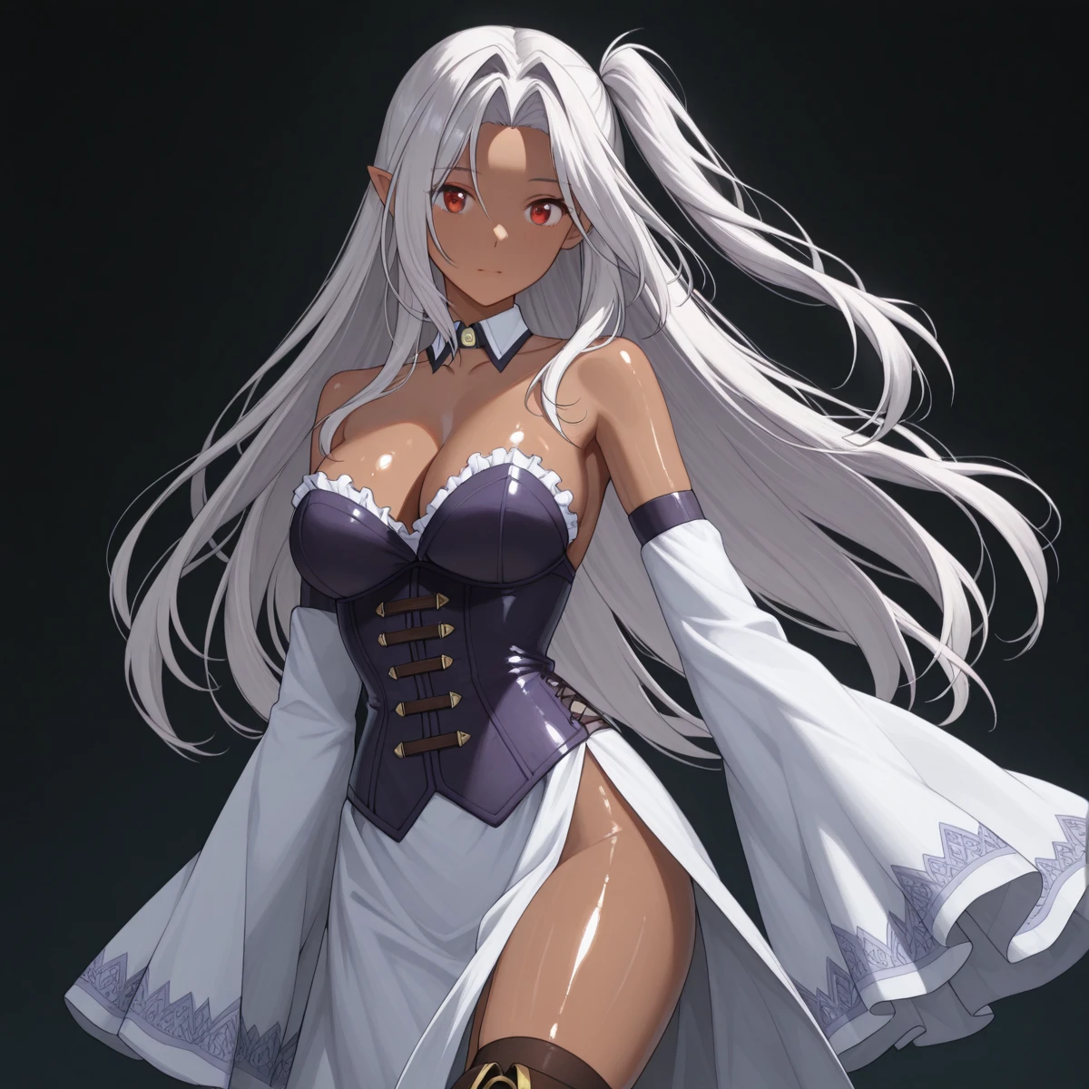 Character: (EuphemiaDeath, dark skin, pointy ears, red eyes, silver hair, hair intakes, long hair, side ponytail)