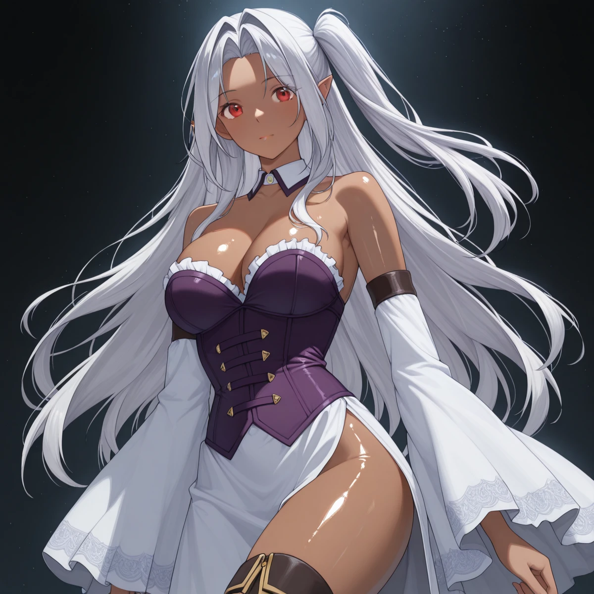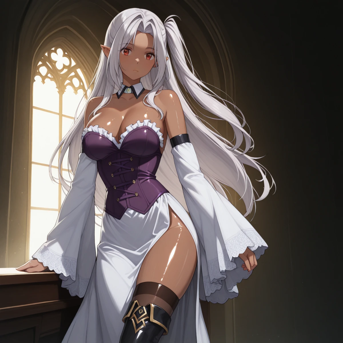 Clothes: (detached collar, (side slit dress), long dress, (purple corset), cleavage, bare shoulders, detached sleeves, thighhigh boots)