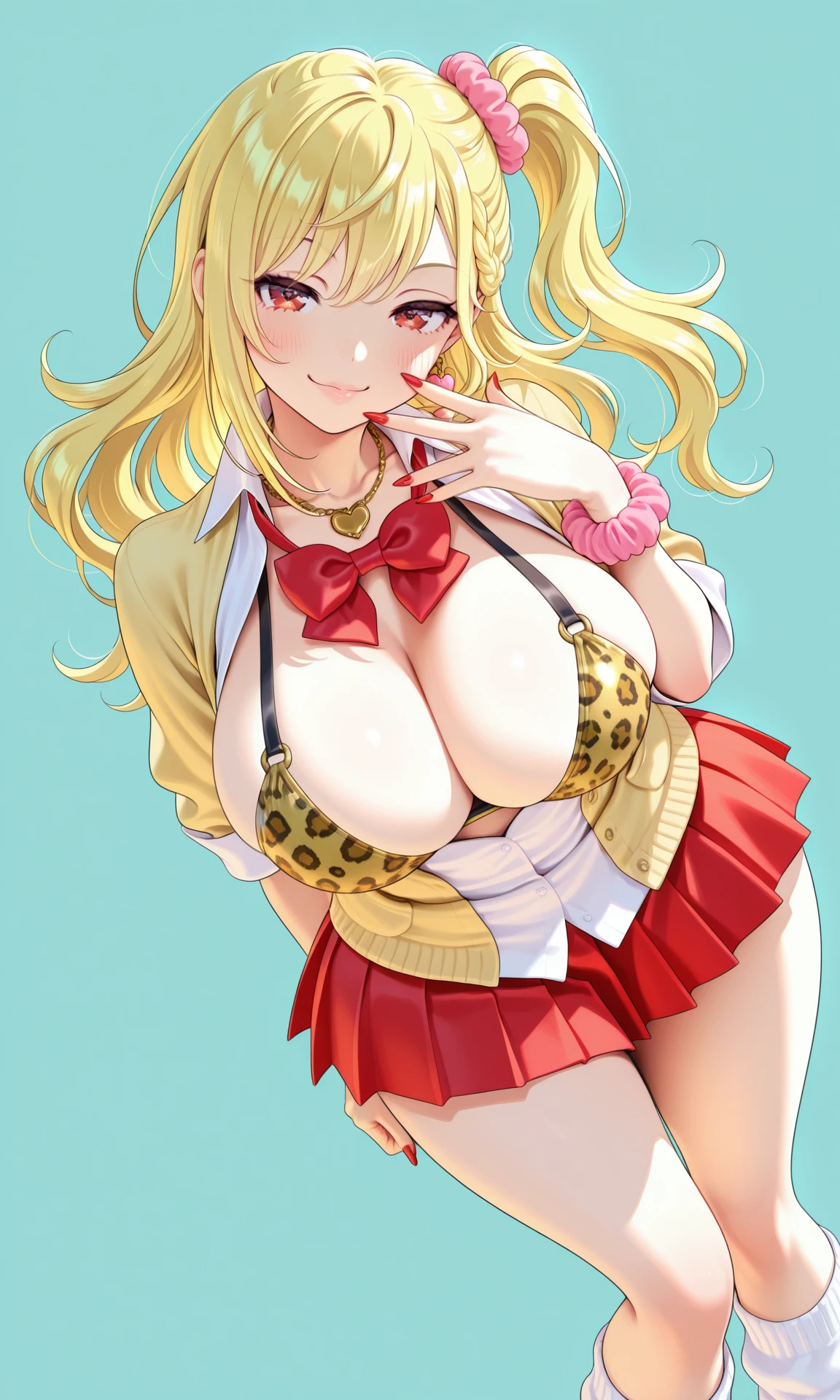 gold_necklace,red_bowtie, cleavage, leopard_print_bikini,white_shirt,partially unbuttoned,collared shirt, yellow_jacket, open_jacket,short_sleeves,single wrist_scrunchie,red_nails,