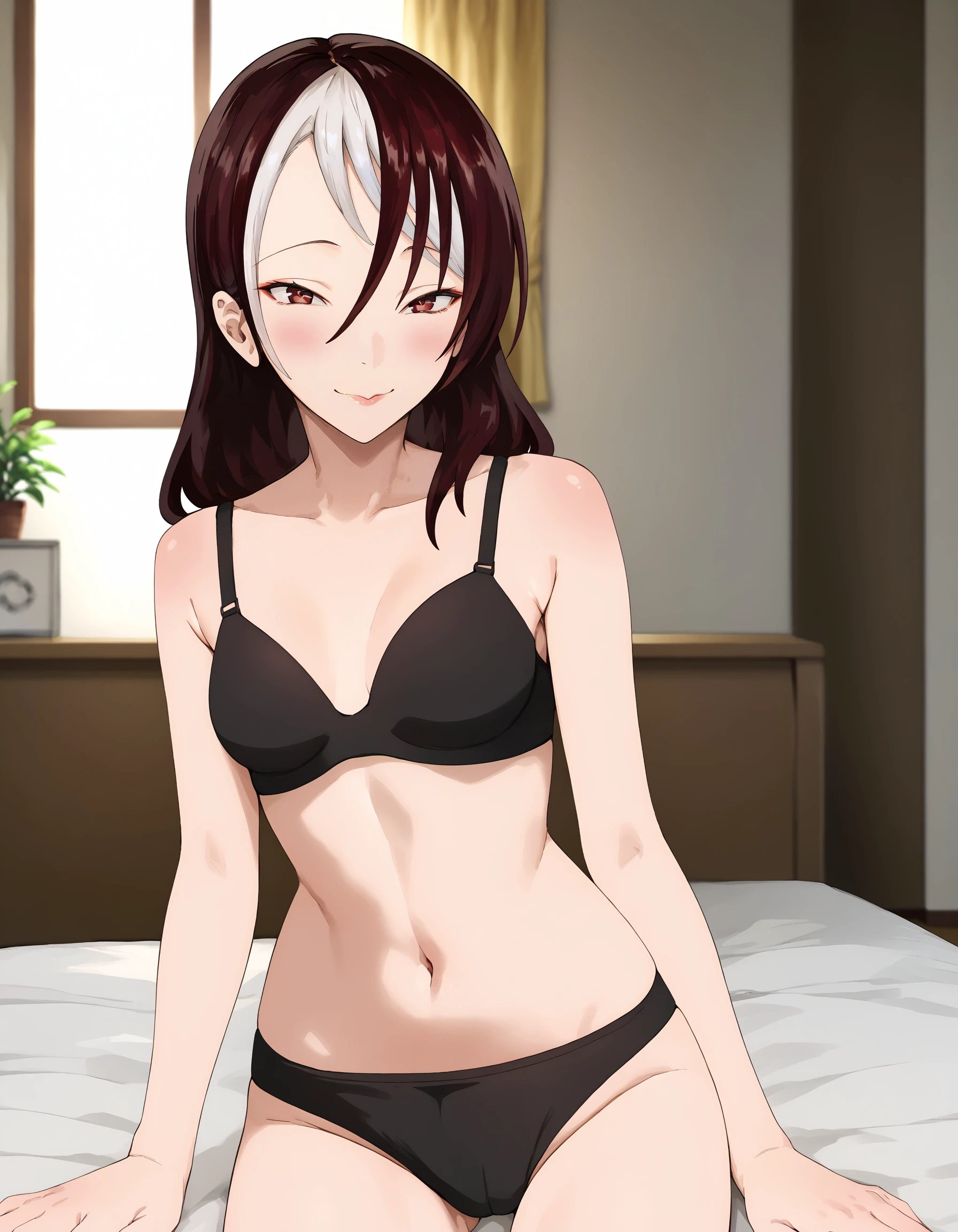 Color - iruko, two-tone hair, long hair, ponytail, dark maroon hair, white hair, red eyes