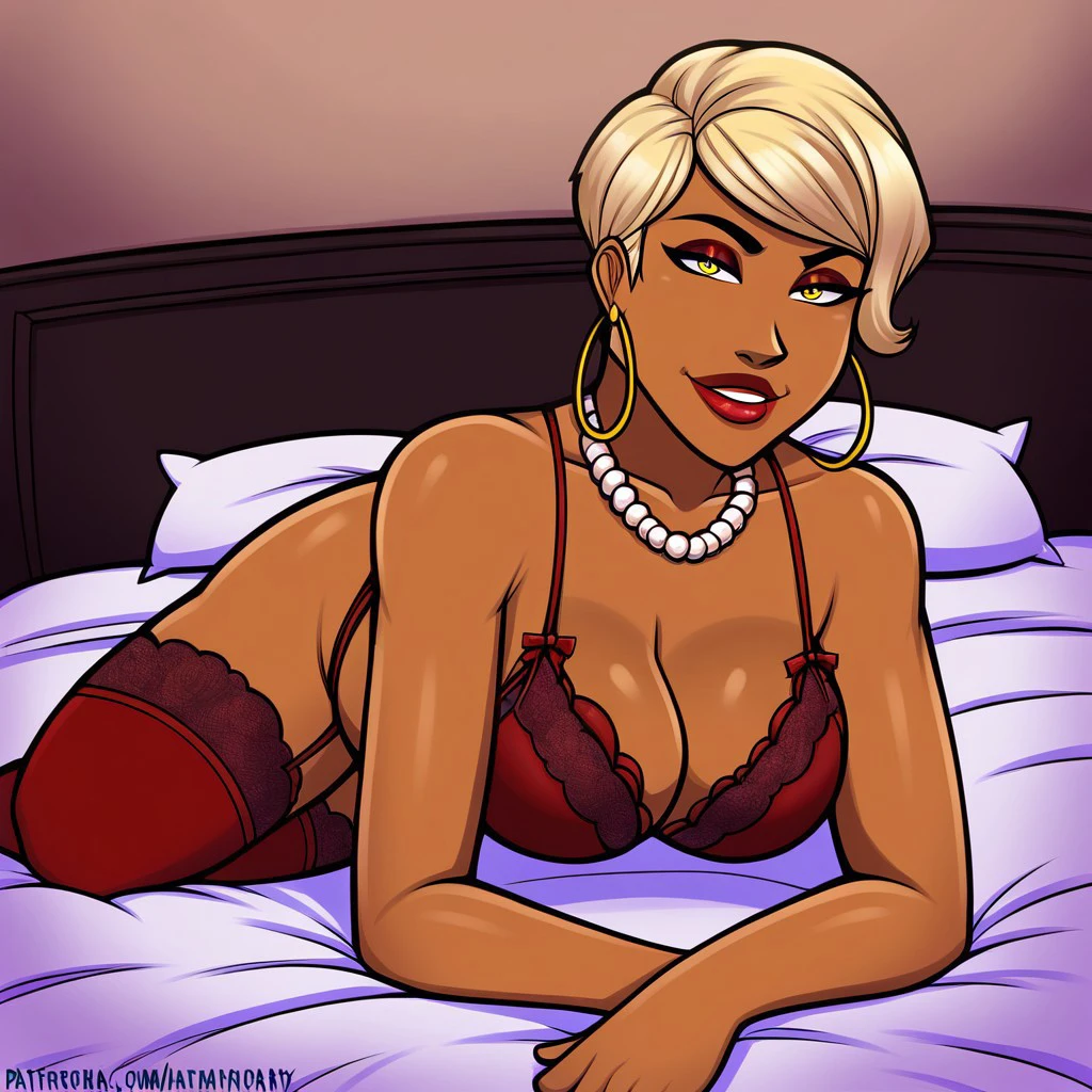 giannalewis, dark-skinned female, makeup, red lips, hoop earrings, pearl necklace, short hair, blonde hair, yellow eyes