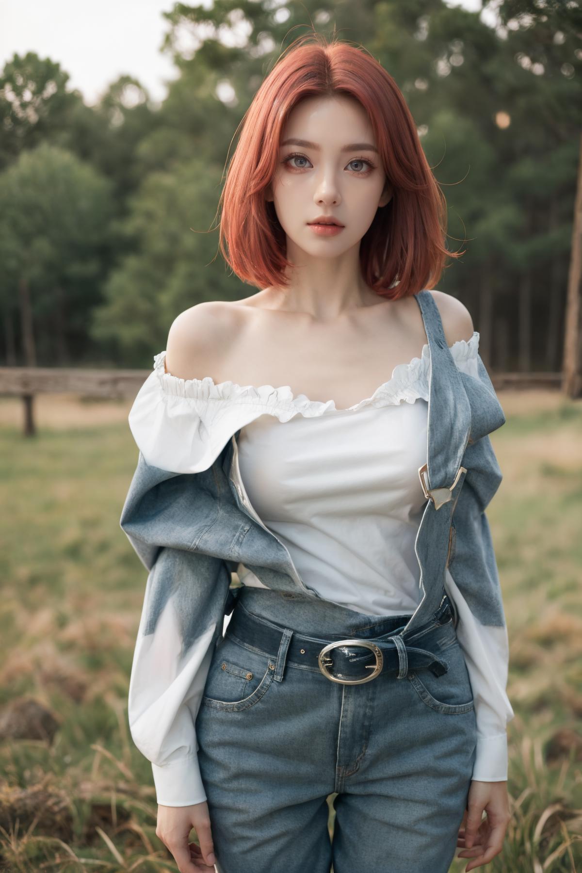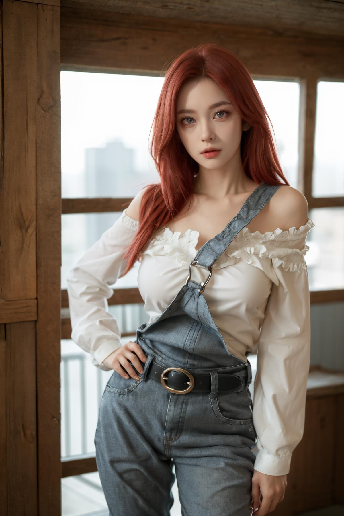 gscg, ahoge, overalls, white shirt, collarbone, off shoulder, long sleeves, belt, long pants, large breasts