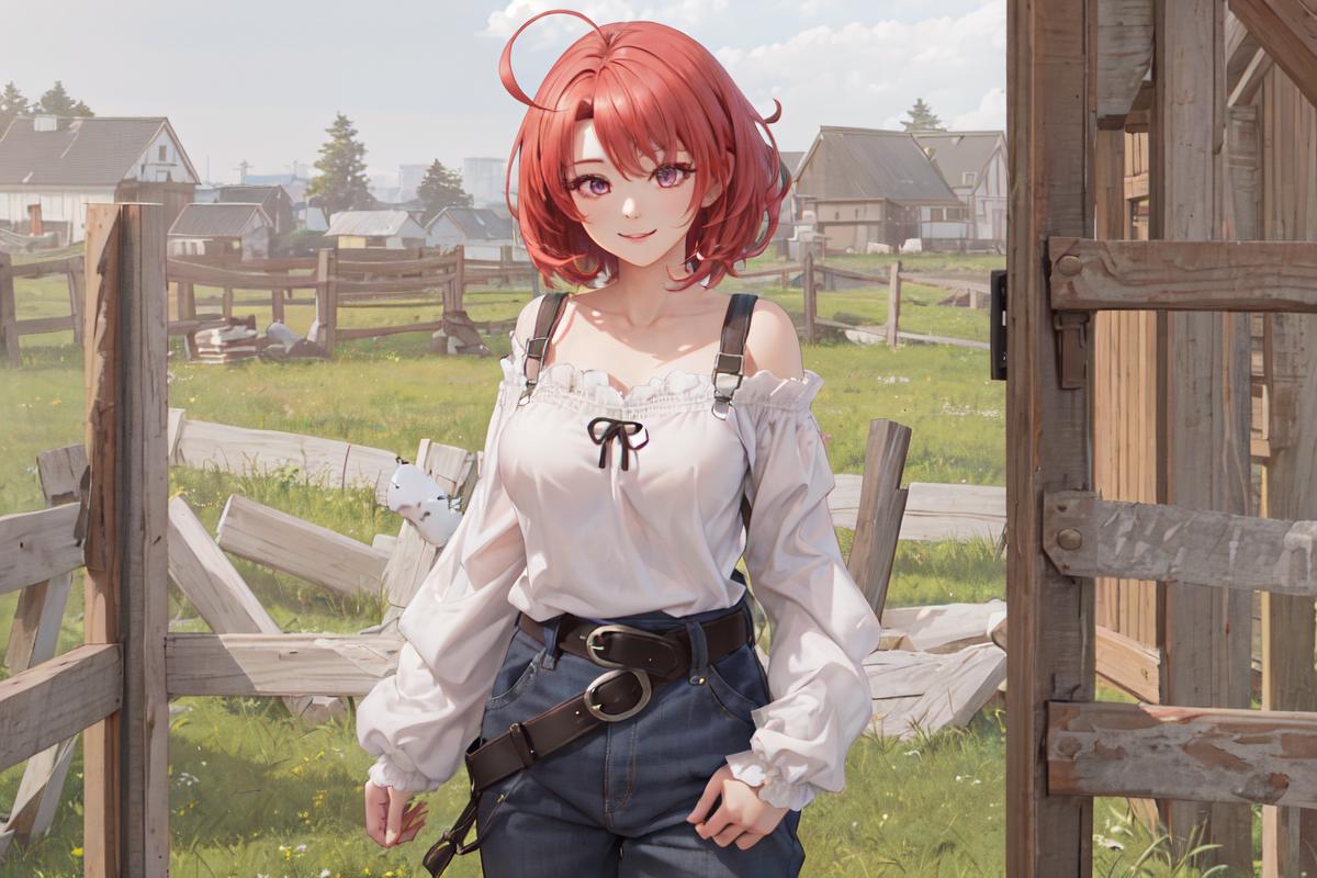 outfit1 (overalls)gscg, ahoge, overalls, white shirt, collarbone, off shoulder, long sleeves, belt, long pants, large breasts