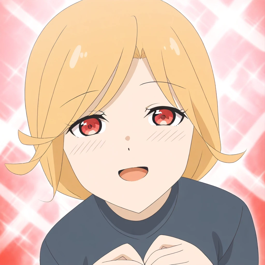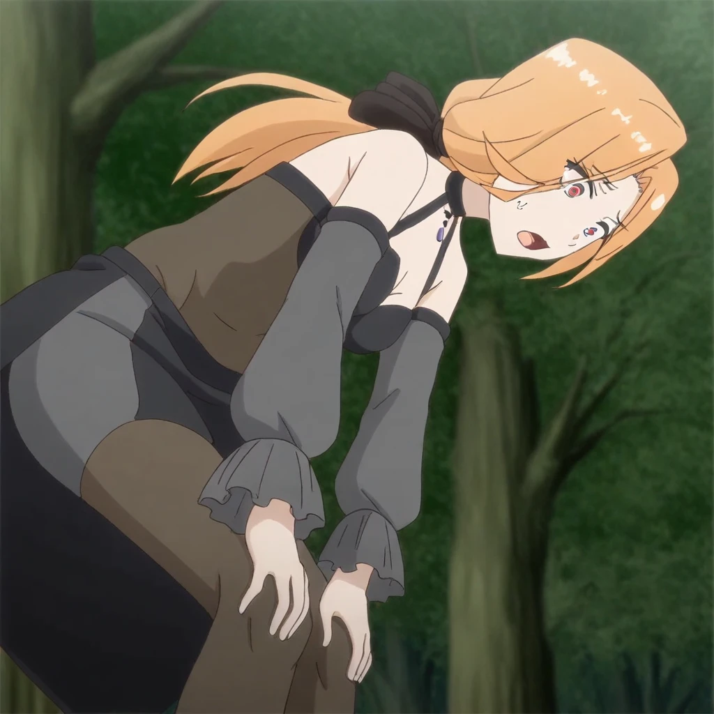 source_anime, Máni, Máni_rabbit_ears , Máni_hair, long_hair, Máni_outfit, red_eyes, 1girl, smile, large breasts, bare shoulders, Máni_jewel, cleavage, dutch angle, leaning forward, bare legs, hands on knees, solo, ass