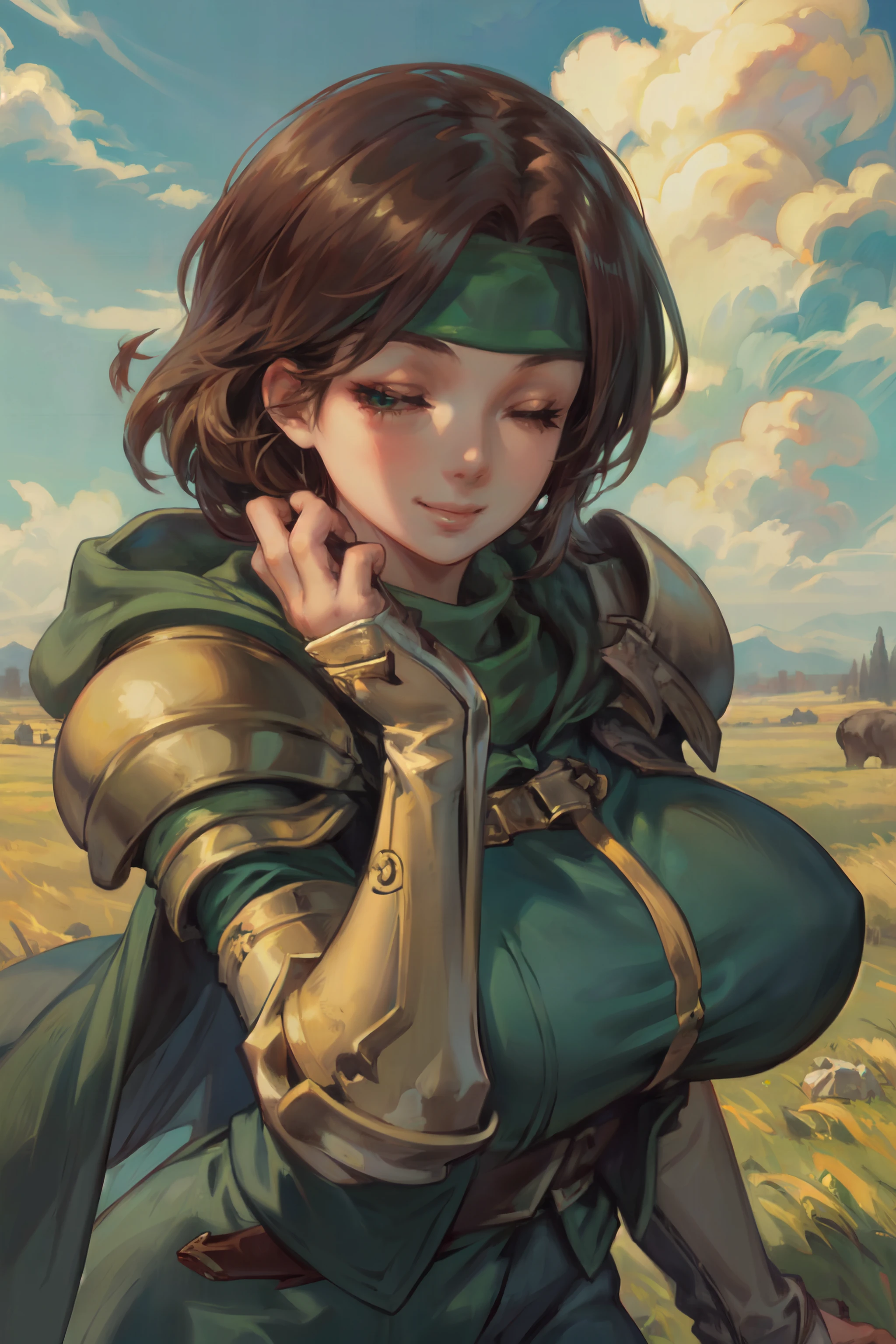 Meliadoul from Final Fantasy Tactics. Not many hang-ups on this one from what I can tell. To render her with her hood down, simply remove "hood" from the prompt.