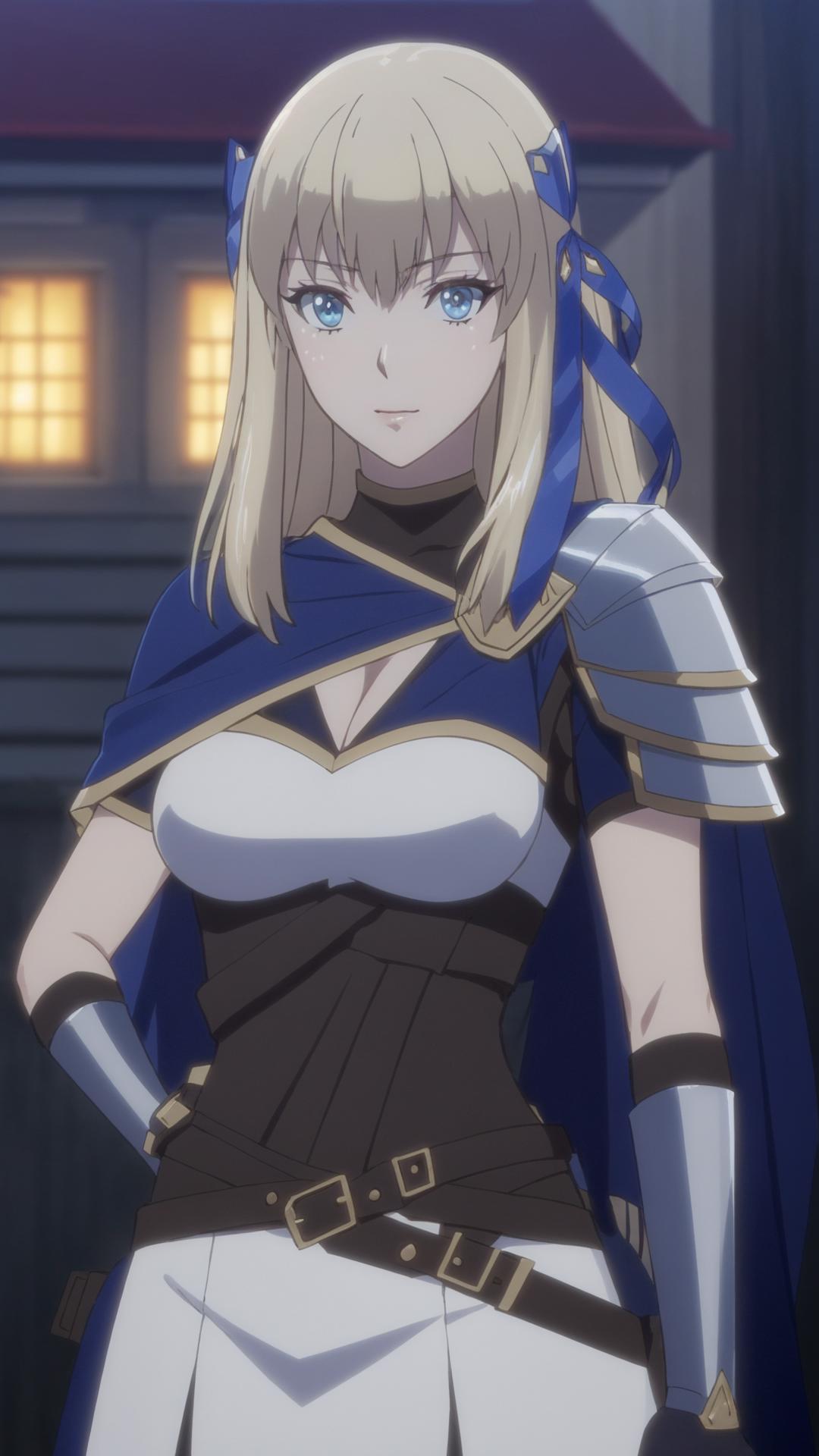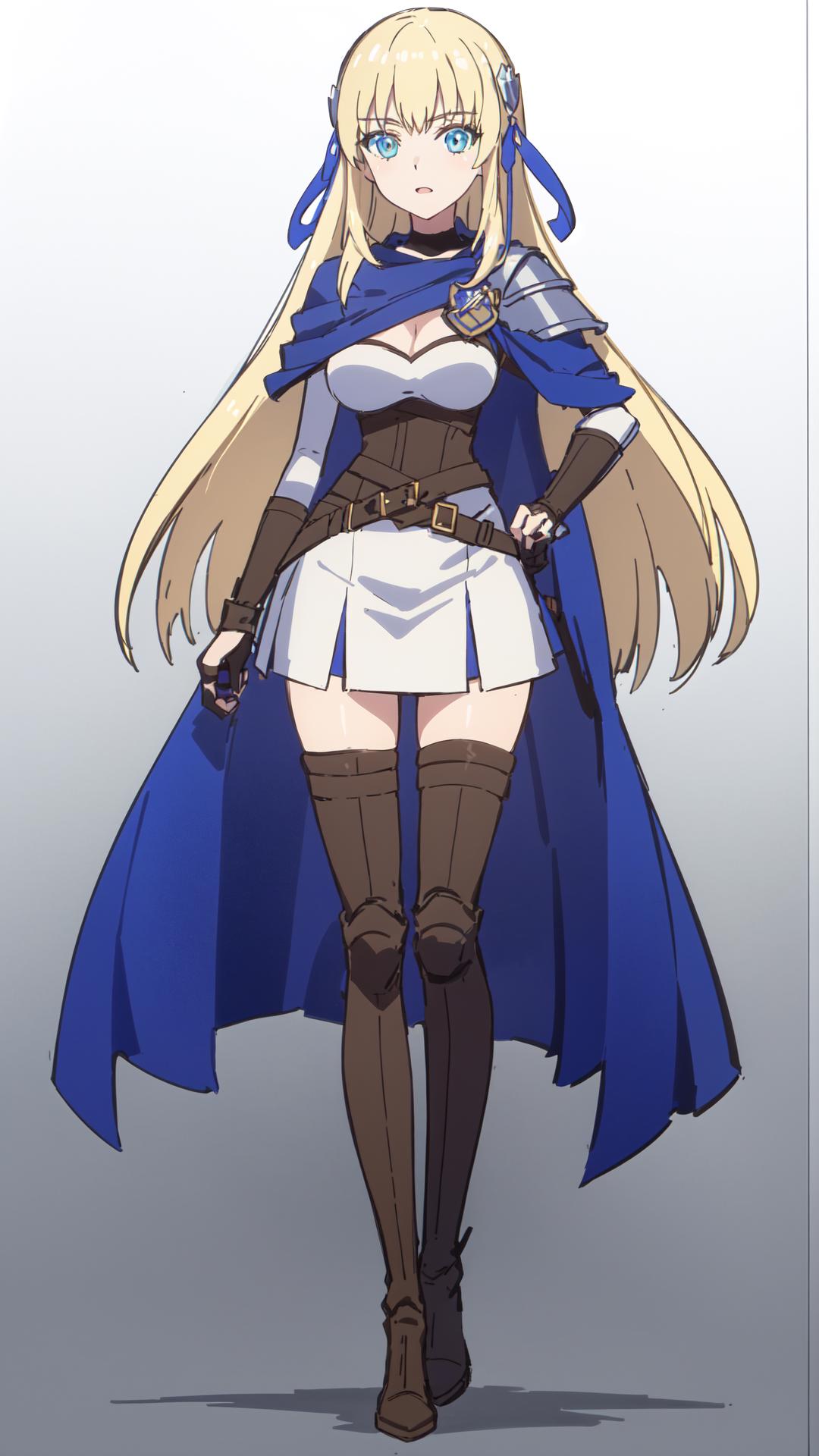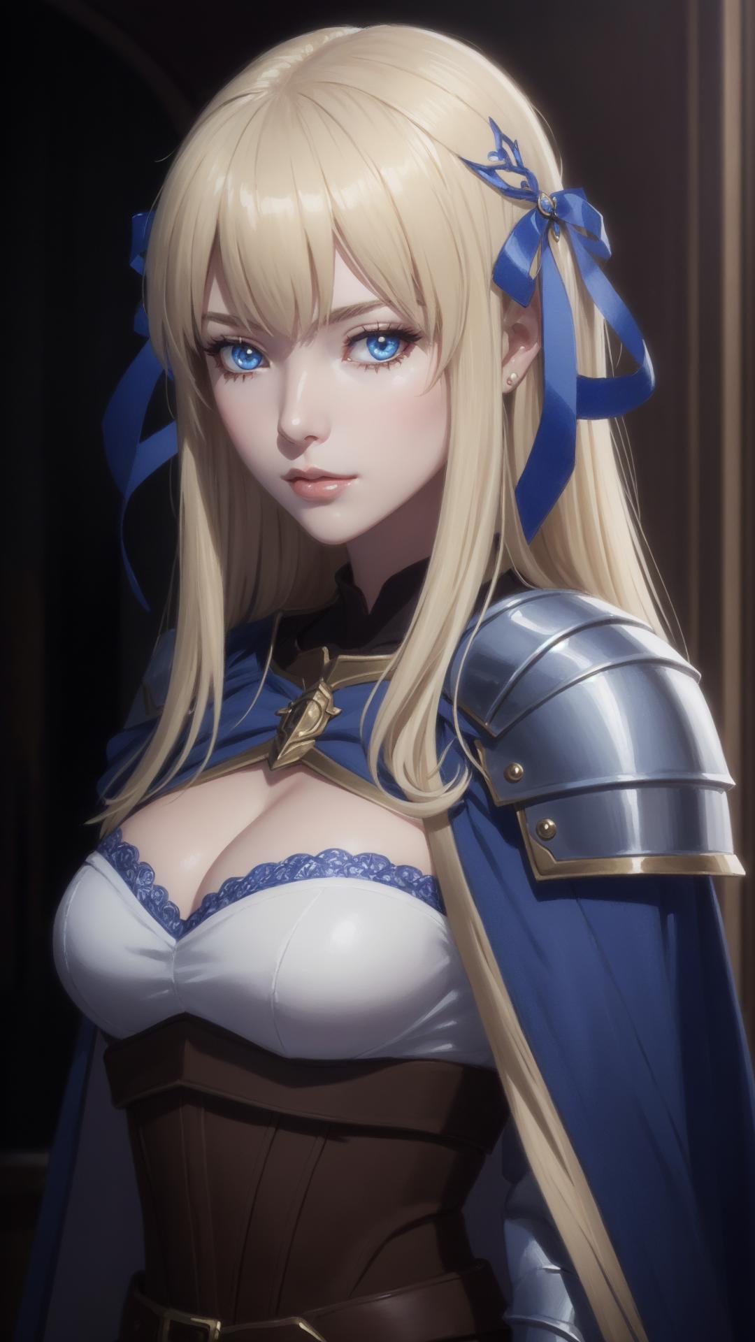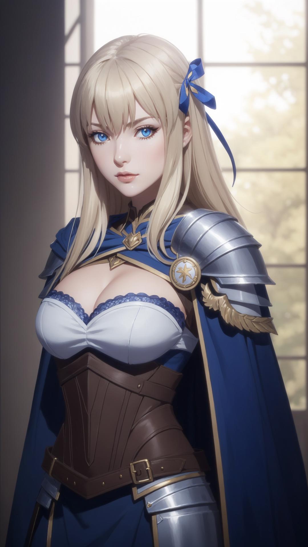 blonde hair, blue eyes, blue ribbon in hair, knight outfit, gray metal shoulder pauldron, blue cape