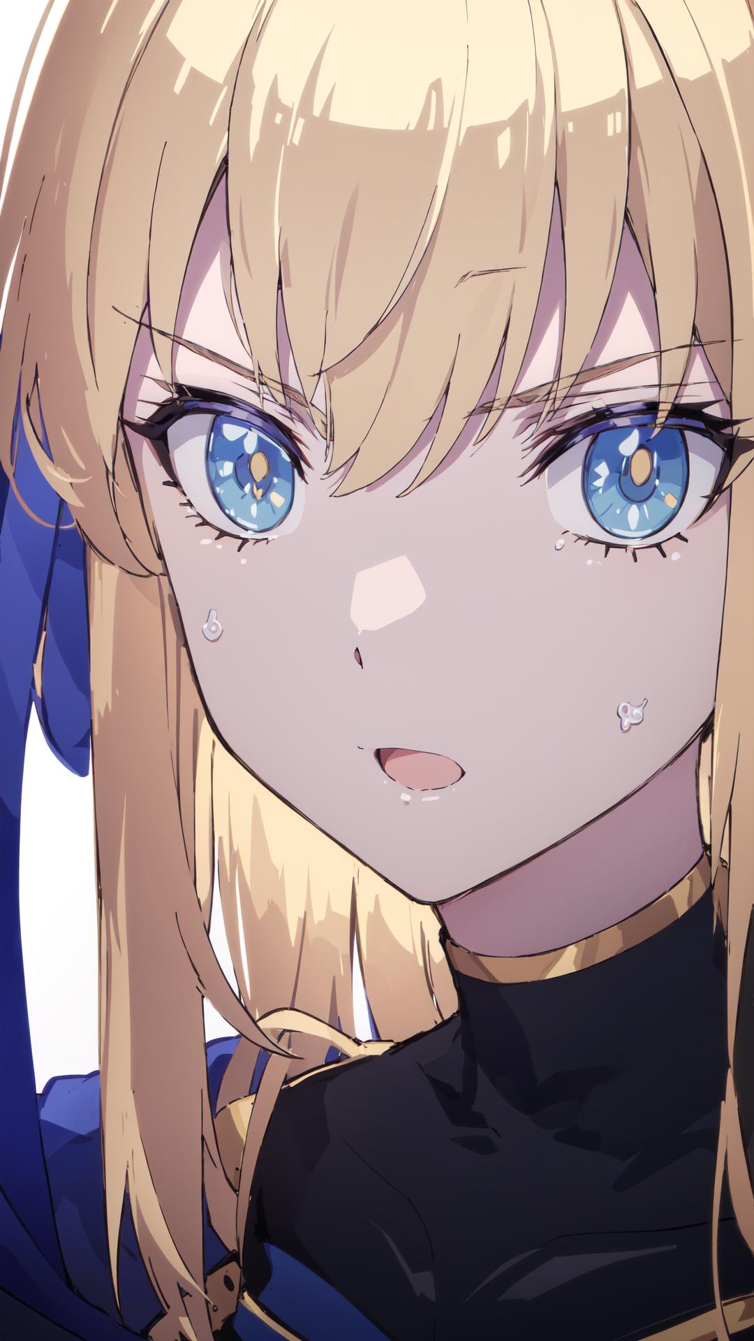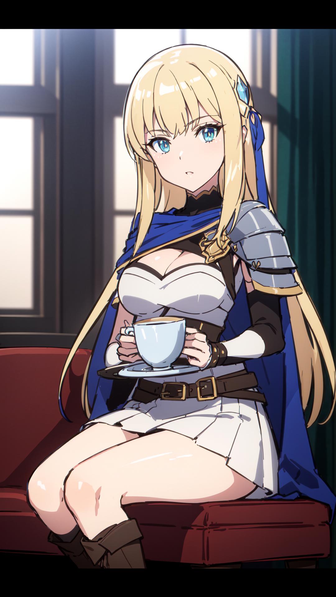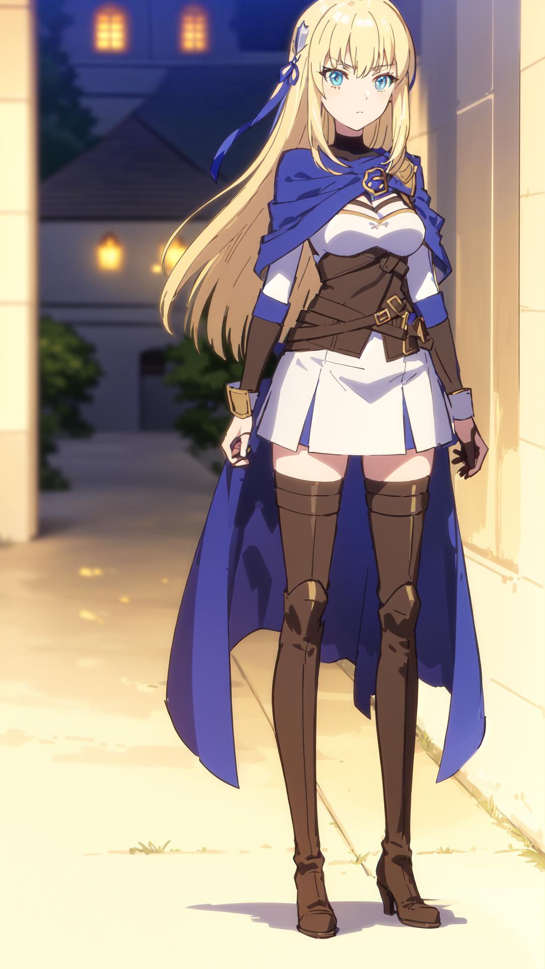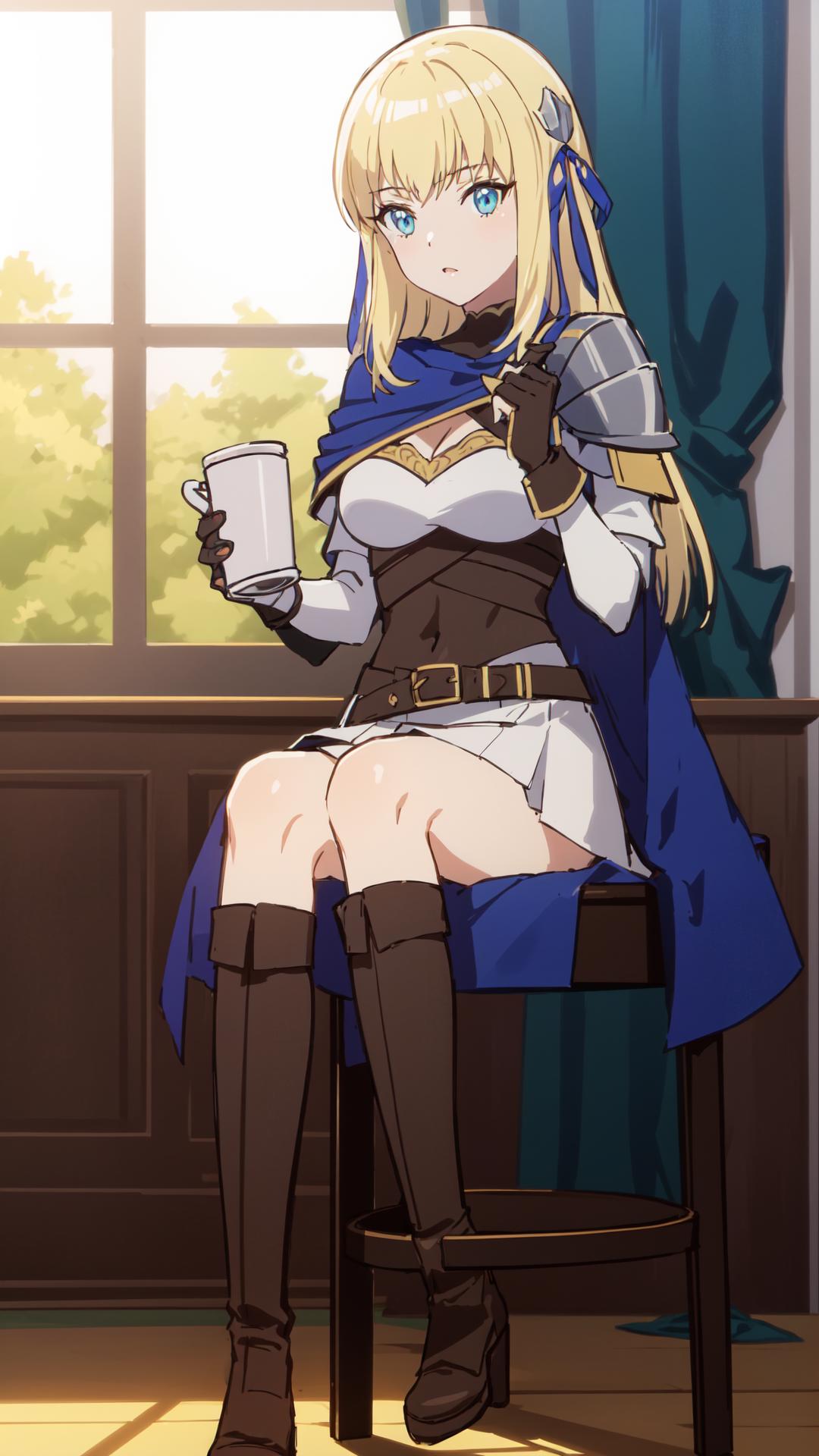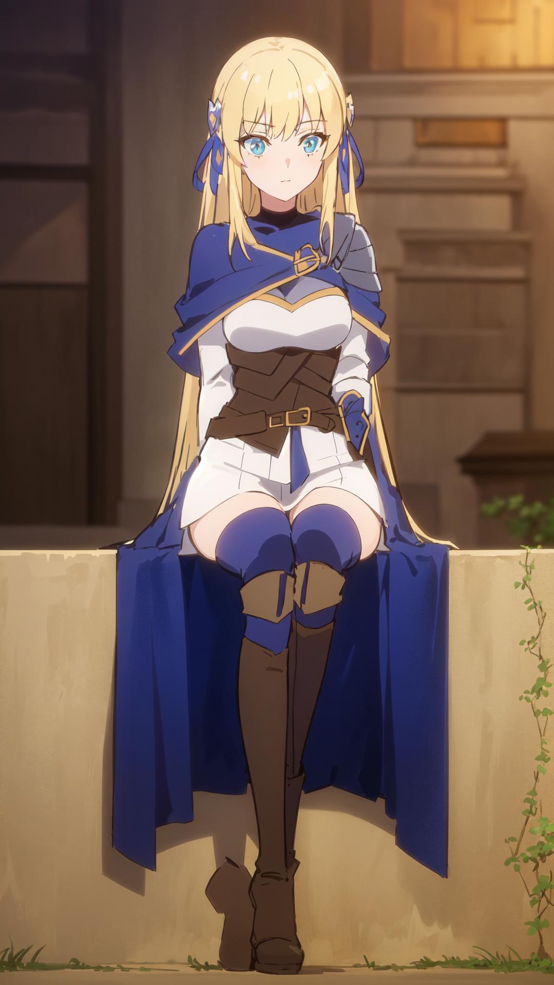 blonde hair, blue eyes, blue ribbon in hair, knight outfit, gray metal shoulder pauldron, blue cape