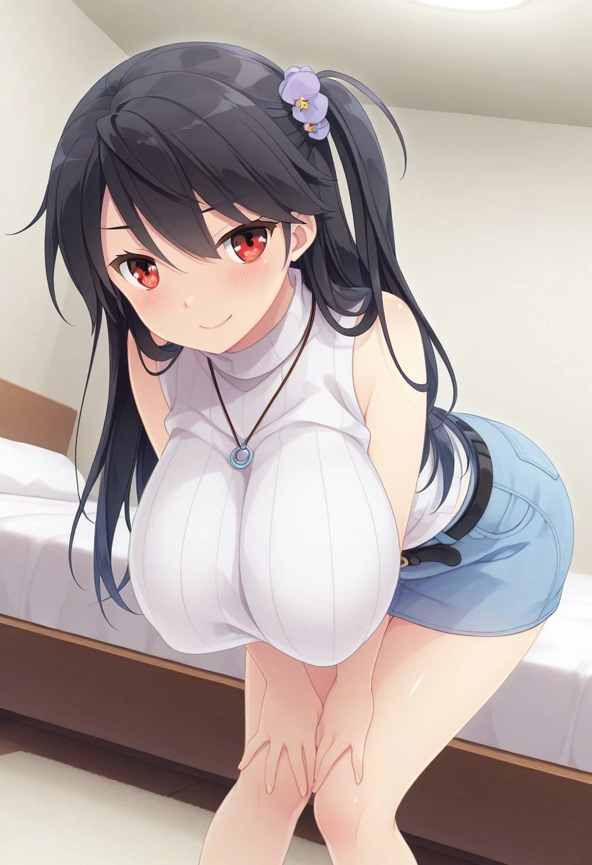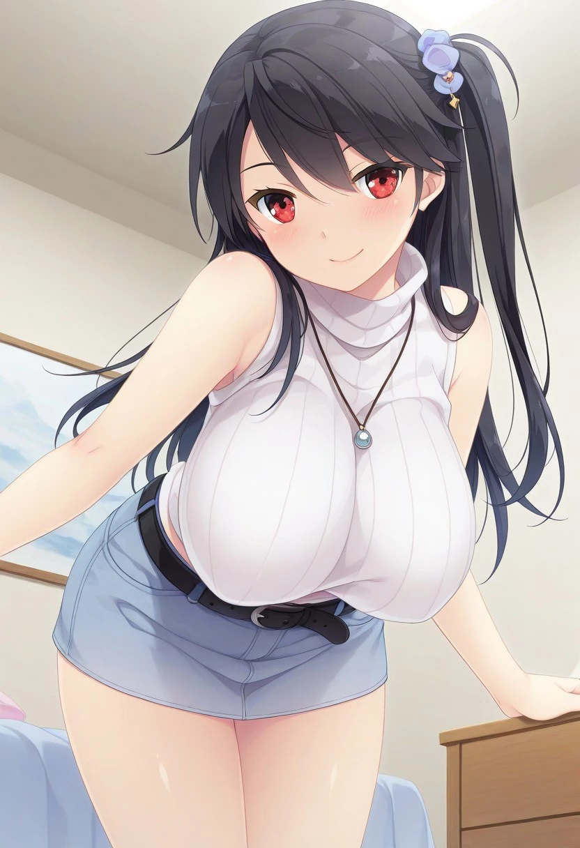 Seika Hoshii, red eyes, black hair, long hair, hair ornament, one side up,