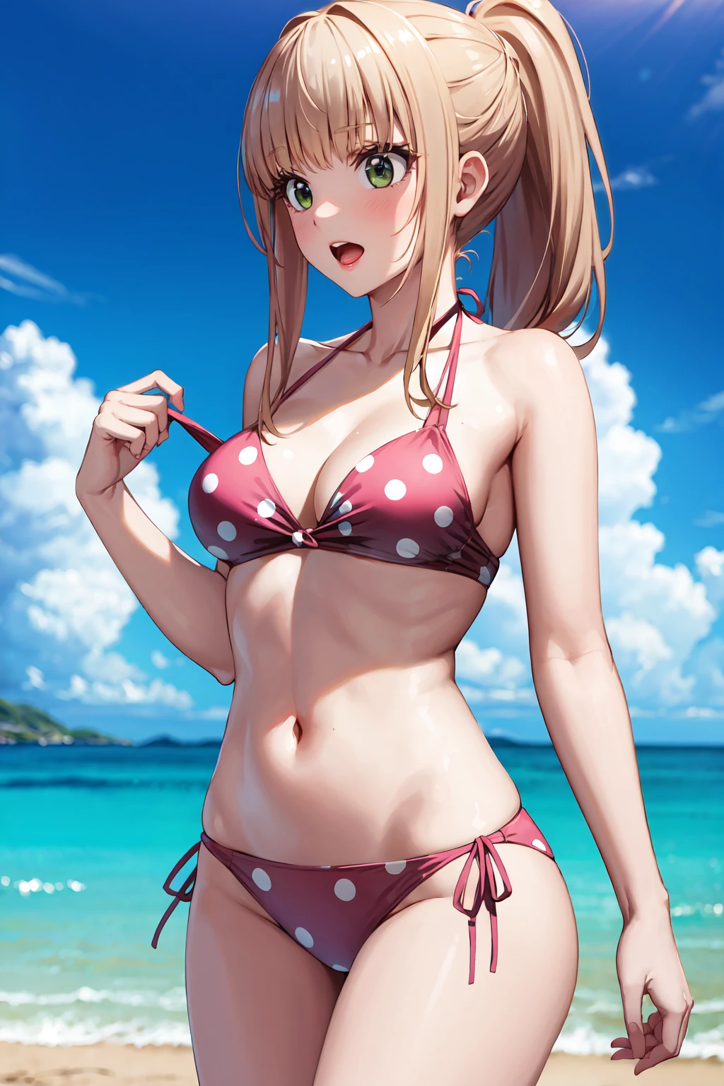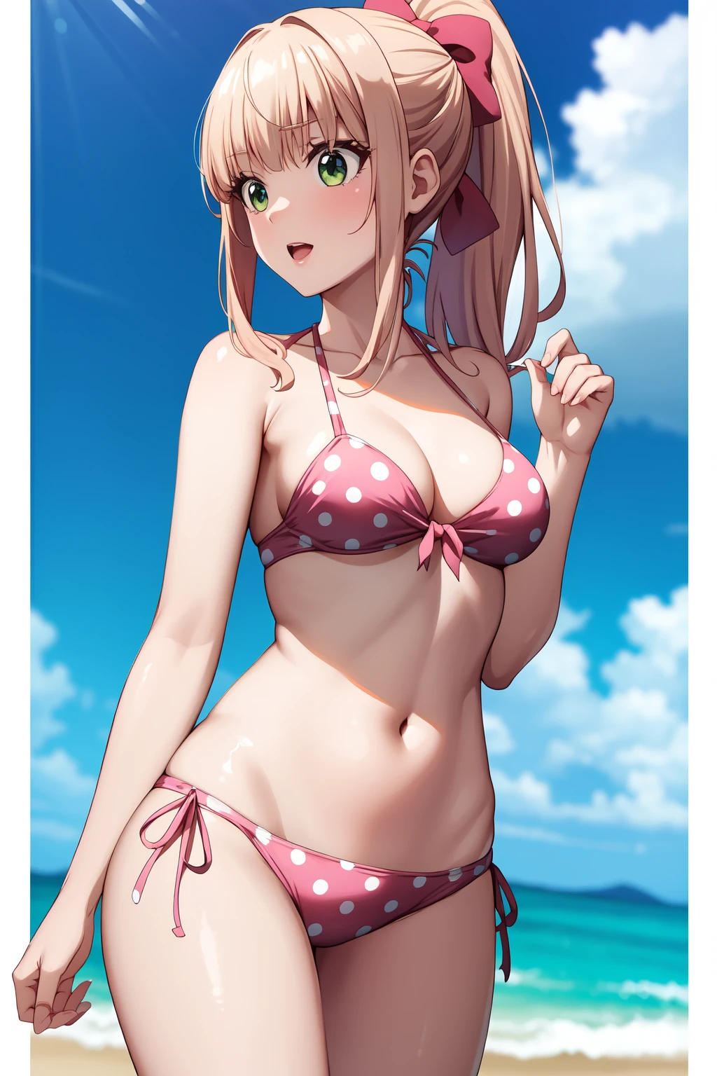 ponytail, swimsuit, pink bikini, polka dot bikini, side-tie bikini bottom, pink hair bow, cleavage, navel