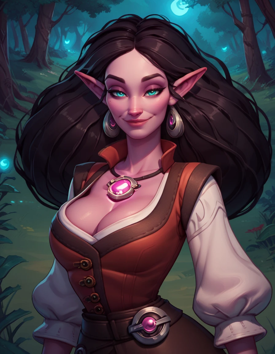 long hair, aqua eyes, black hair, pointy ears, purple skin,