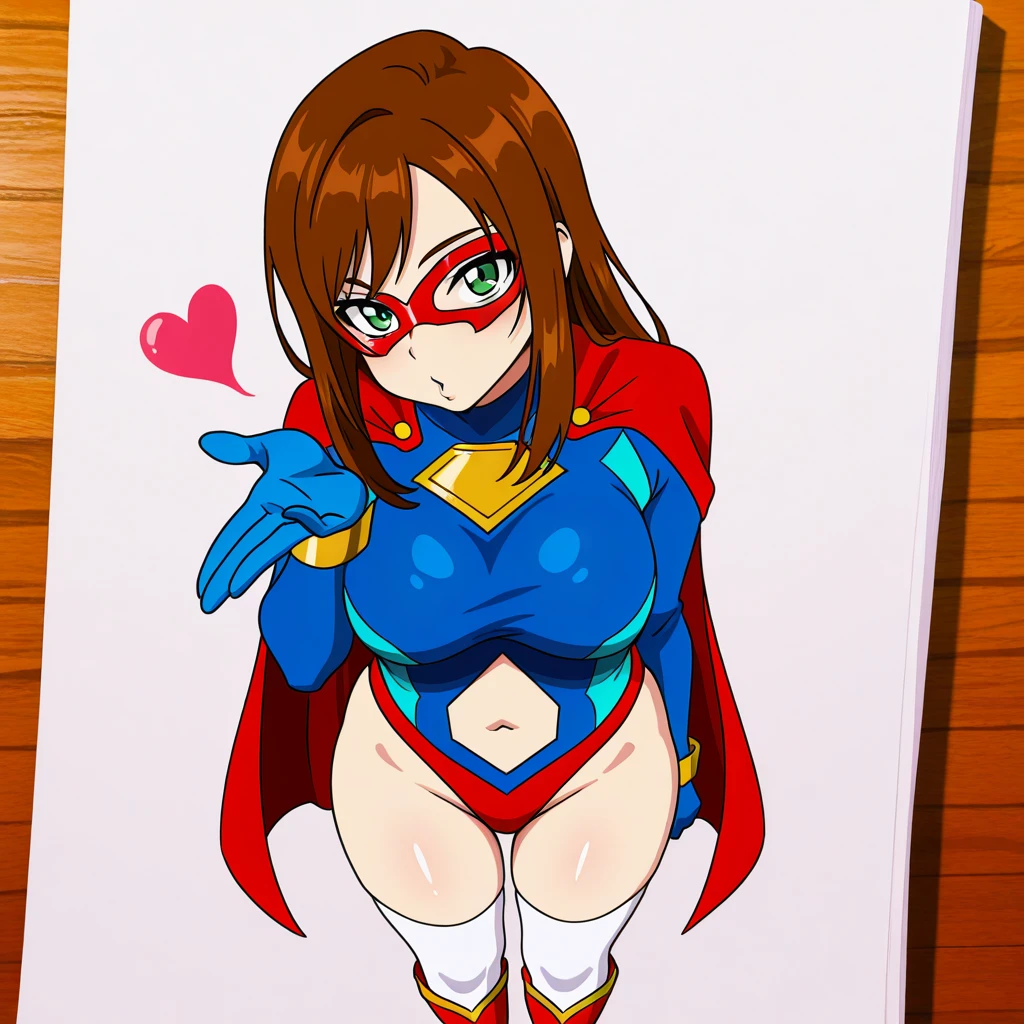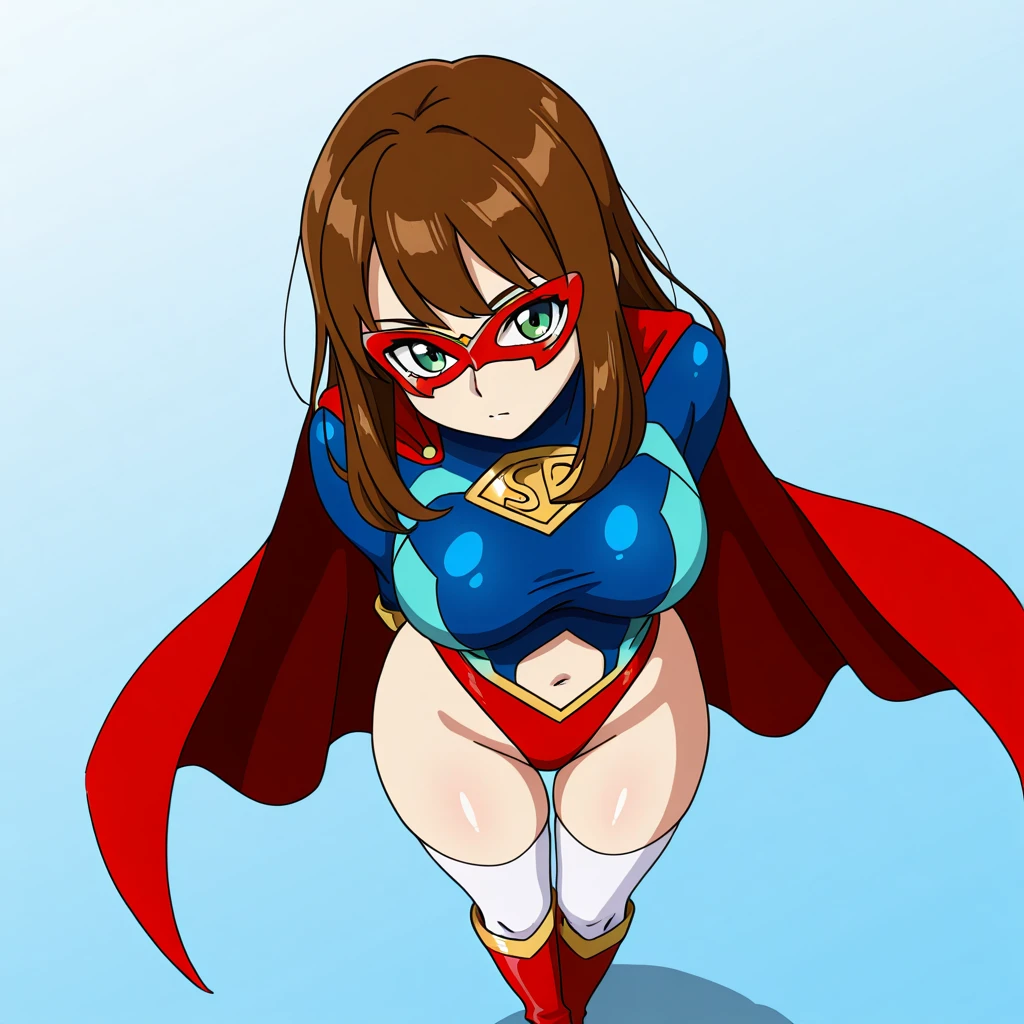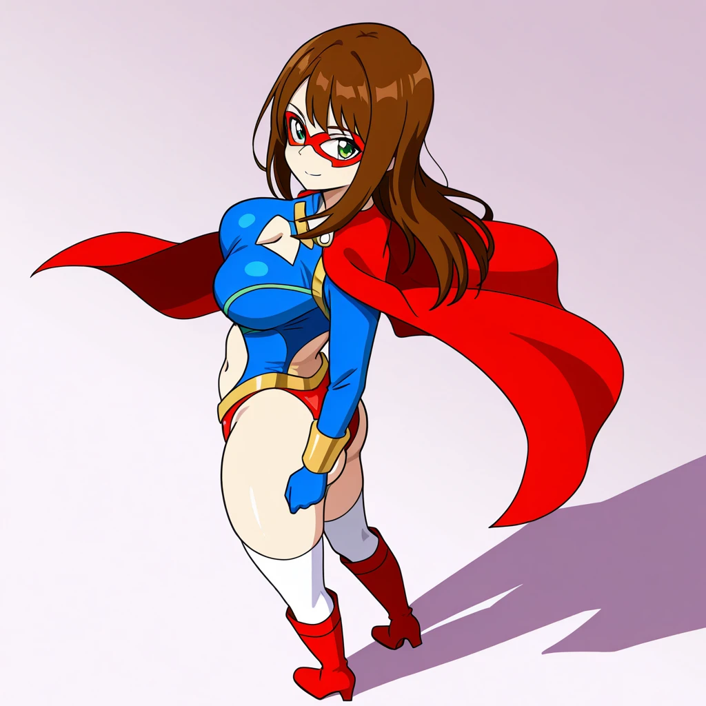 spandexer_ca, 1girl, solo, brown hair, long hair, green eyes, domino mask, large breasts, red cape, leotard, navel, clothing cutout, white thighhighs, knee boots, red footwear
