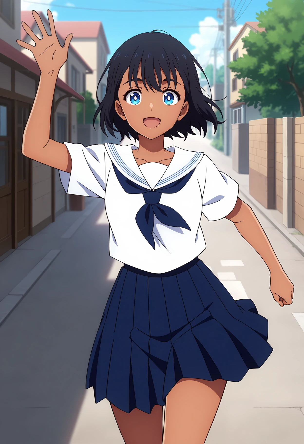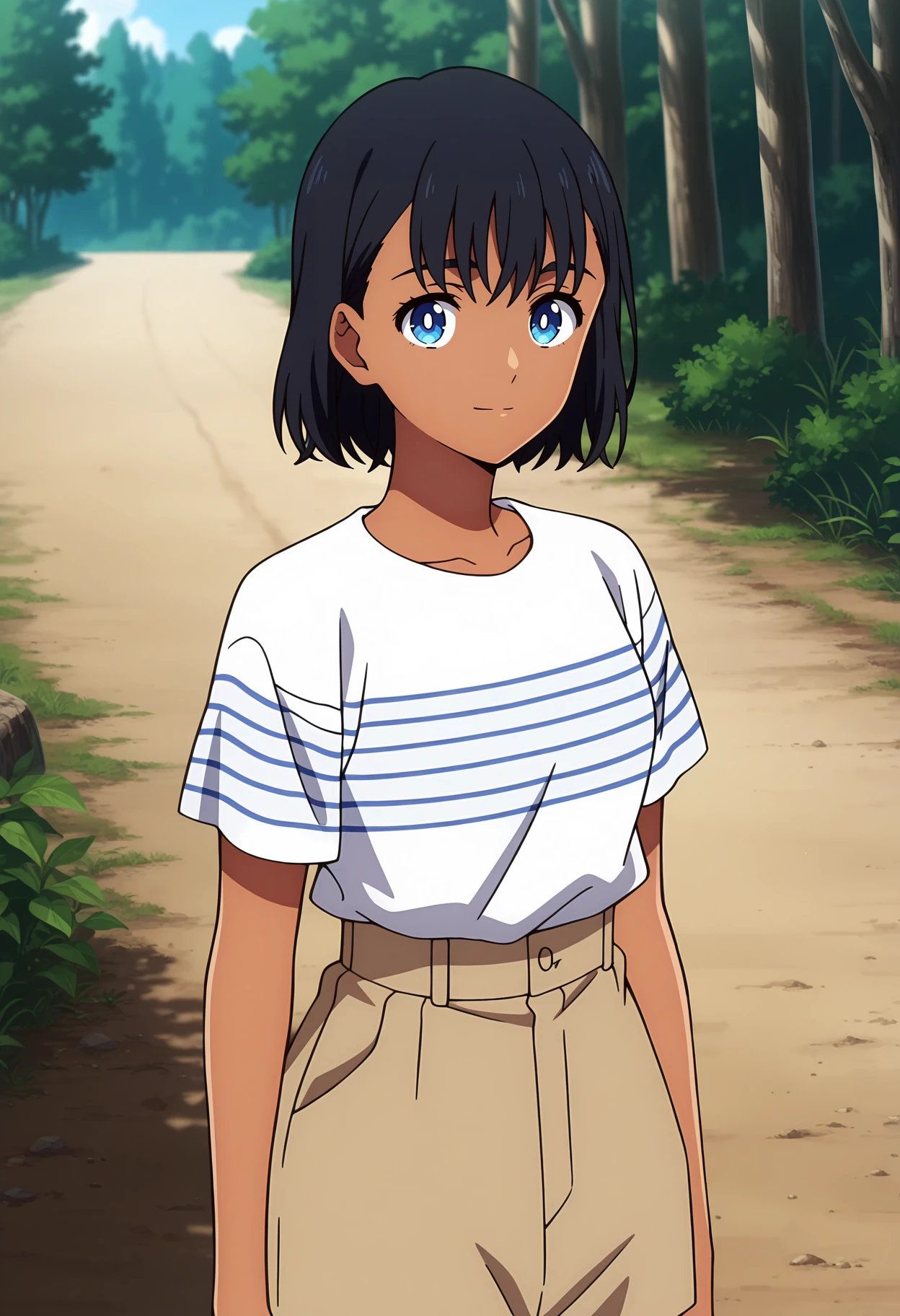dark-skinned female, short hair, black hair, blue eyes, white pupils