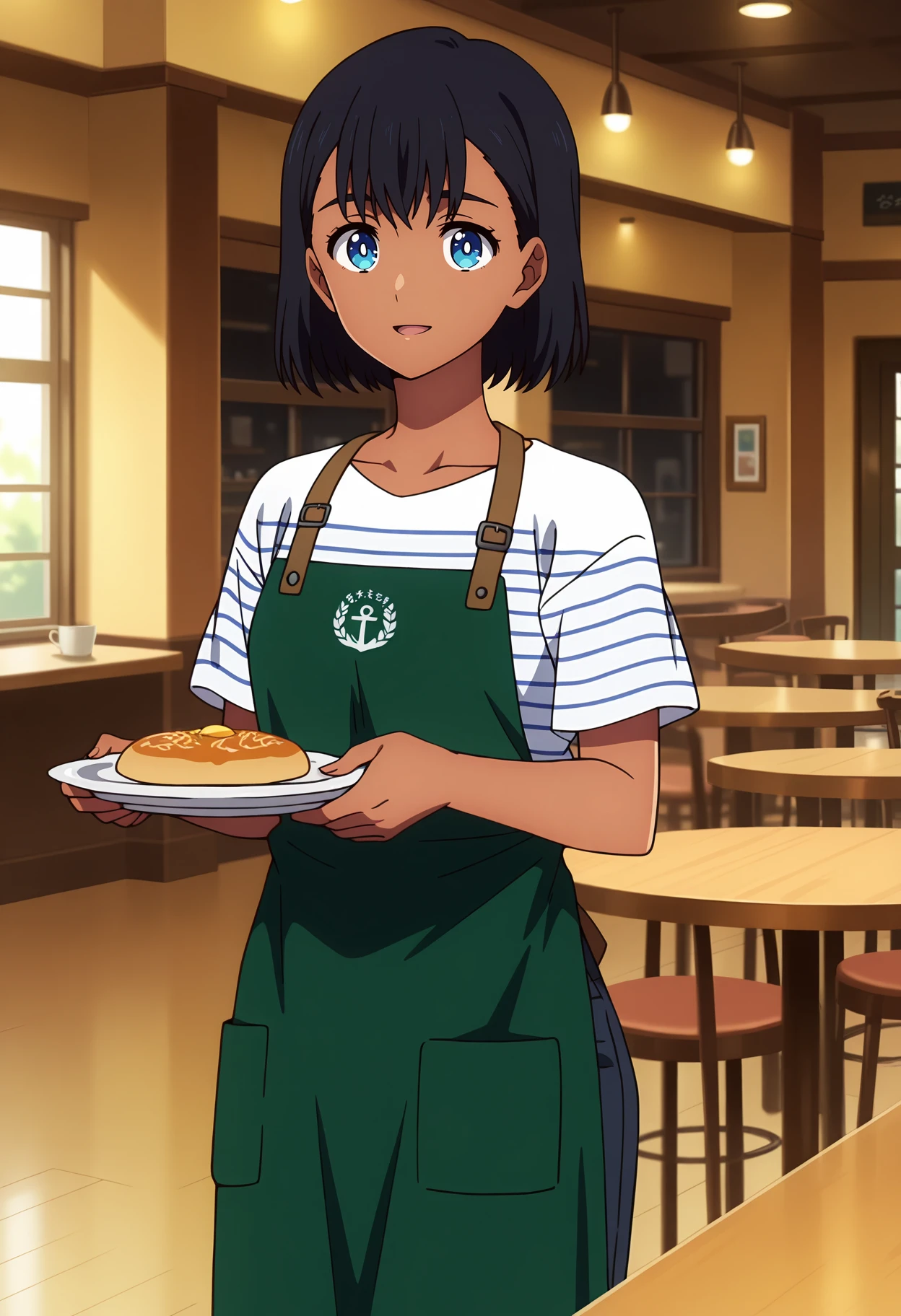 green apron, striped shirt, white shirt, short sleeves
