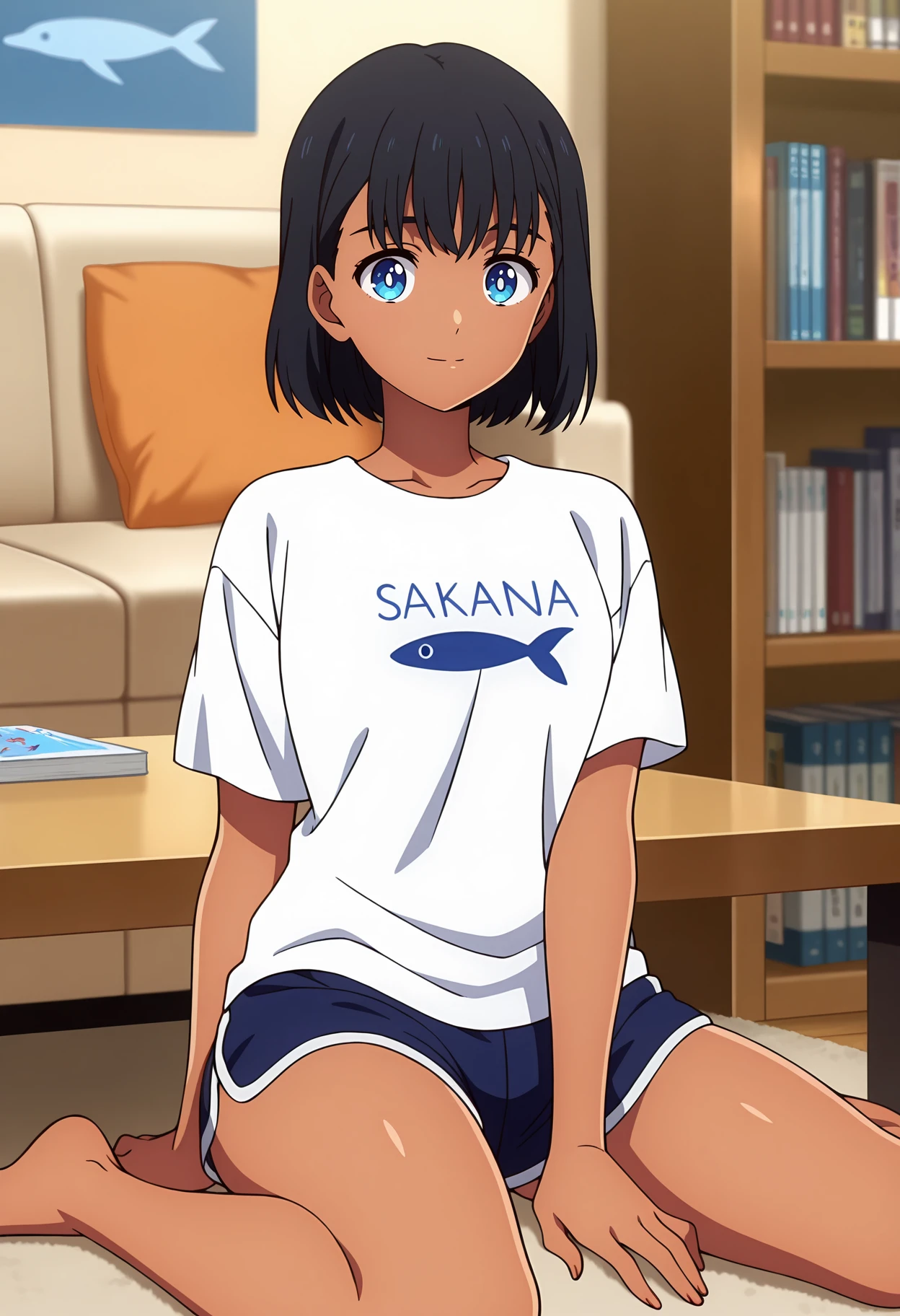 print shirt, fish print, clothes writing, white shirt, short sleeves, dolphin shorts, blue shorts