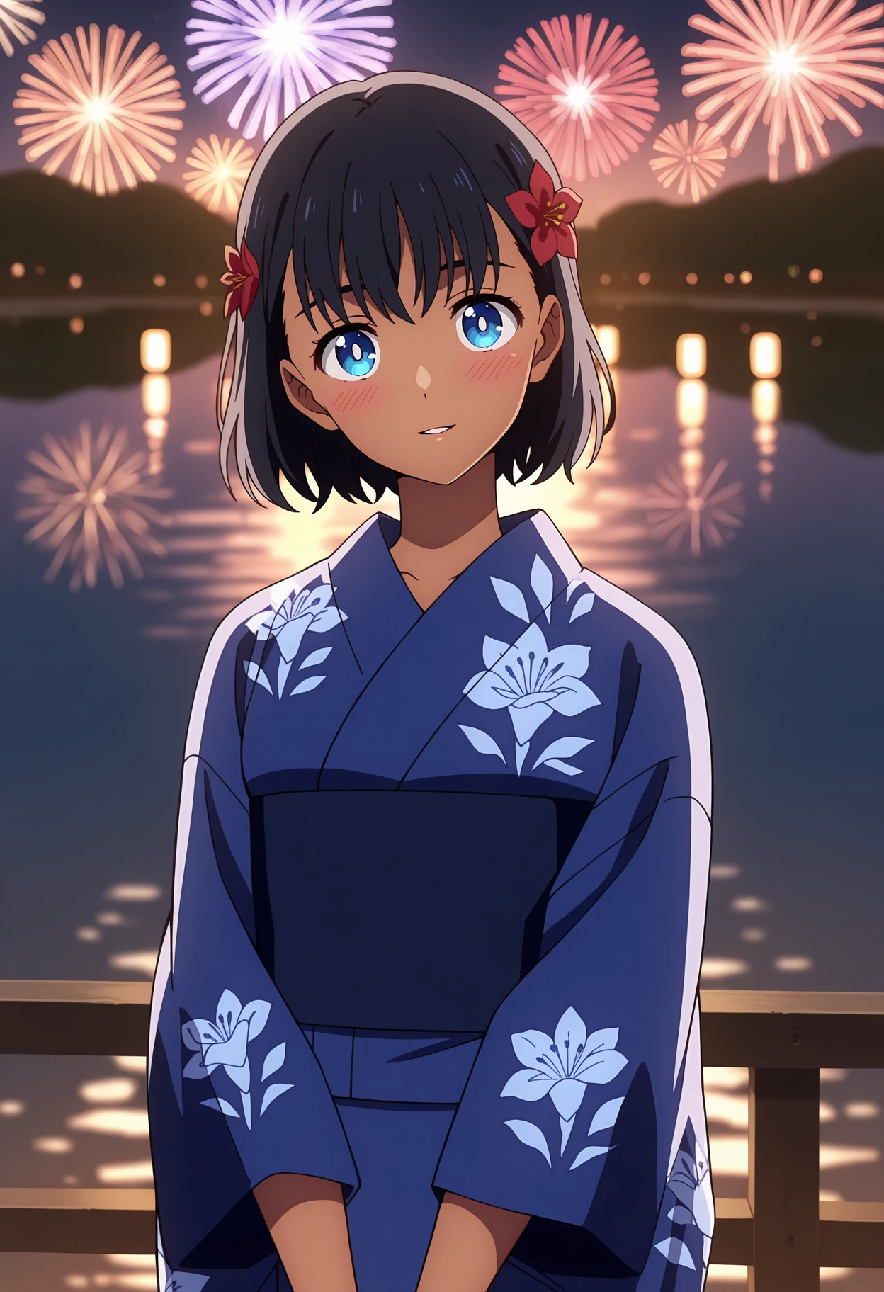 hair flower, red flower, print kimono, floral print, blue kimono, blue obi