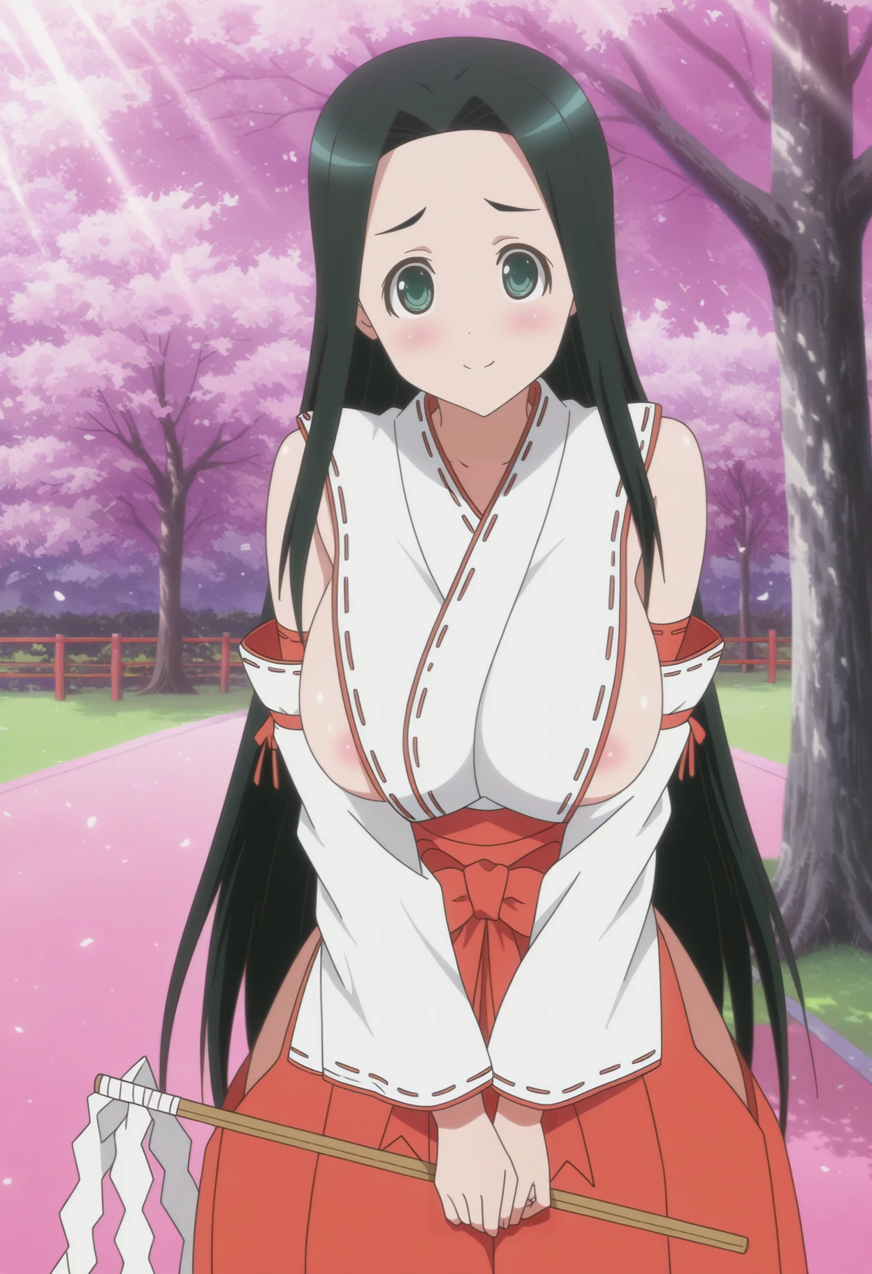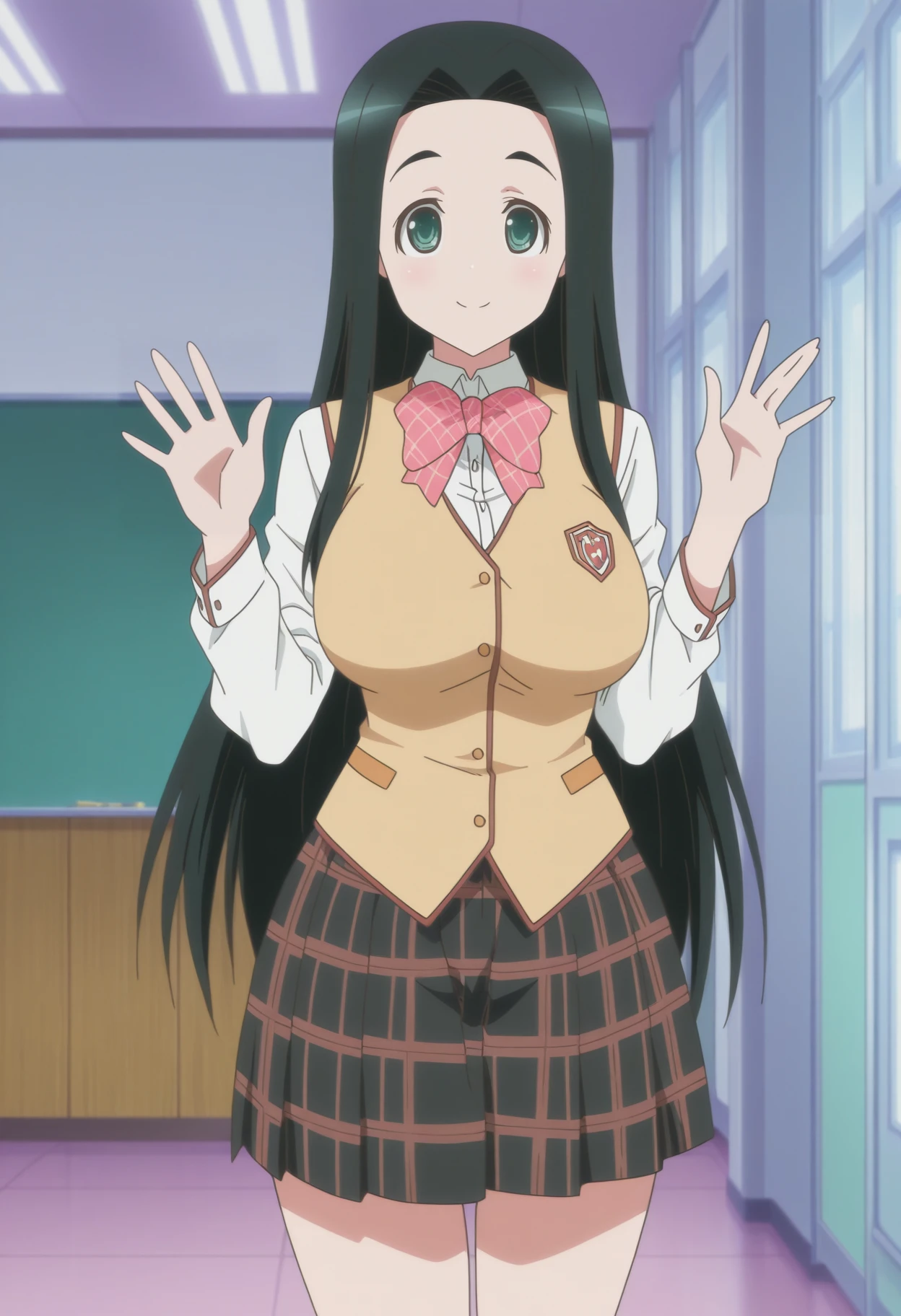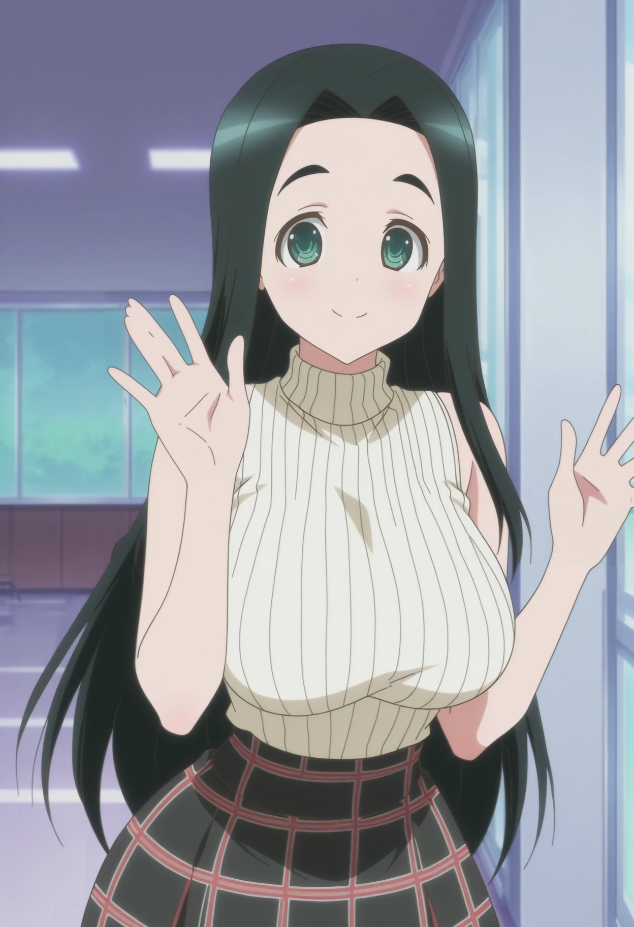 black hair, long hair, green eyes