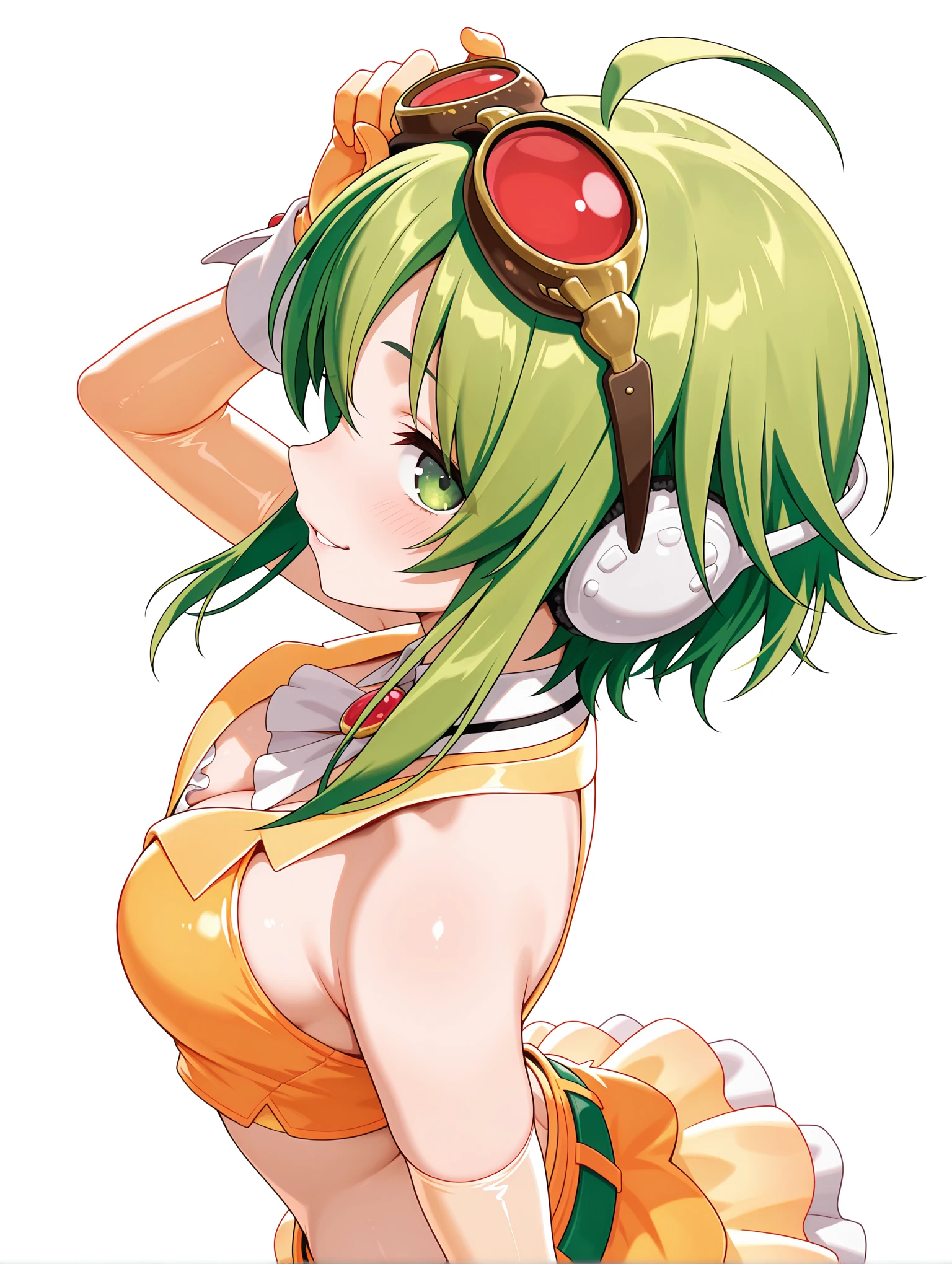 トリガーワード・m_gu_mi,ahoge,silver hair,green eyes,short hair with long locks,